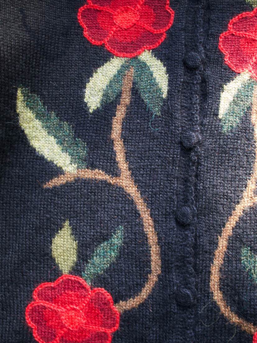Unikatowy sweter, w 100% wykonany z alpaki. Zapinany na guziki powlekane tkaniną, jest guziczek zapasowy.