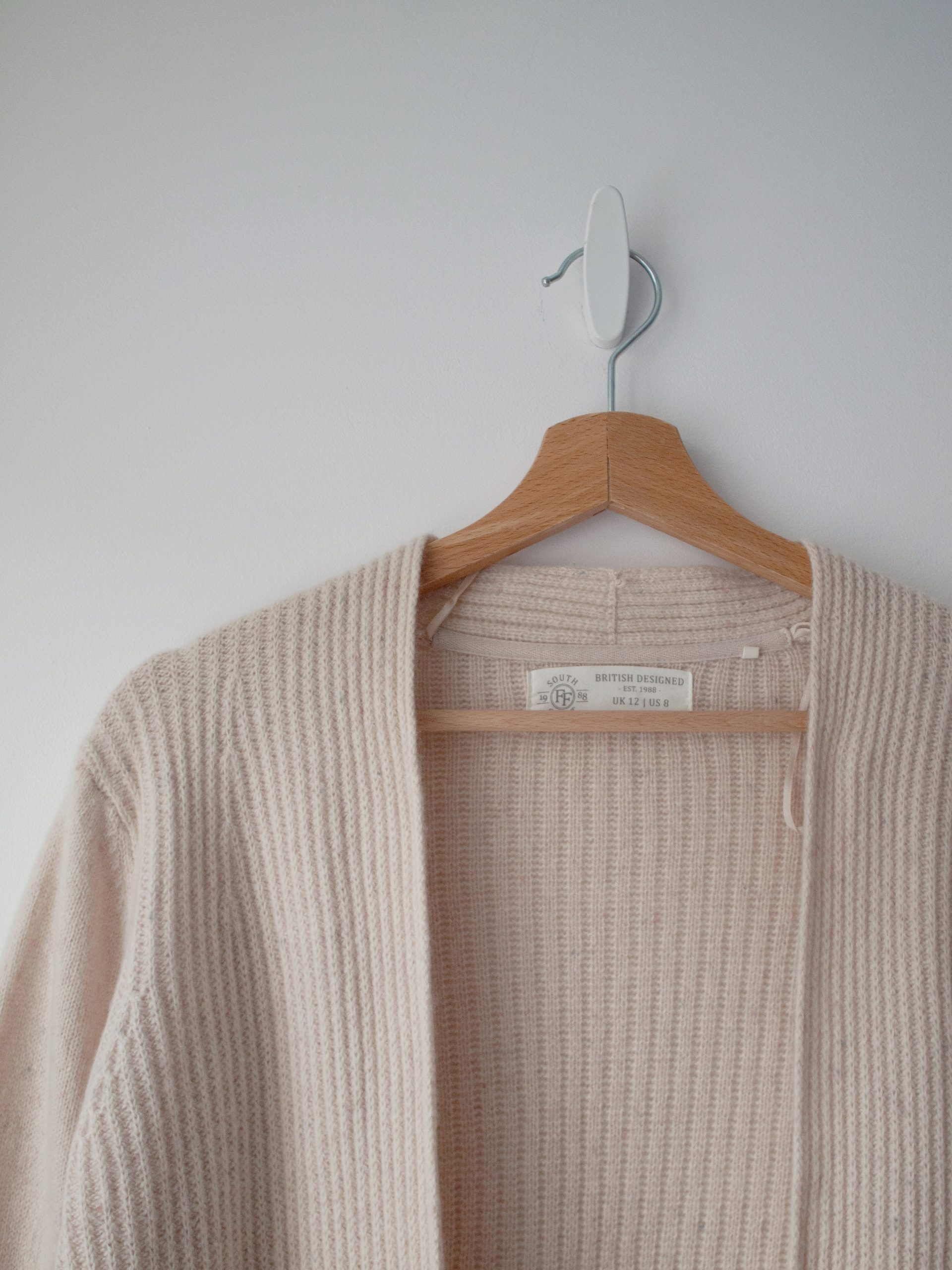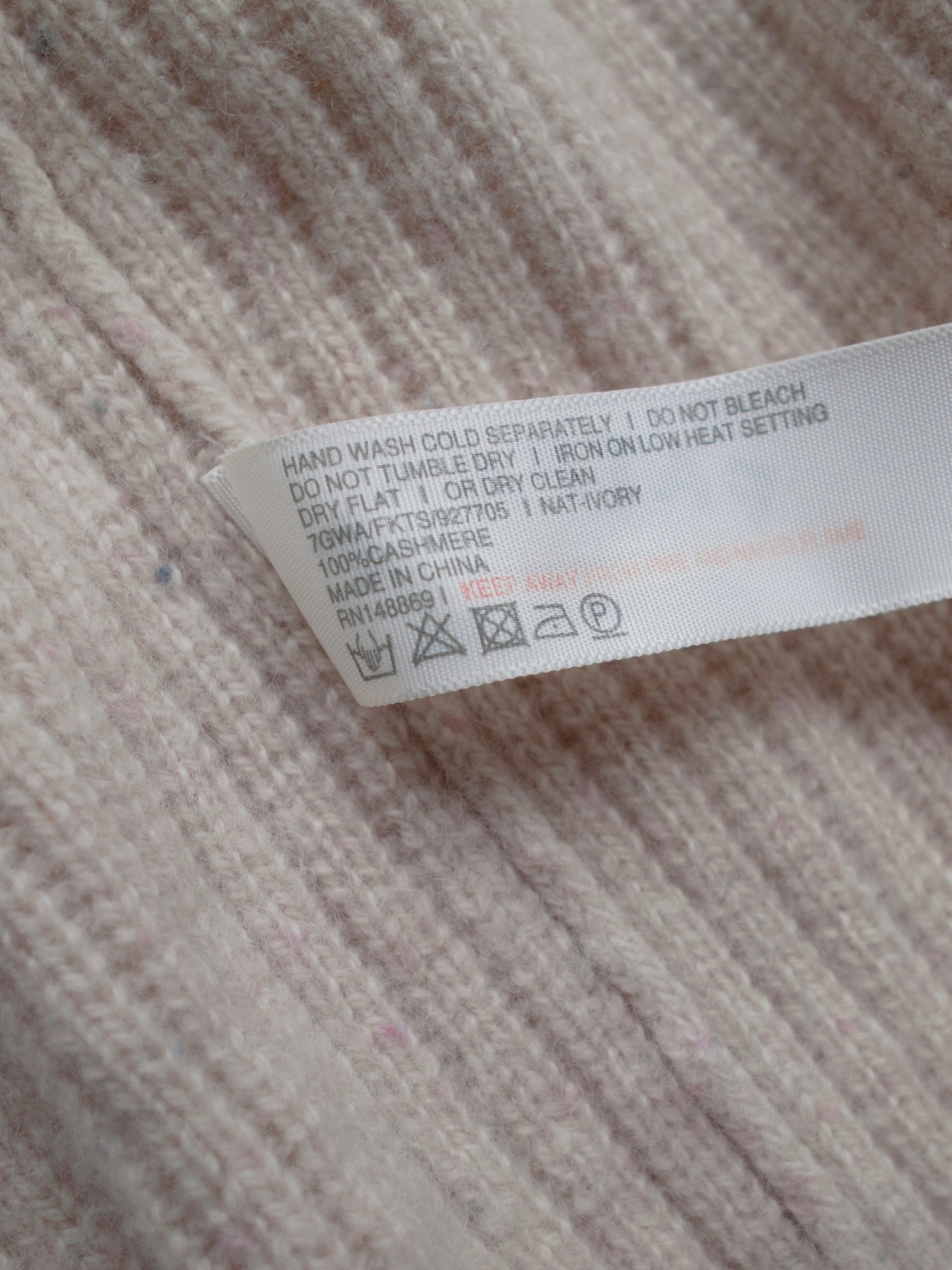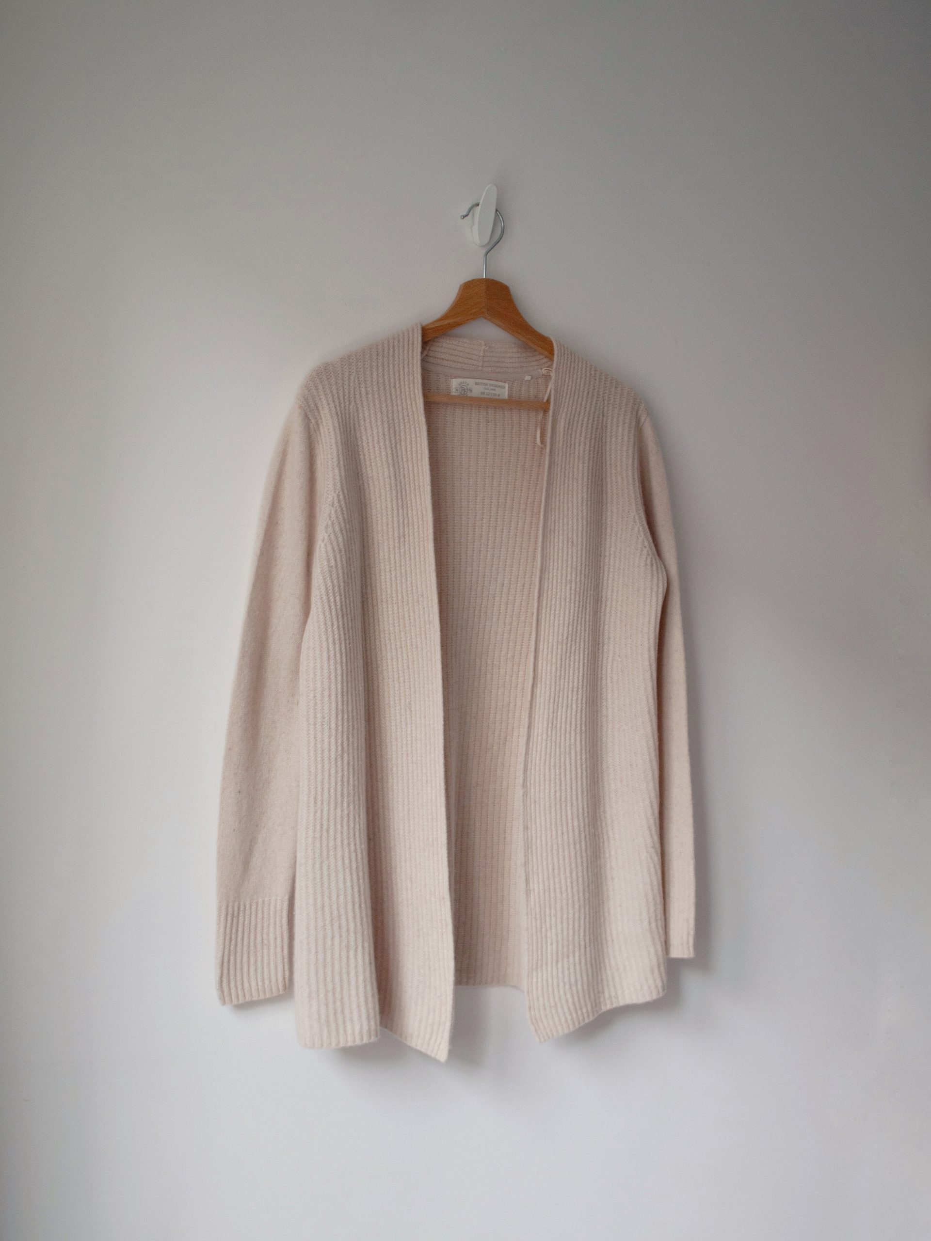 Beżowa narzutka, w 100% wykonana z kaszmiru. Rozmiar z metki: 12 Skład: kaszmir Stan: bez wad Szerokość w klatce 46 cm Długość całkowita 75 cm