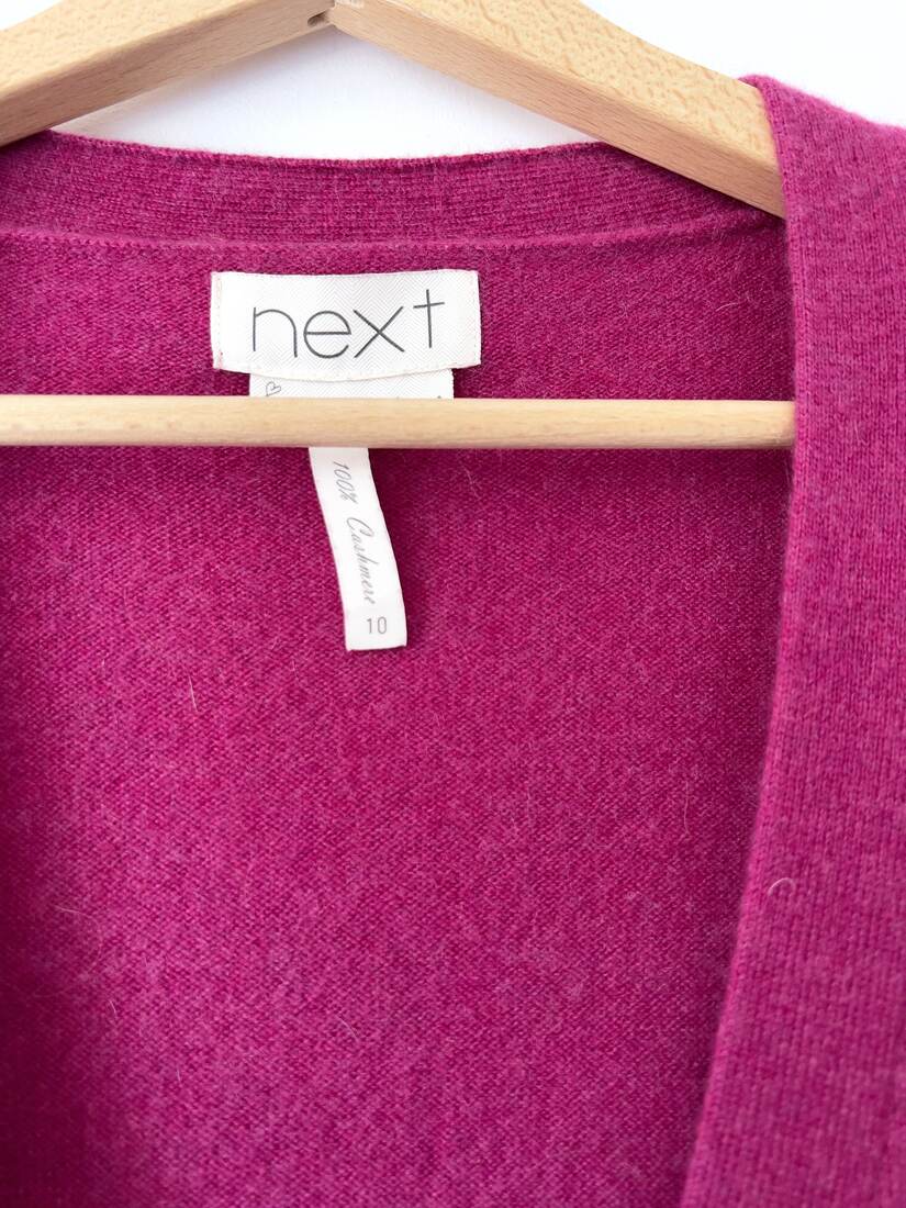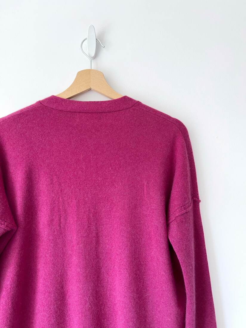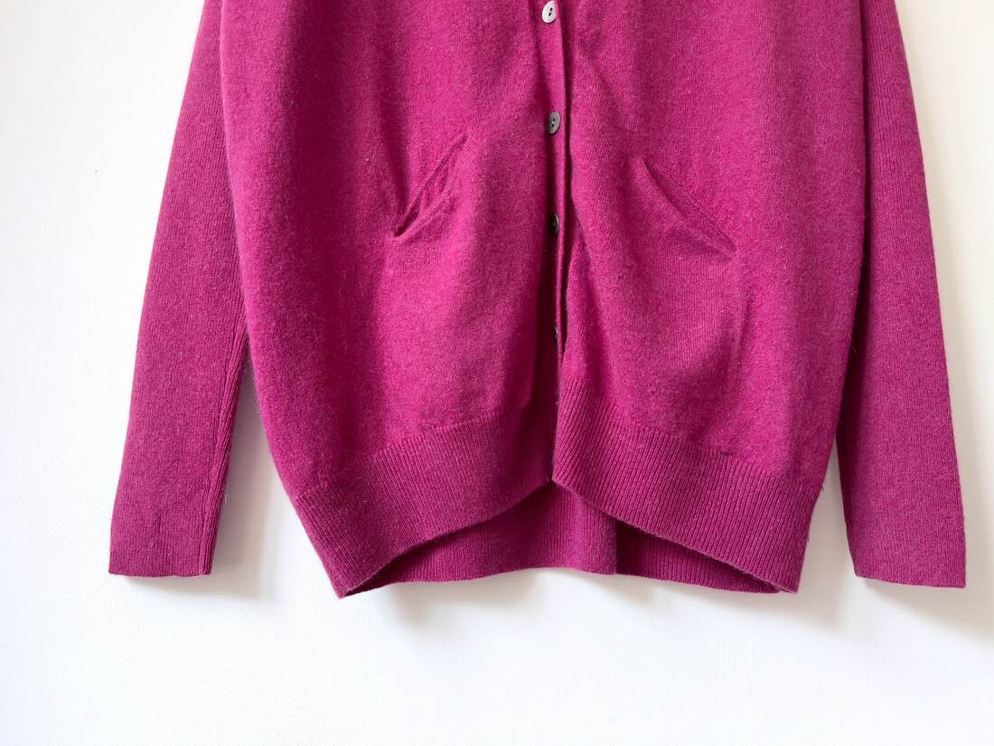Klasyczny sweter M&S z dekoltem w serek. Skład to 100% kaszmir, bardzo dobry stan, jest minimalnie sfilcowany, nie jest to zauważalne, po prostu jest trochę sztywniejszy.