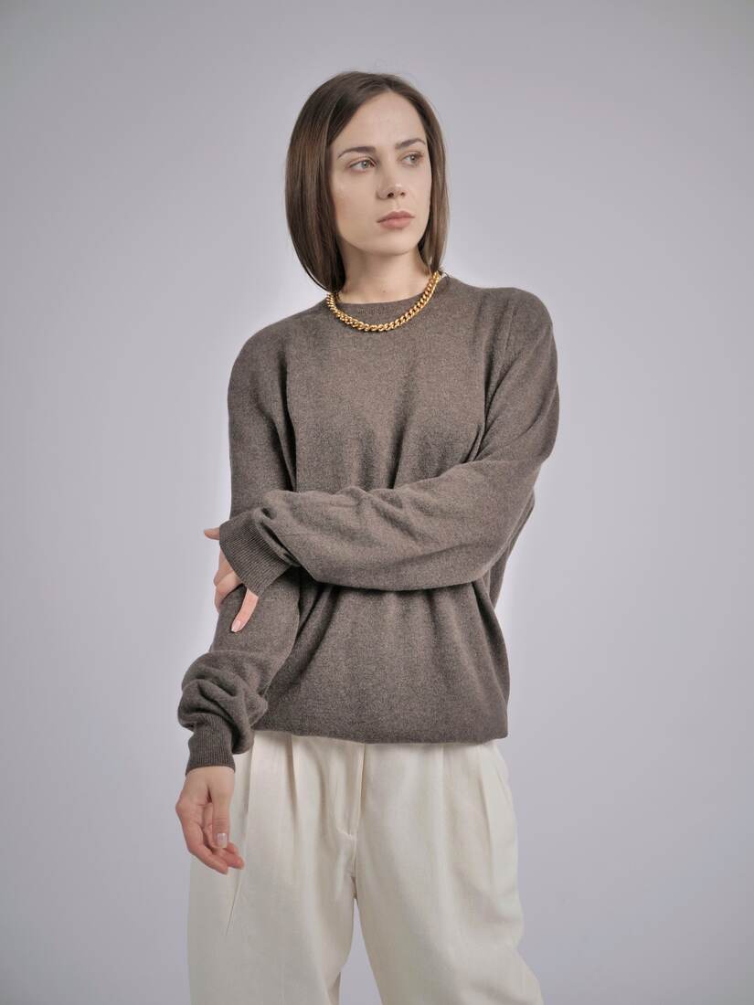 Minimalistyczny kaszmirowy sweter o pudełkowym kroju. Sweter bardzo miękki i przyjemny, ma dwie małe zacerowane dziurki, nie widoczne w noszeniu, poza tym brak mankamentów. Wymiary poniżej.