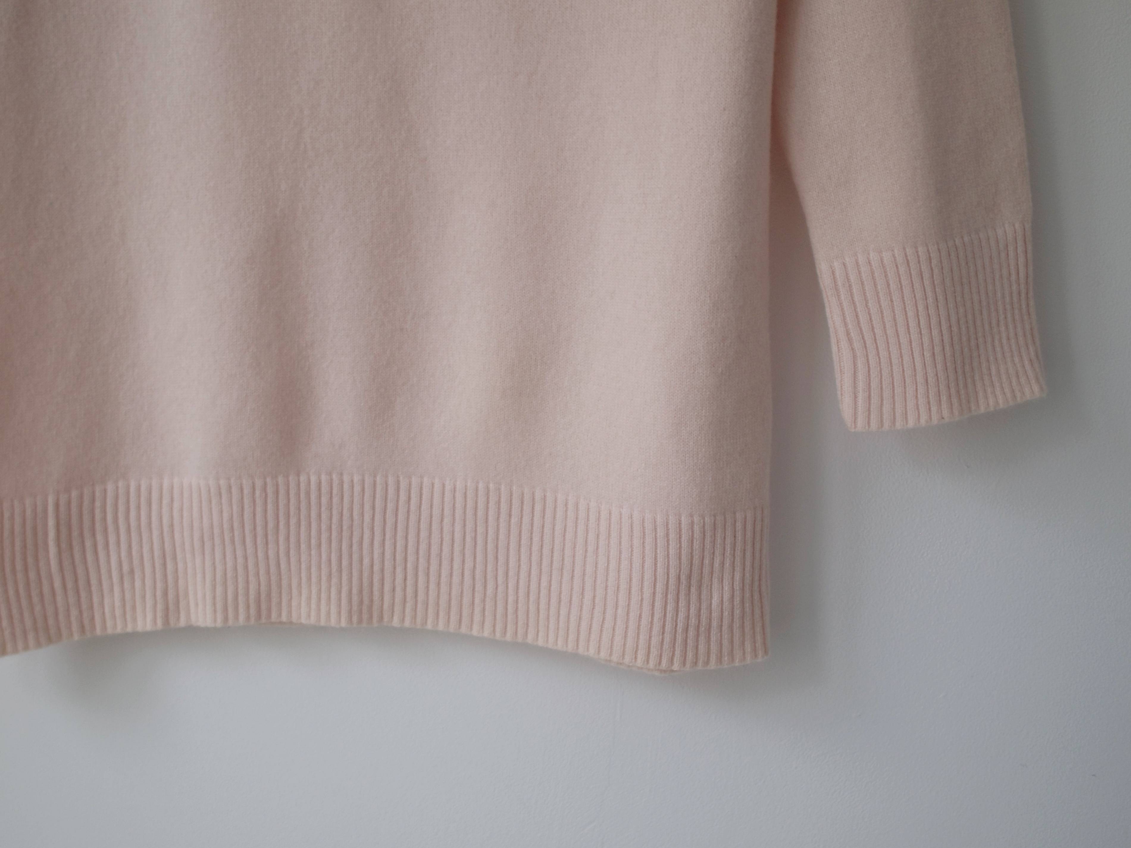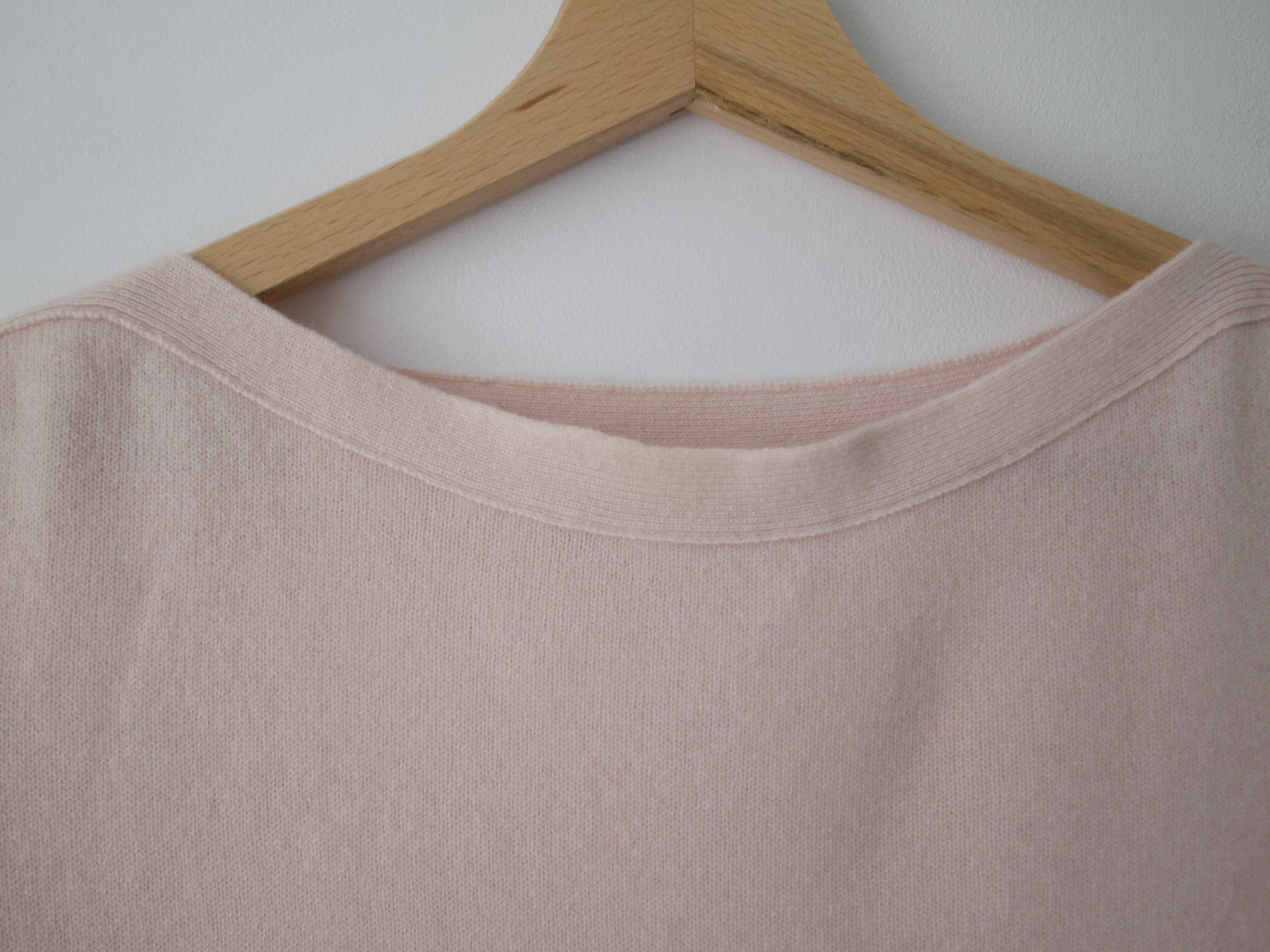 Kaszmirowy sweter w kolorze pudrowego różu. Przy dekolcie ma przebarwienie, pokazane w zbliżeniu, mało widoczne. Poza tym bez wad.
