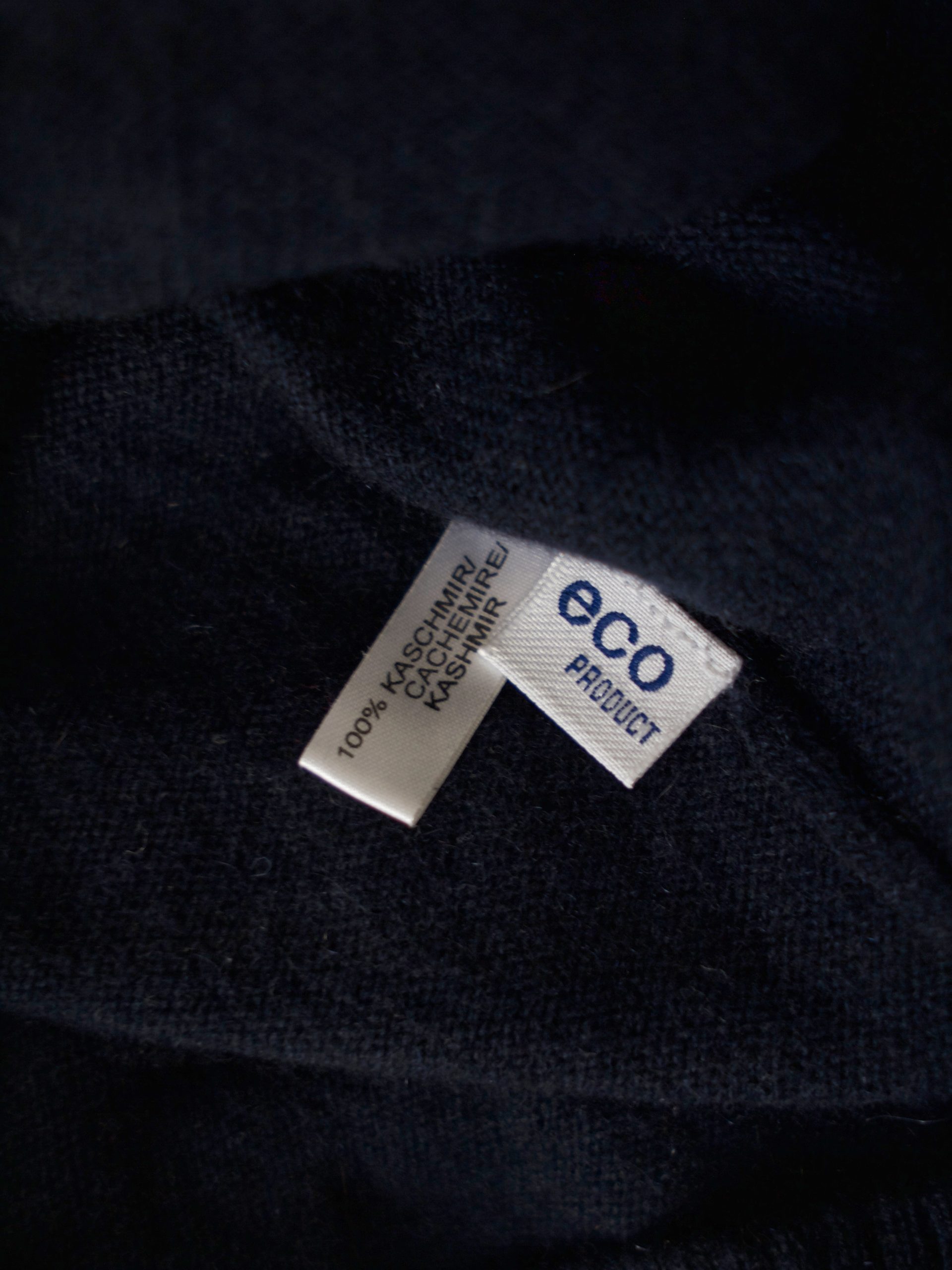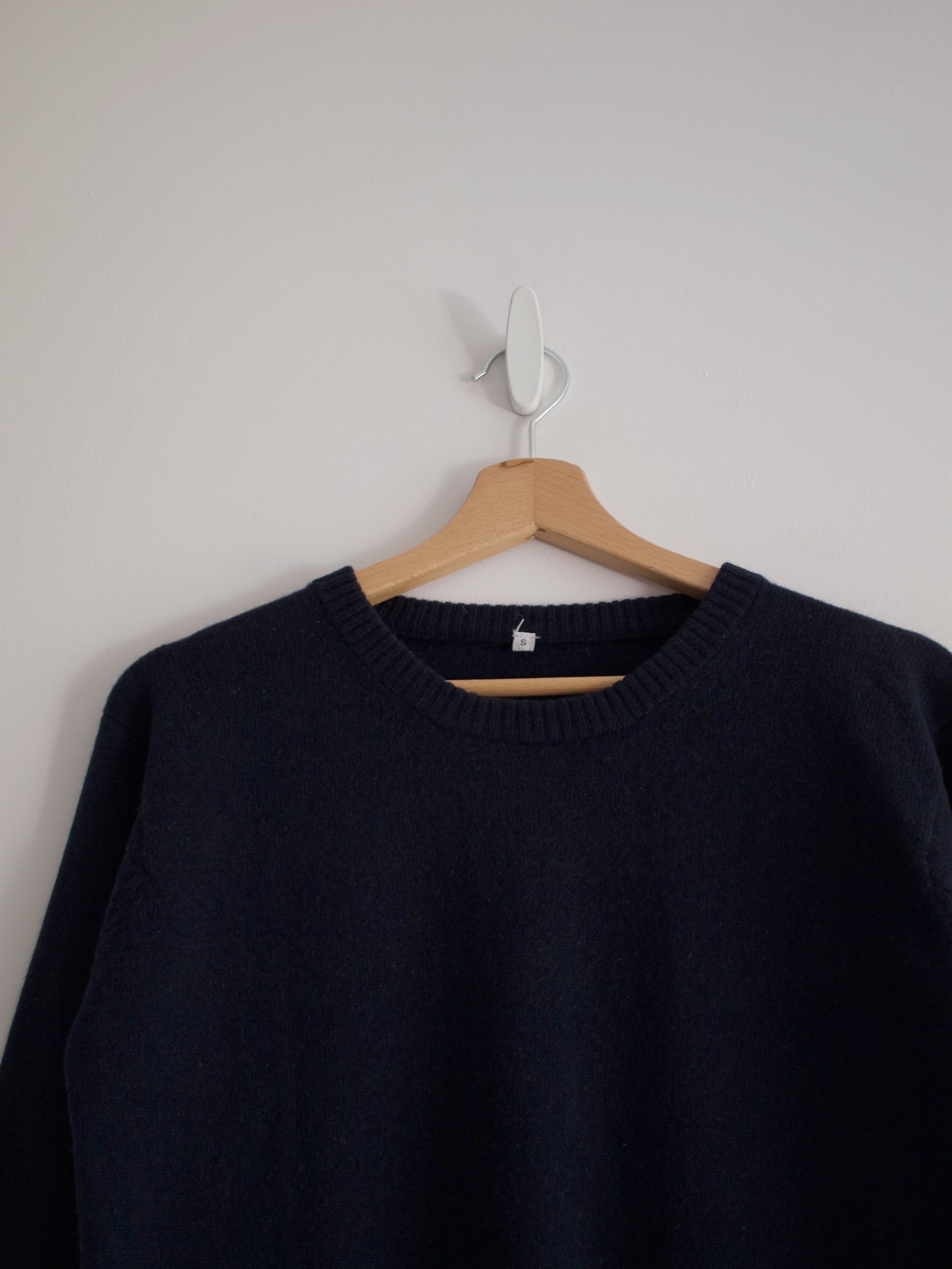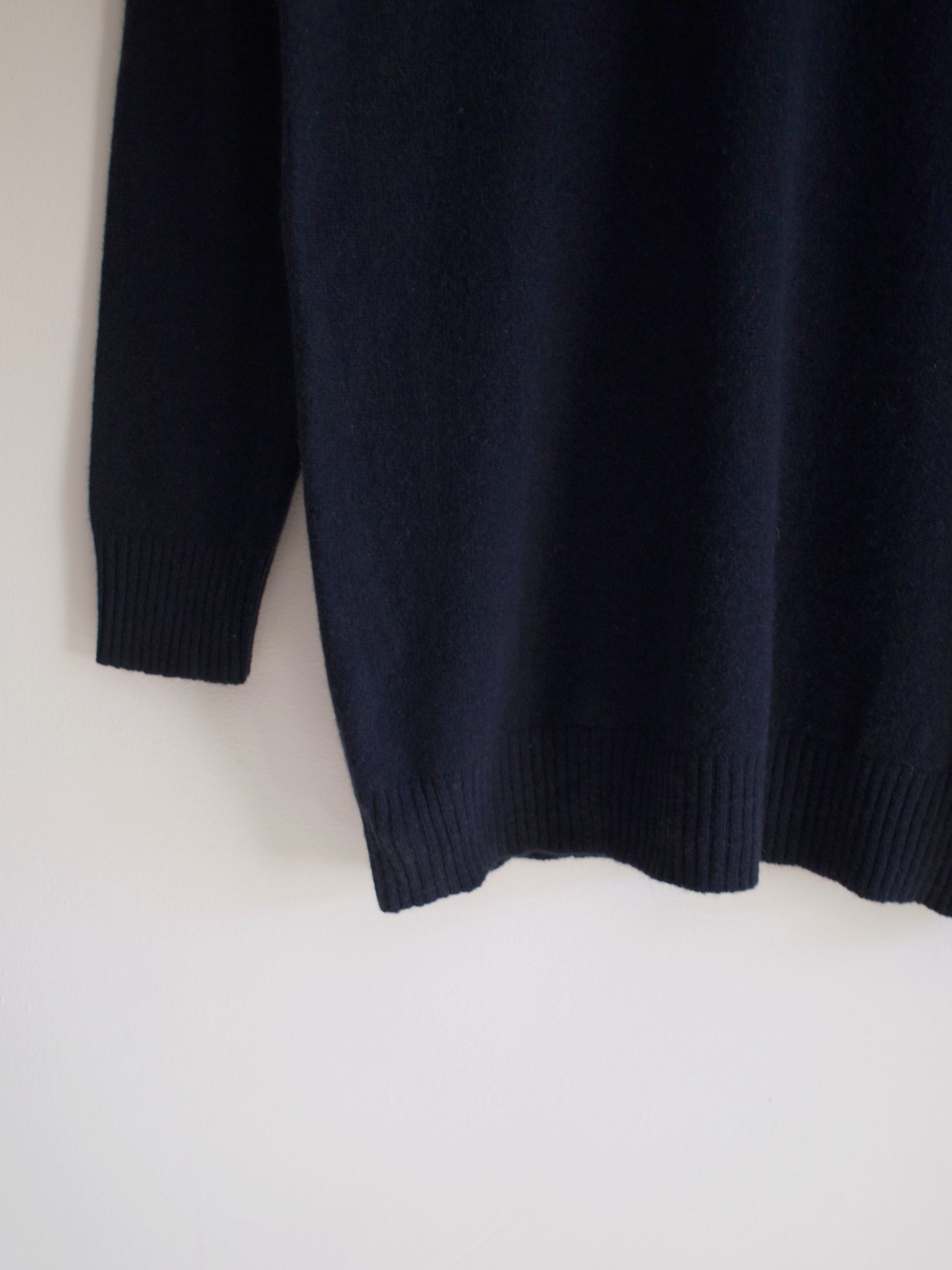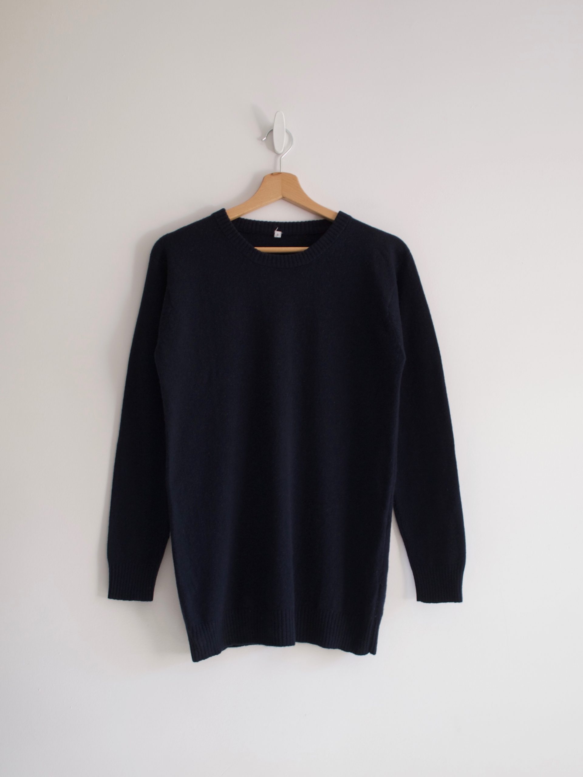 Granatowy sweter z kaszmiru. Rozmiar z metki: S, prawdopodobnie męski Skład: 100% kaszmir Stan: bez wad Szerokość w klatce 46 cm Długośćcałkowita 69 cm