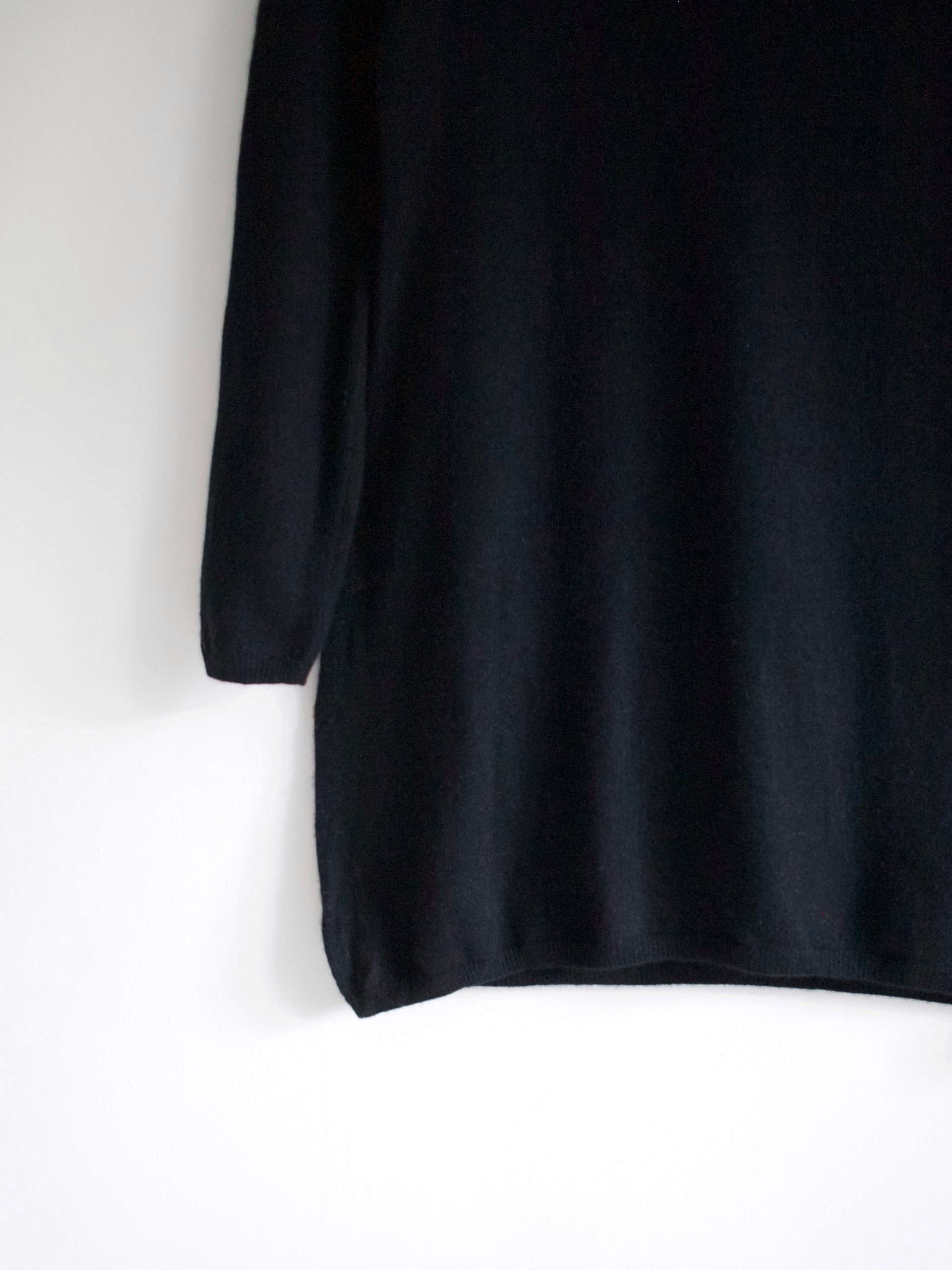 Minimalistyczny kaszmirowy sweter o pudełkowym kroju. Sweter bardzo miękki i przyjemny, ma dwie małe zacerowane dziurki, nie widoczne w noszeniu, poza tym brak mankamentów. Wymiary poniżej.
