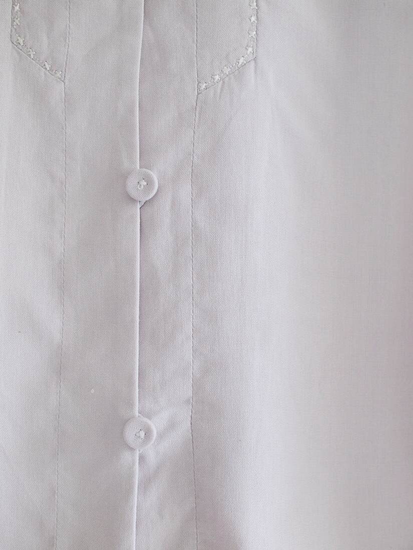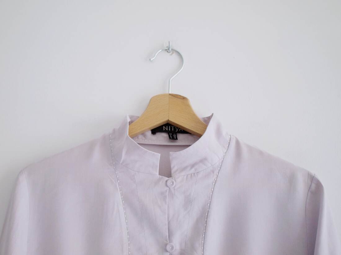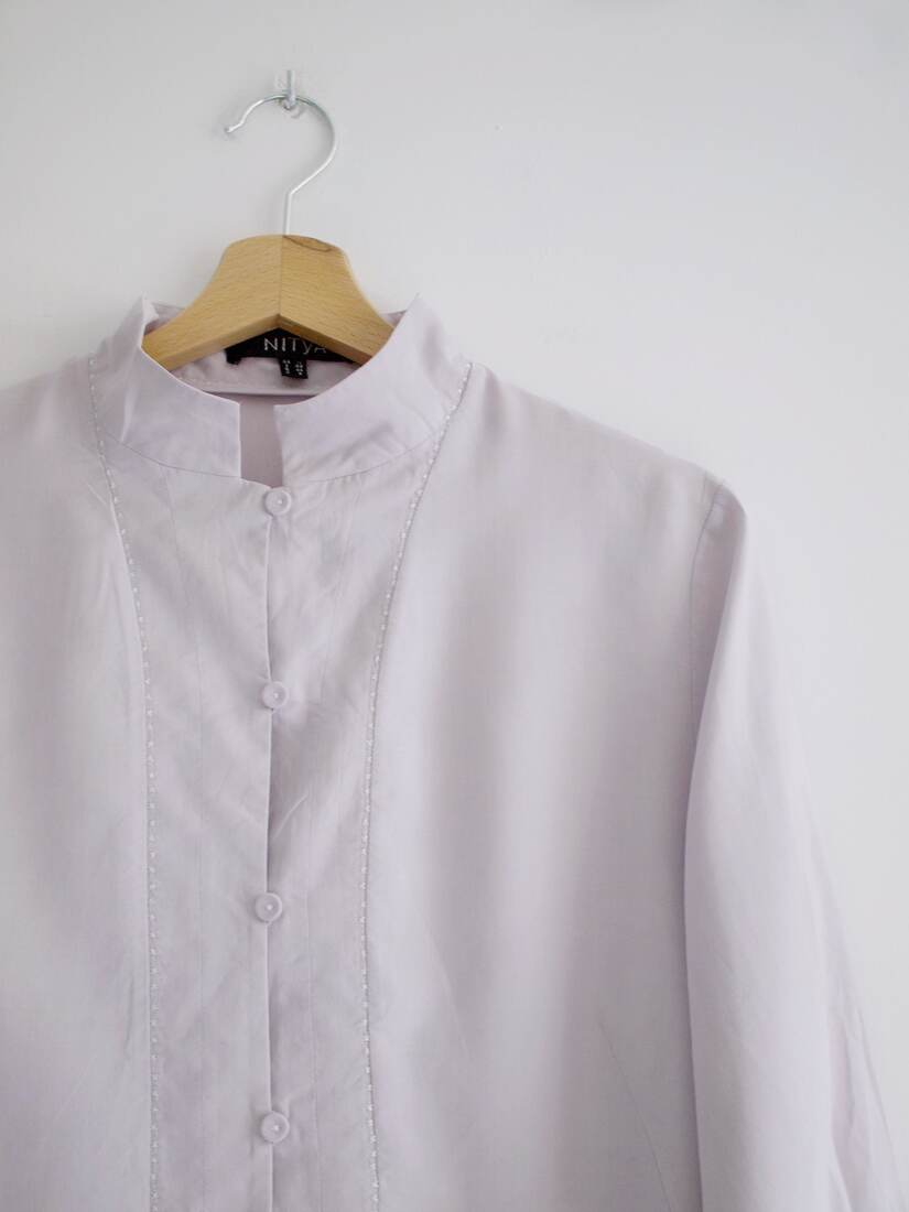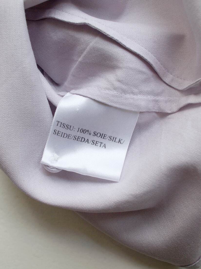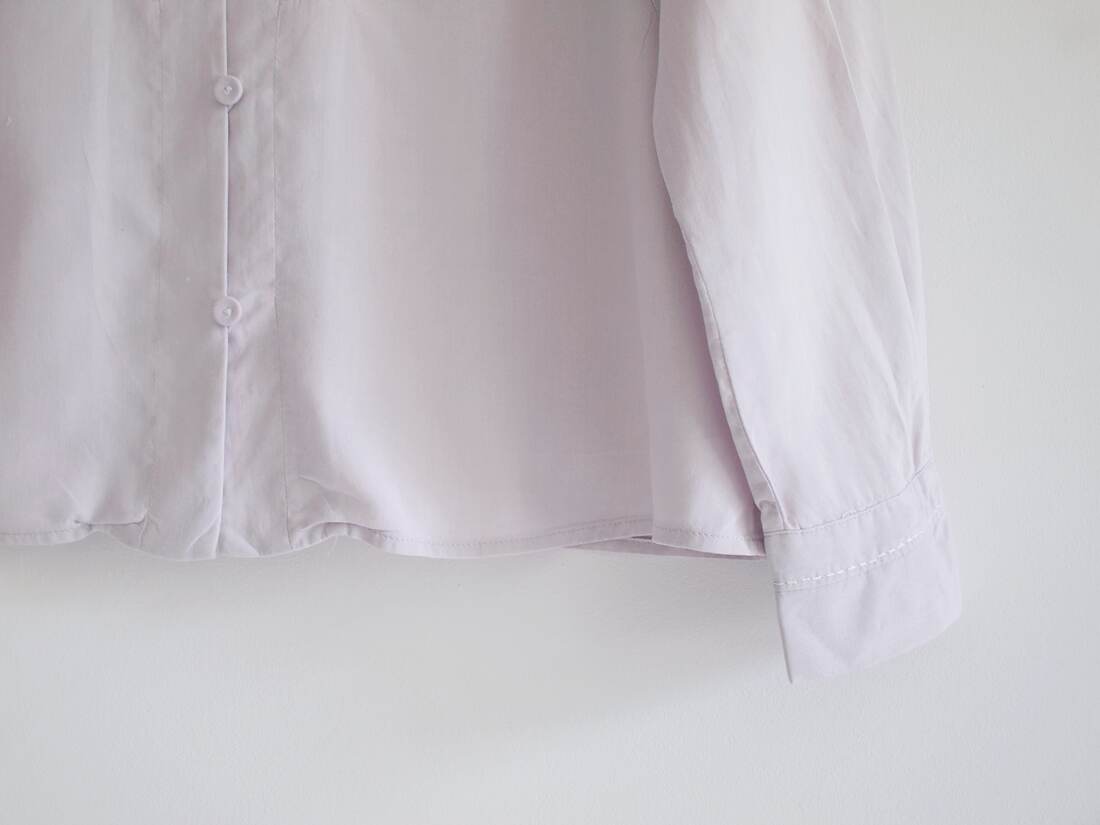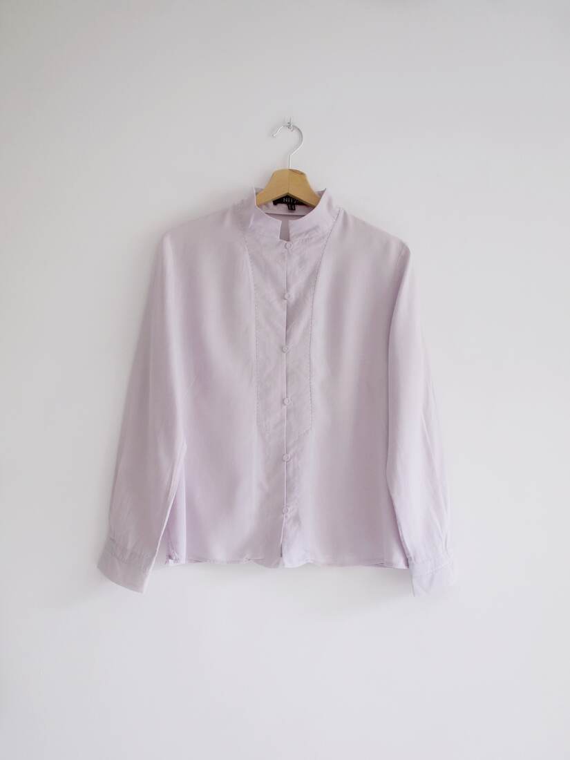 Koszula vintage w jasnym liliowym kolorze. W 100% wykonana z matowego jedwabiu, zapinana na guziki powlekane jedwabną tkaniną. Rozmiar z metki 38, bardzo dobry stan.