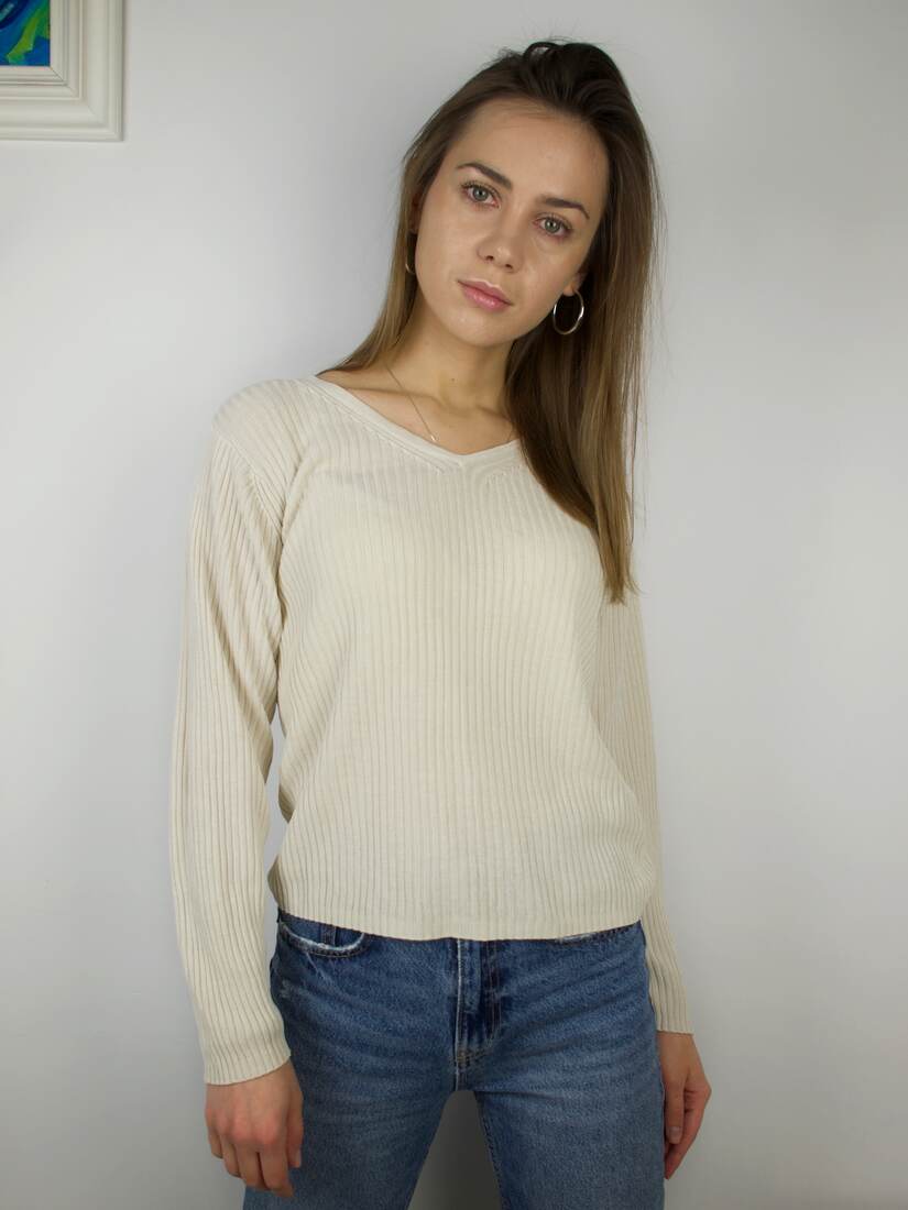 Klasyczny sweter M&S z dekoltem w serek. Skład to 100% kaszmir, bardzo dobry stan, jest minimalnie sfilcowany, nie jest to zauważalne, po prostu jest trochę sztywniejszy.