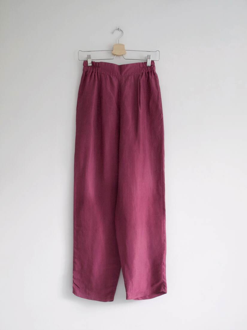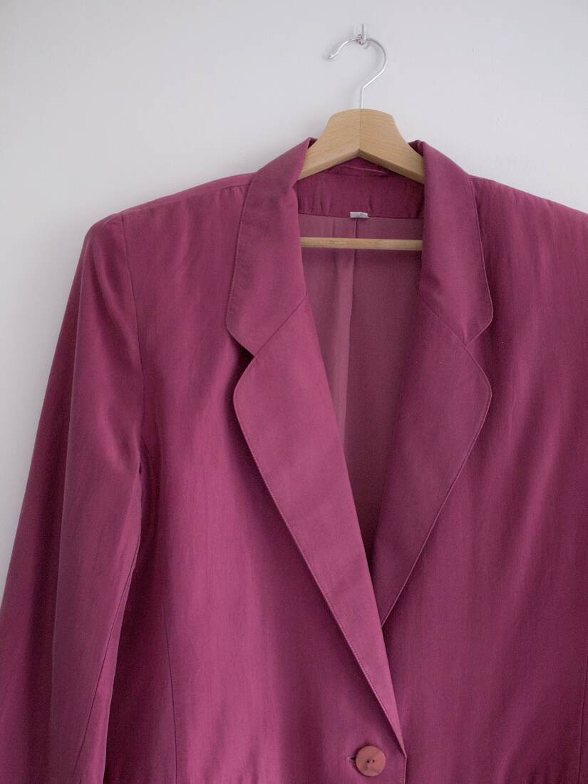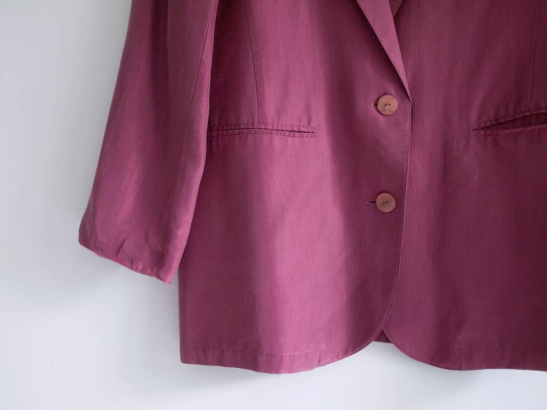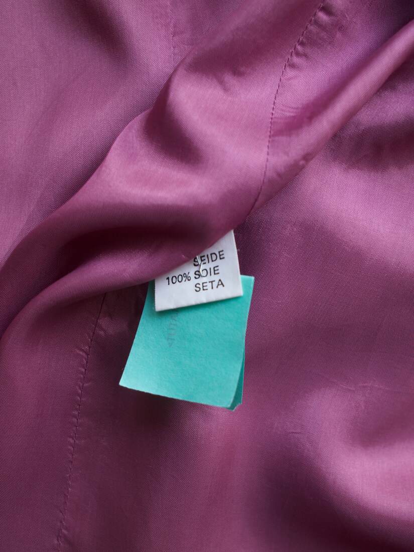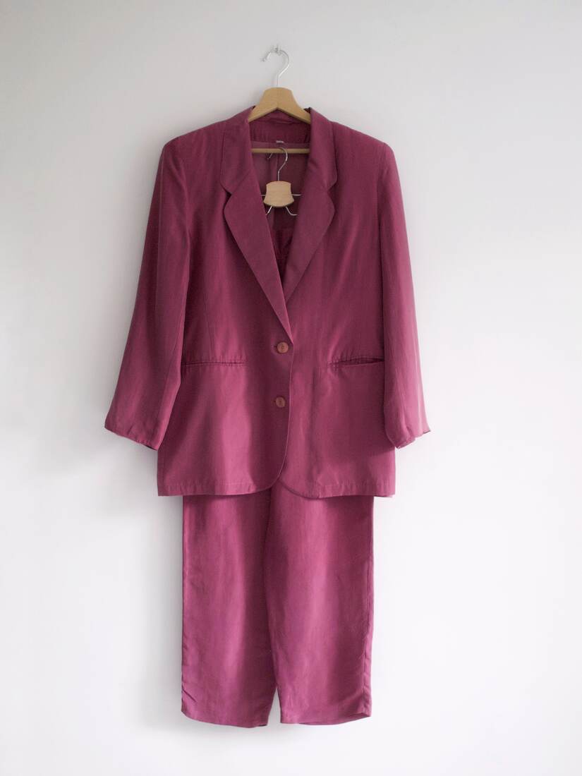 Zestaw spodni i marynarka, w 100% wykonany z jedwabiu. Marynarka o prostym kroju, z podszewką, z poduszkami w ramionach. Rozmiar z metki 36, jest dość luźna, będzie pasować również na większe. Spodnie są w rozmiarze M, z gumką w pasie, z kieszeniami. Można zaprasować na kant. Bez wad, po czyszczeniu chemicznym.