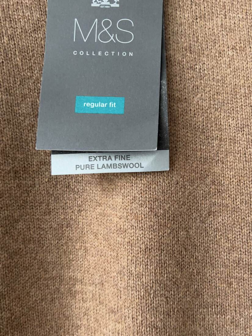 Sweter marki Marks&Spencer w kolorze ciepłego beżu. W 100% wykonany z wełny jagnięcej. Rozmiar z metki L, nowy z metkami.