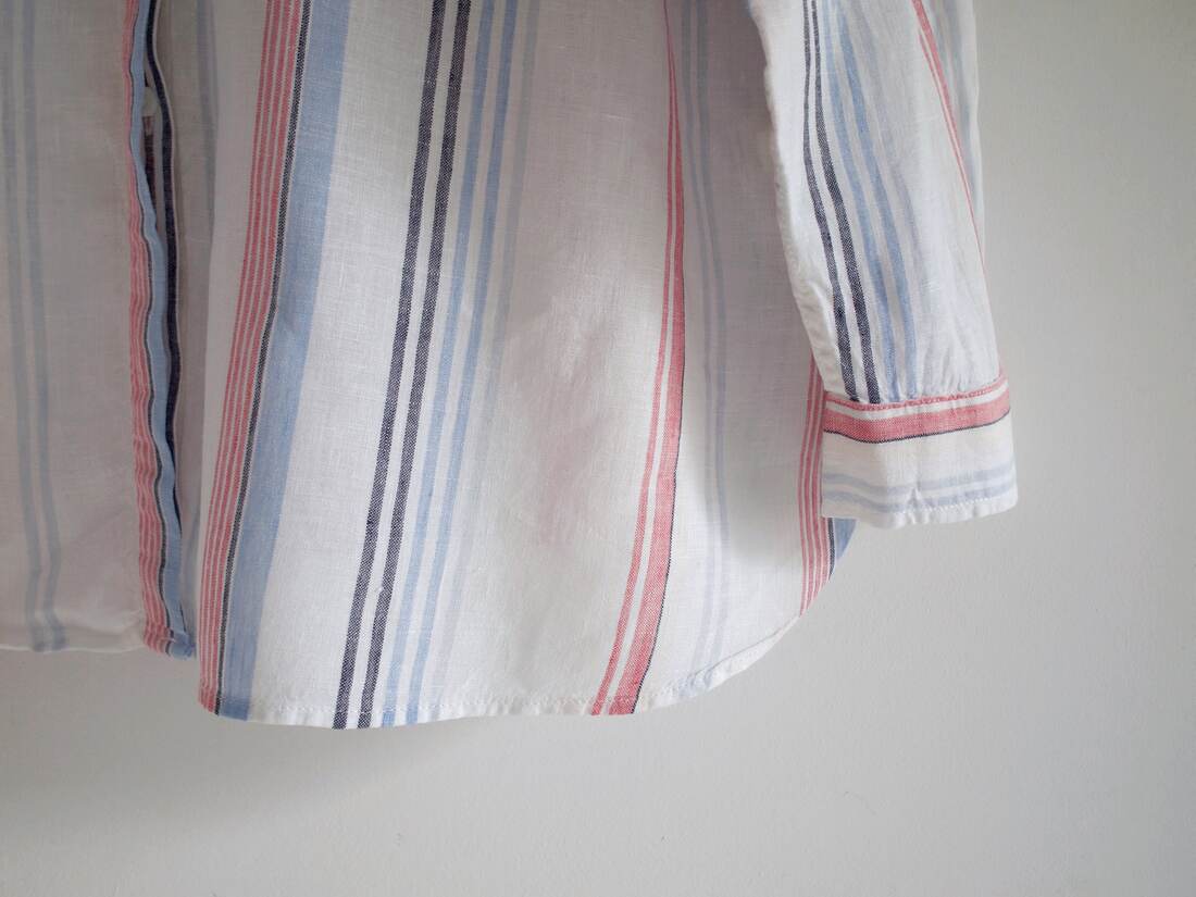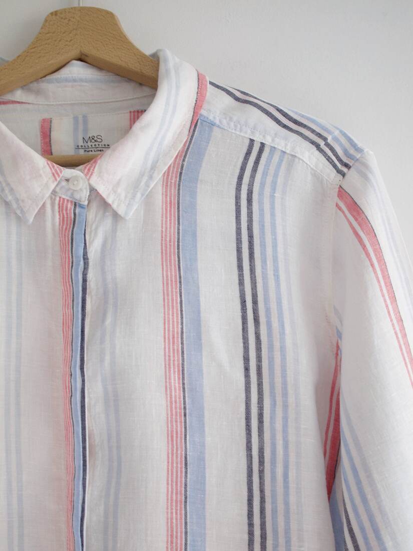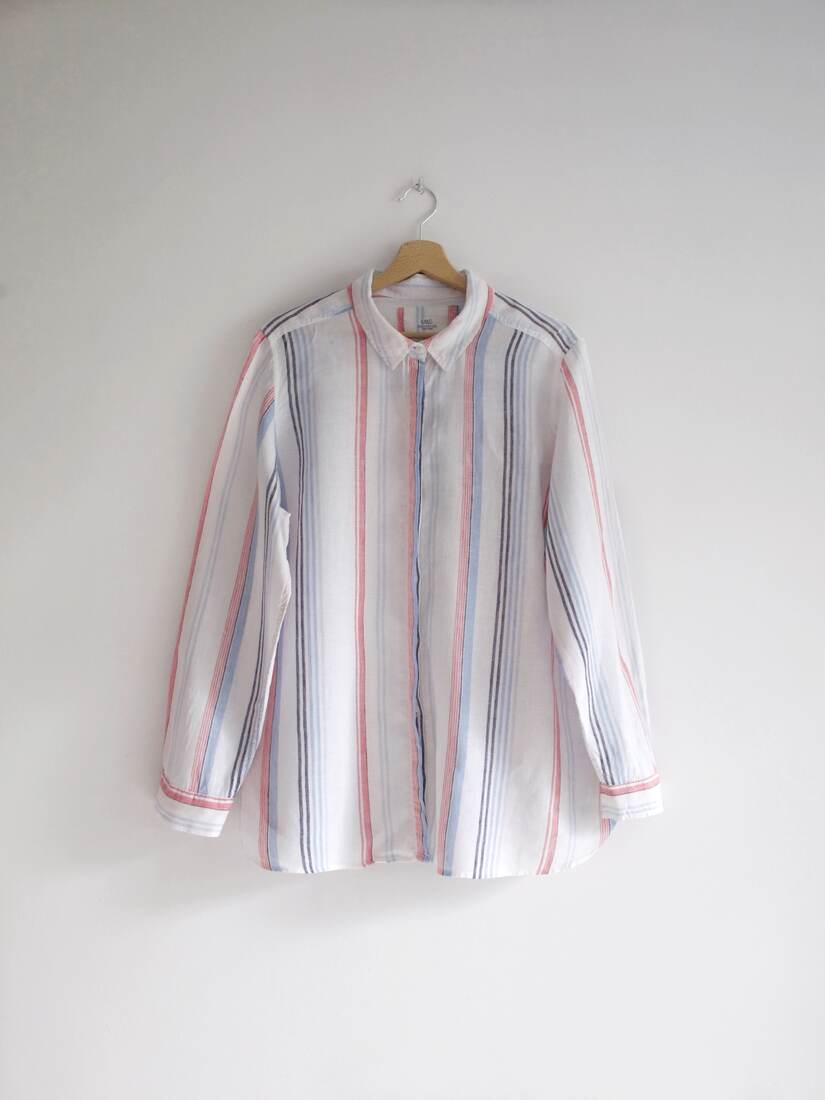 Lniana koszula w paski, angielska marka Marks&Spencer. Rozmiar z metki 18, polecam na L-XL, lub na mniejsze jako oversize. Bez wad.