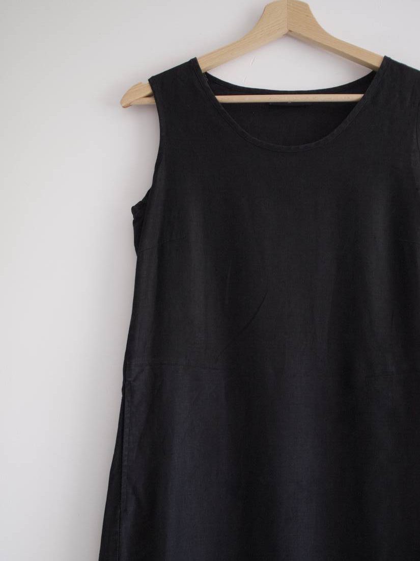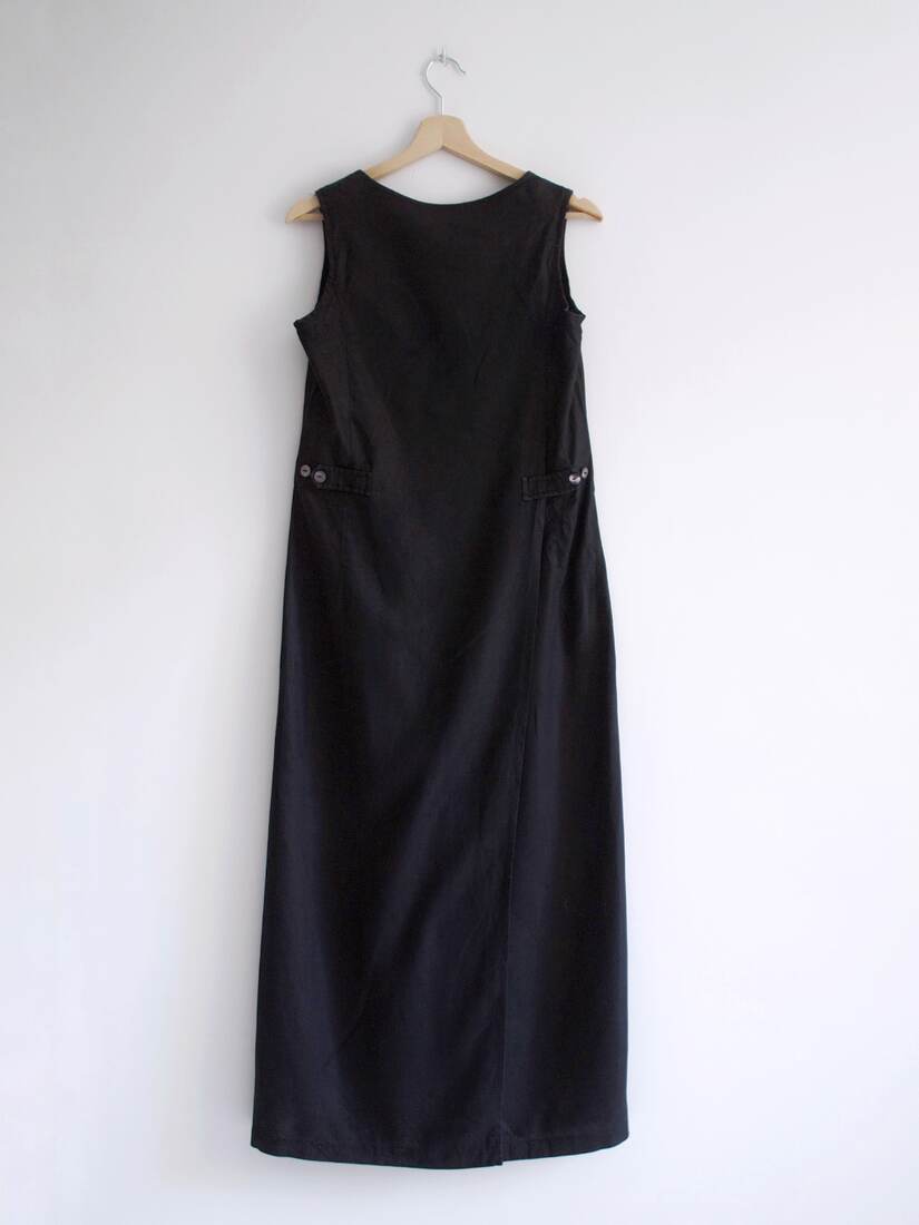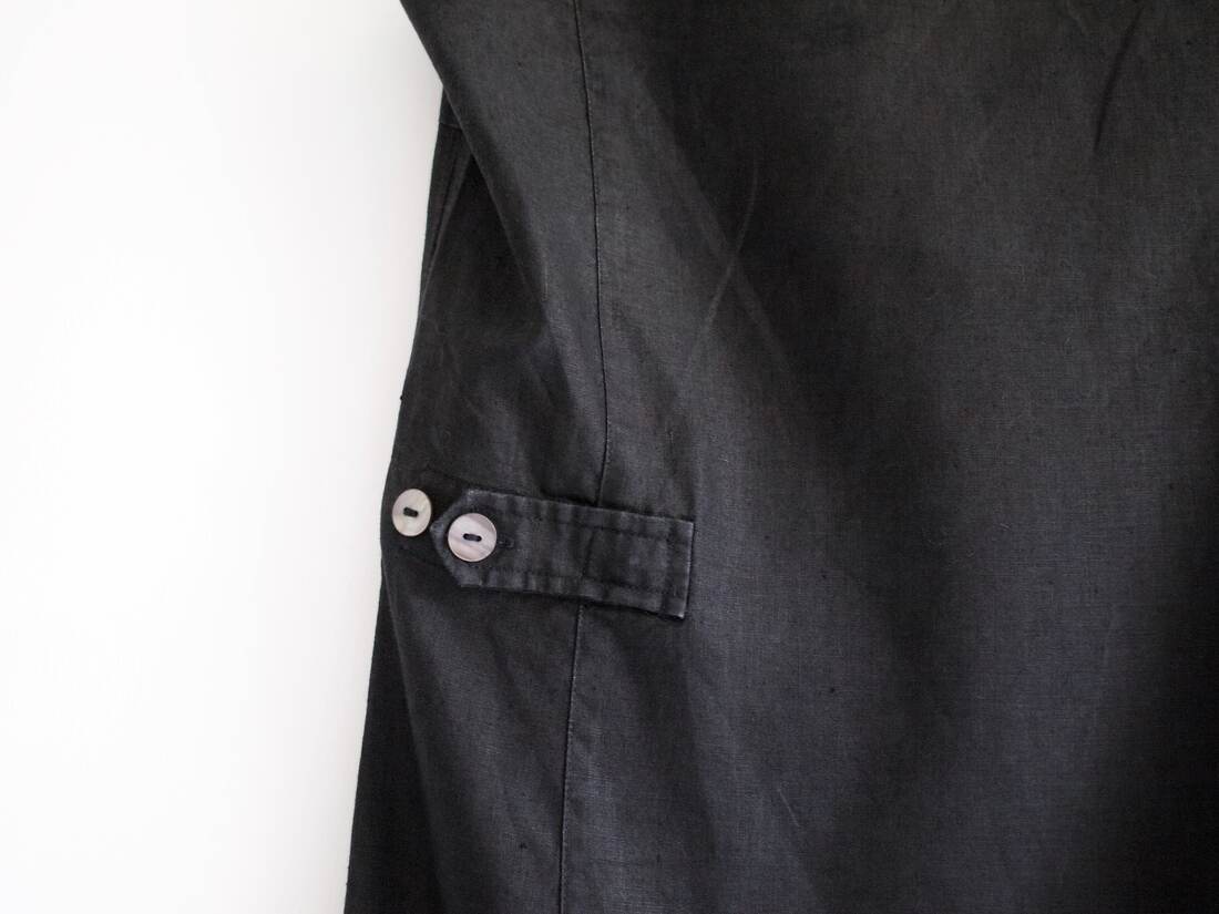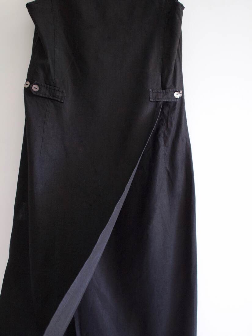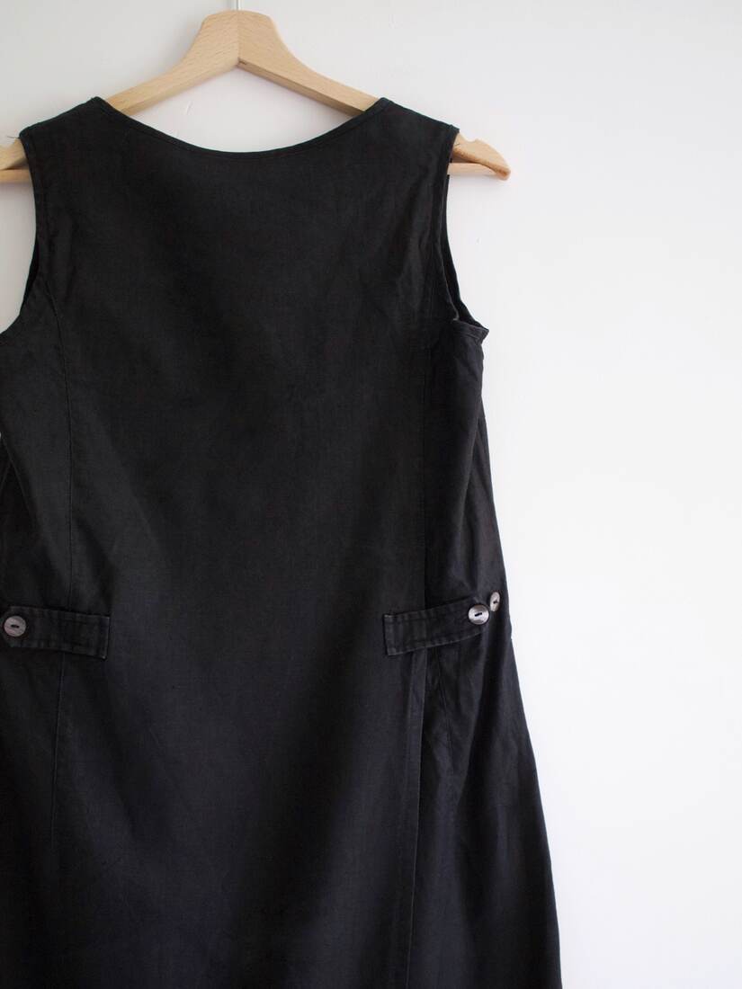 Unikatowa sukienka vintage, w 100% wykonana ze lnu. Prosty fason, z oryginalnym rozcięciem z tyłu. Z przodu kieszenie, szerokość w pasie można regulować guzikami. Będzie pasować na S- mniejsze M, proszę sugerować się wymiarami. Polecam dla osoby o wzroście powyżej 165 cm. Bez wad.
