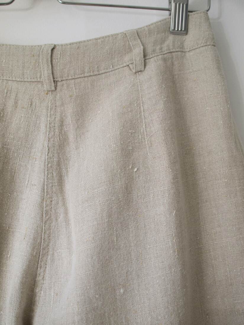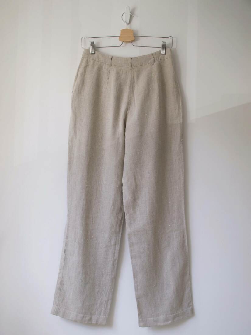 Spodnie vintage w 100% wykonane z surowego lnu. Wysoki stan, zwężane w talii.