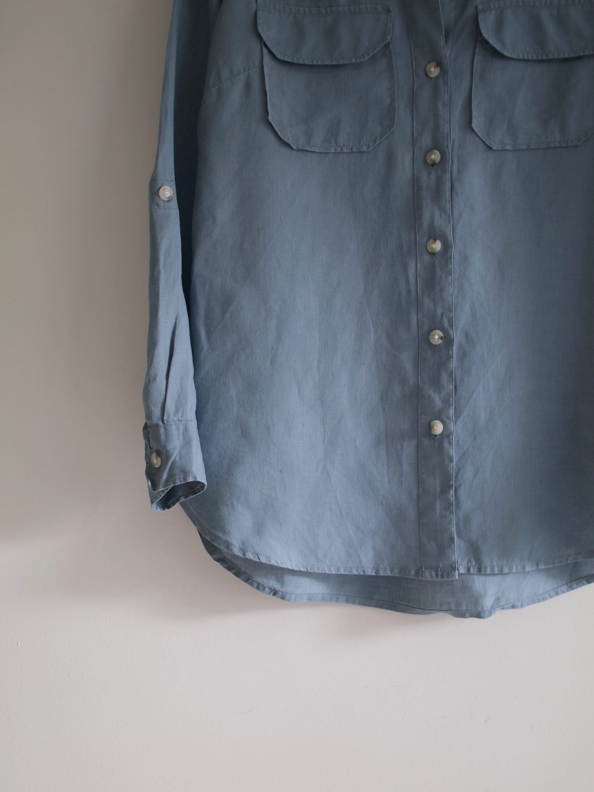 Lniana koszula w kolorze gołębim. Rozmiar: 8 Skład: 100% len Stan: idealny Szerokość w klatce 51 cm Długość całkowita 73 cm