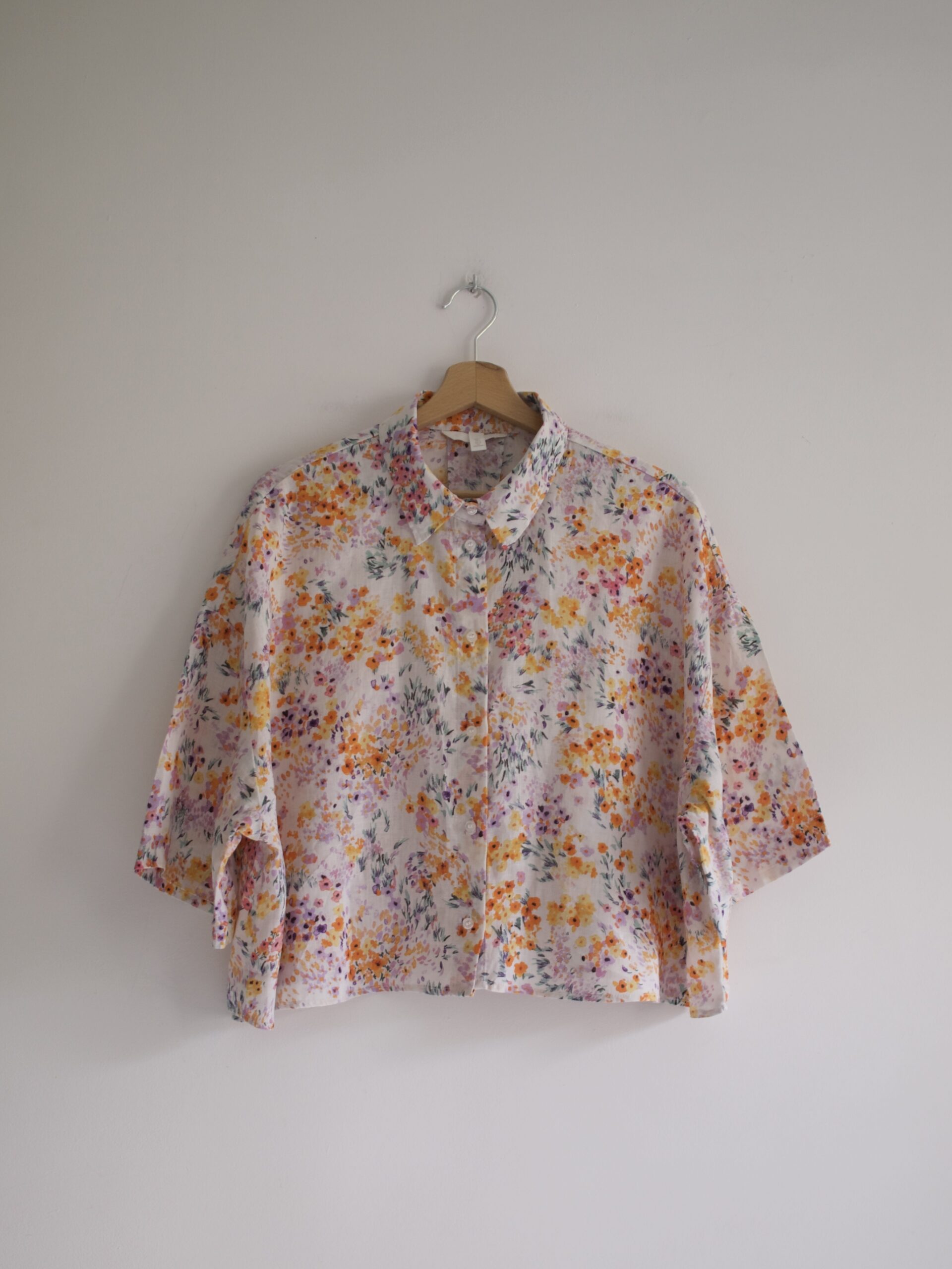 Koszula w kwiatowy wzór, w 100% wykonana z lnu. Krótszy fason, dobra do spodni z wysokim stanem.