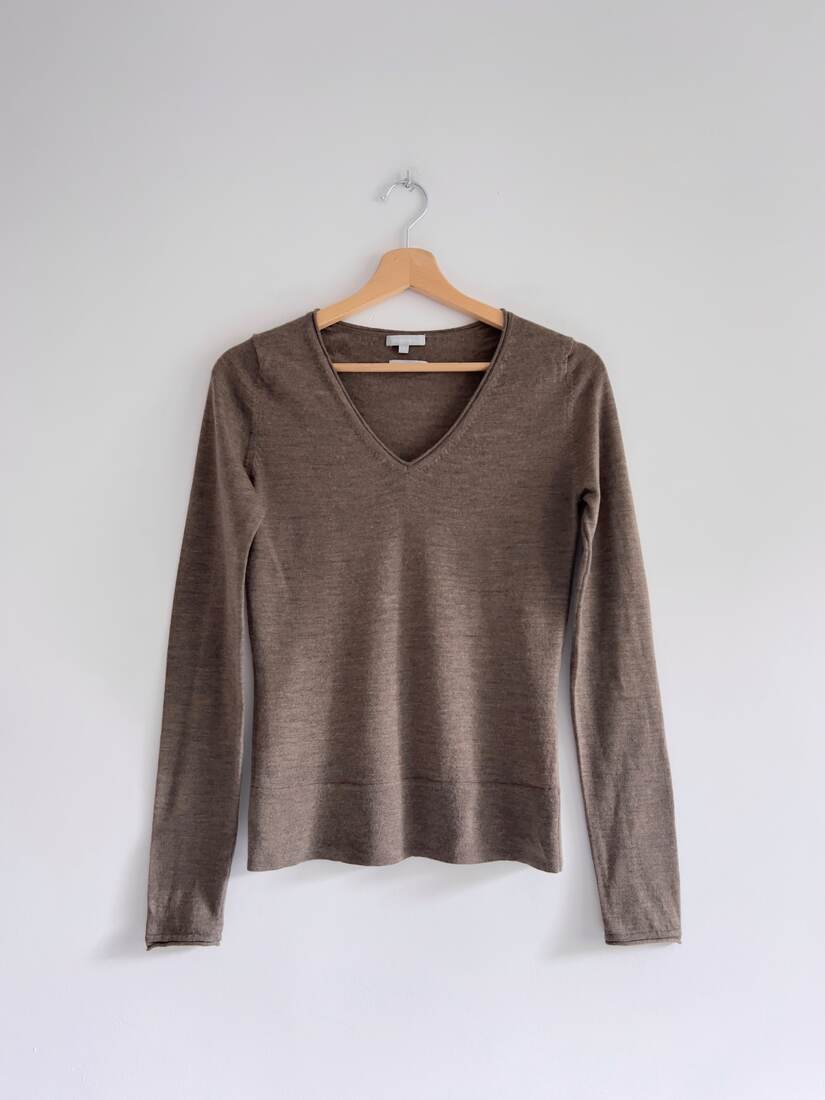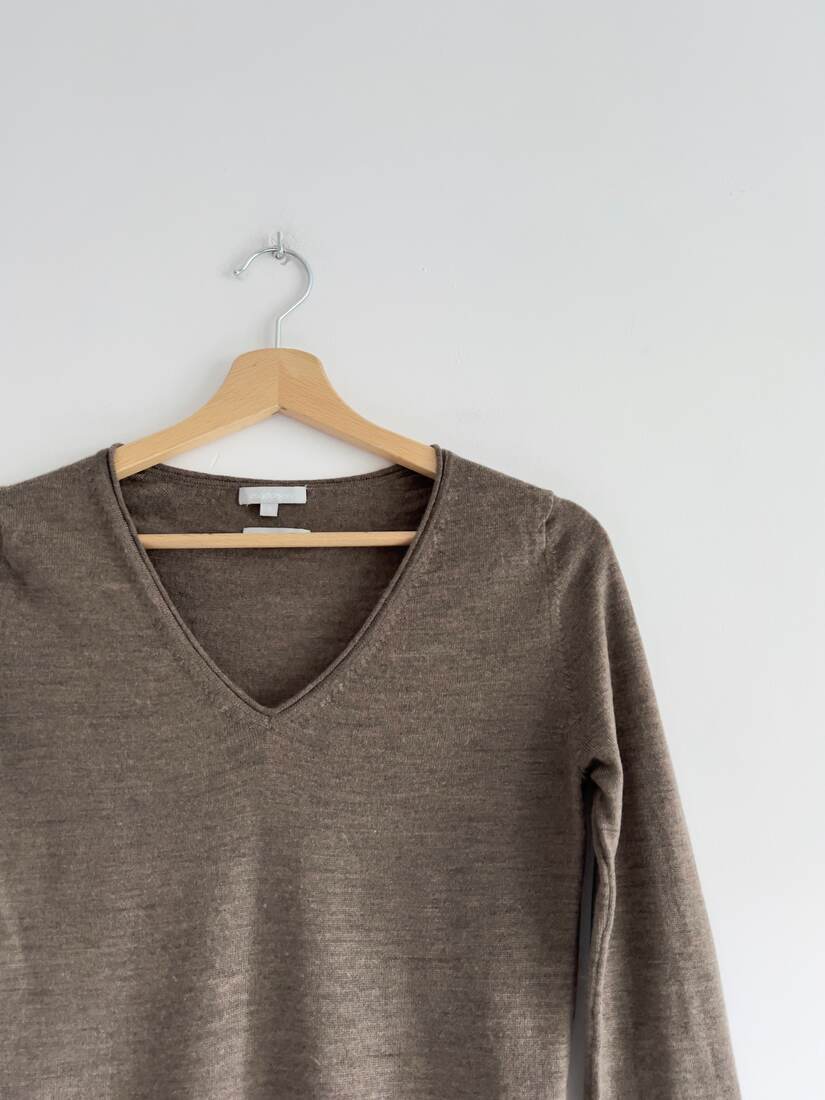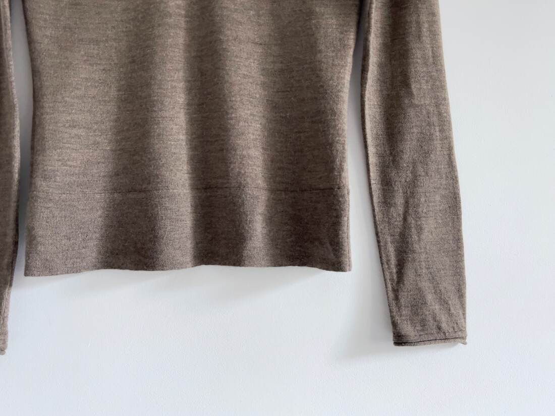 Minimalistyczny wełniany sweter z golfem. Idealny stan, materiał nie gryzie. Brak metki z rozmiarem, na oko jest to L, na mniejsze rozmiary idealny jako oversize (proszę sprawdzać wymiary).