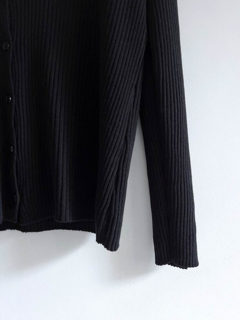 Kardigan vintage w prążki, w 100% wykonany z wełny merynosa. Na dole ma małe cerowanie, nie widoczne w noszeniu. Poza tym bardzo dobry stan.