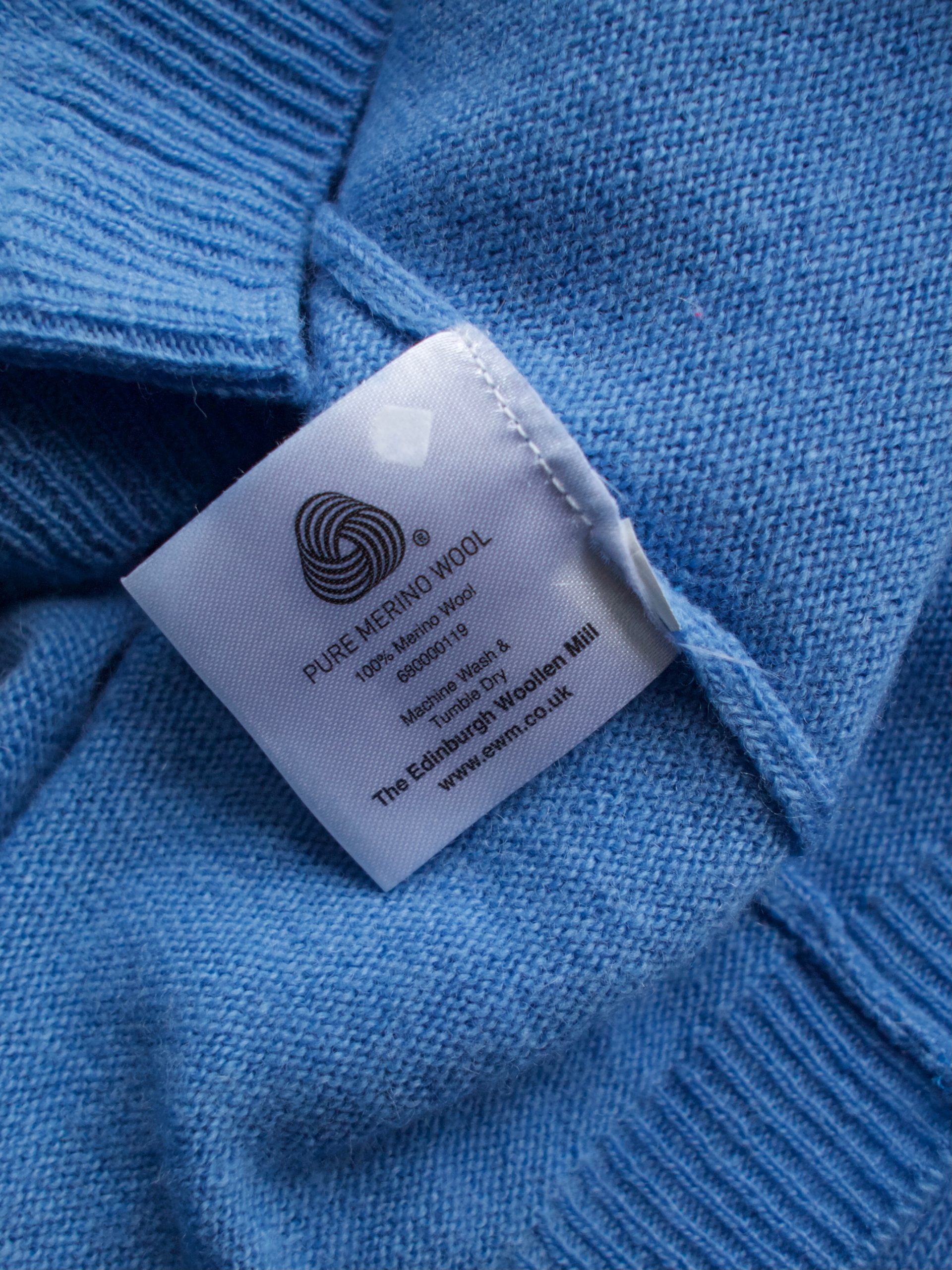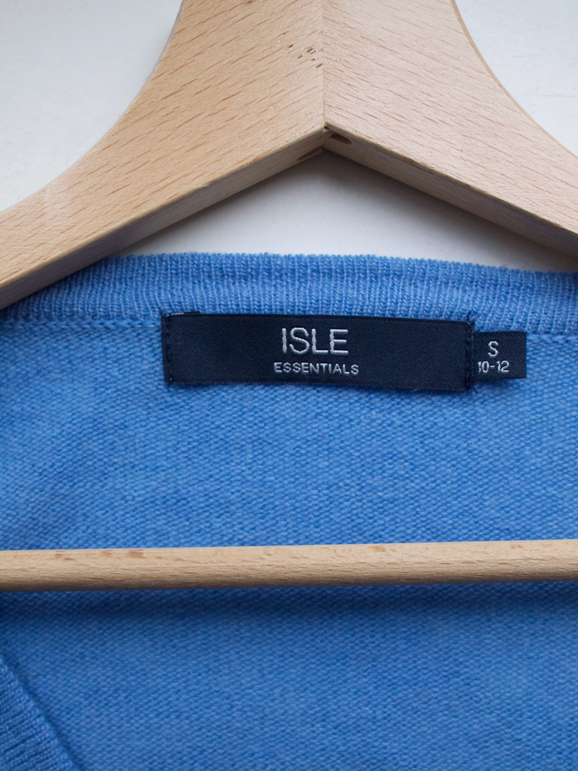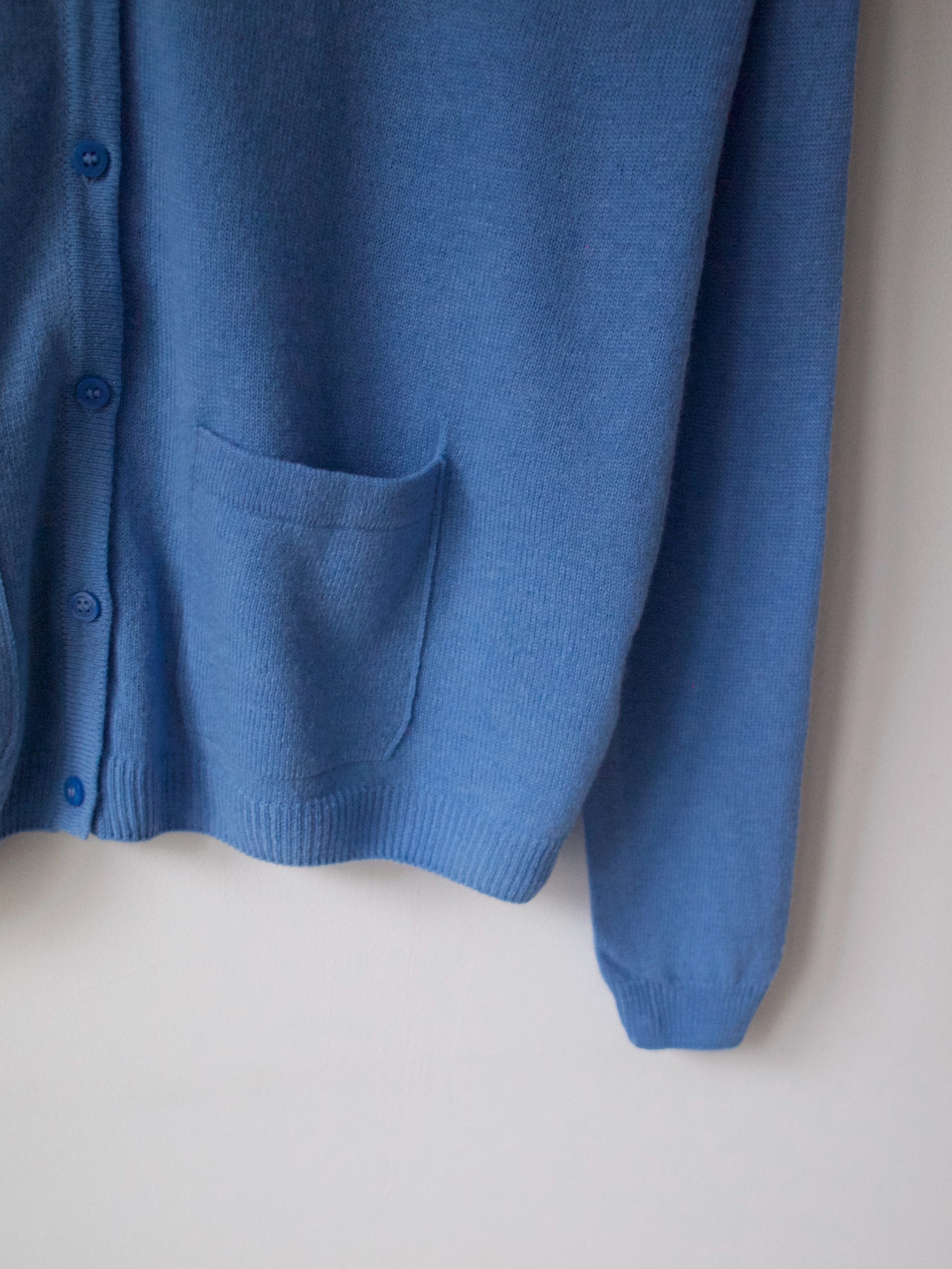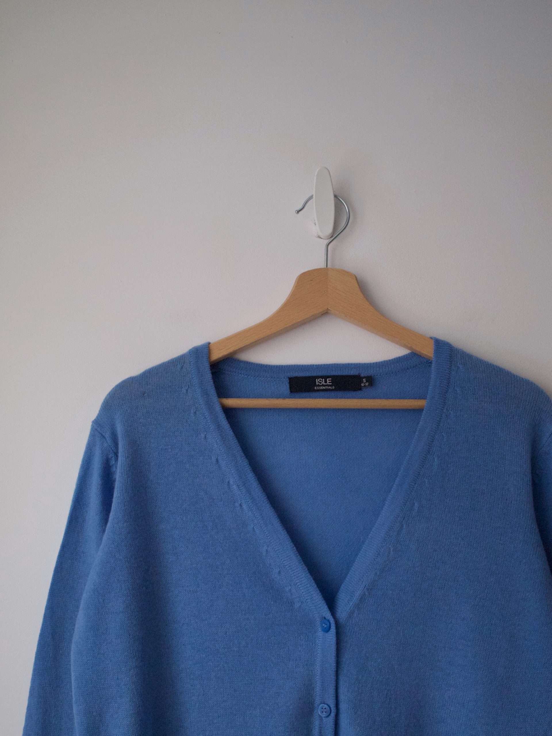 Kardigan w pięknym niebieskim kolorze, w 100% wykonany z wełny merino. Rozmiar z metki: S Skład: 100% wełna Stan: idealny Szerokość w klatce 50 cm Długośćcałkowita 64 cm