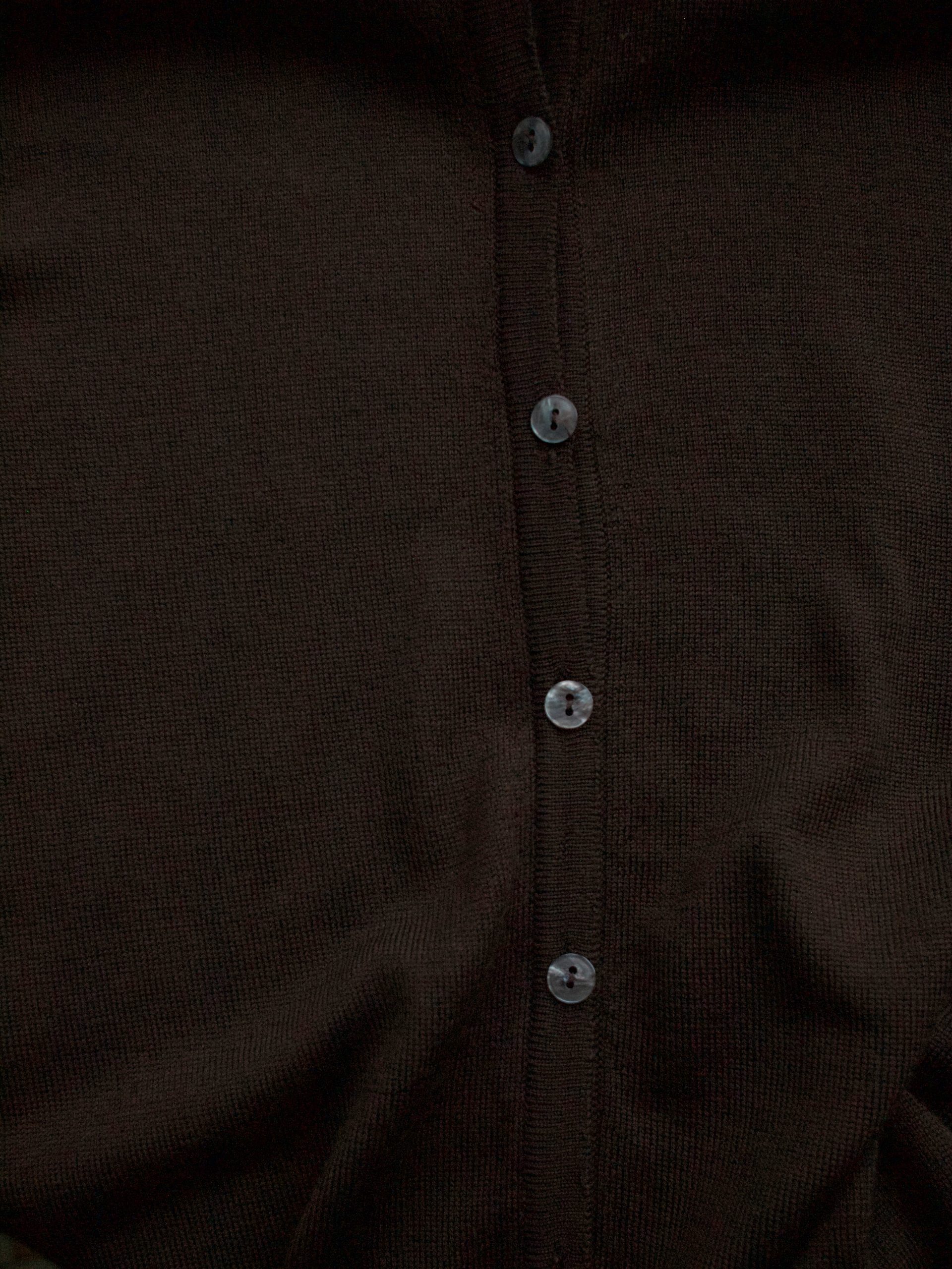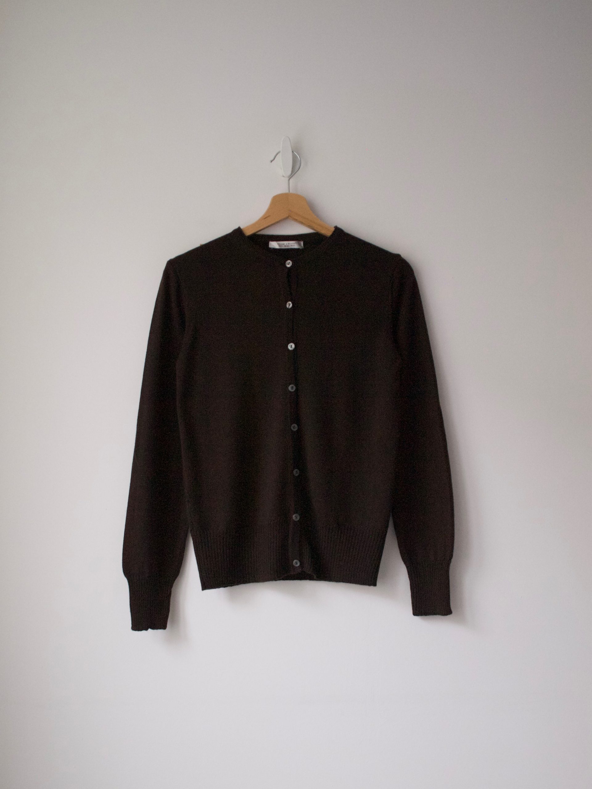 Czekoladowy kardigan vintage. W 100% wykonany z gładkiej wełny merino.