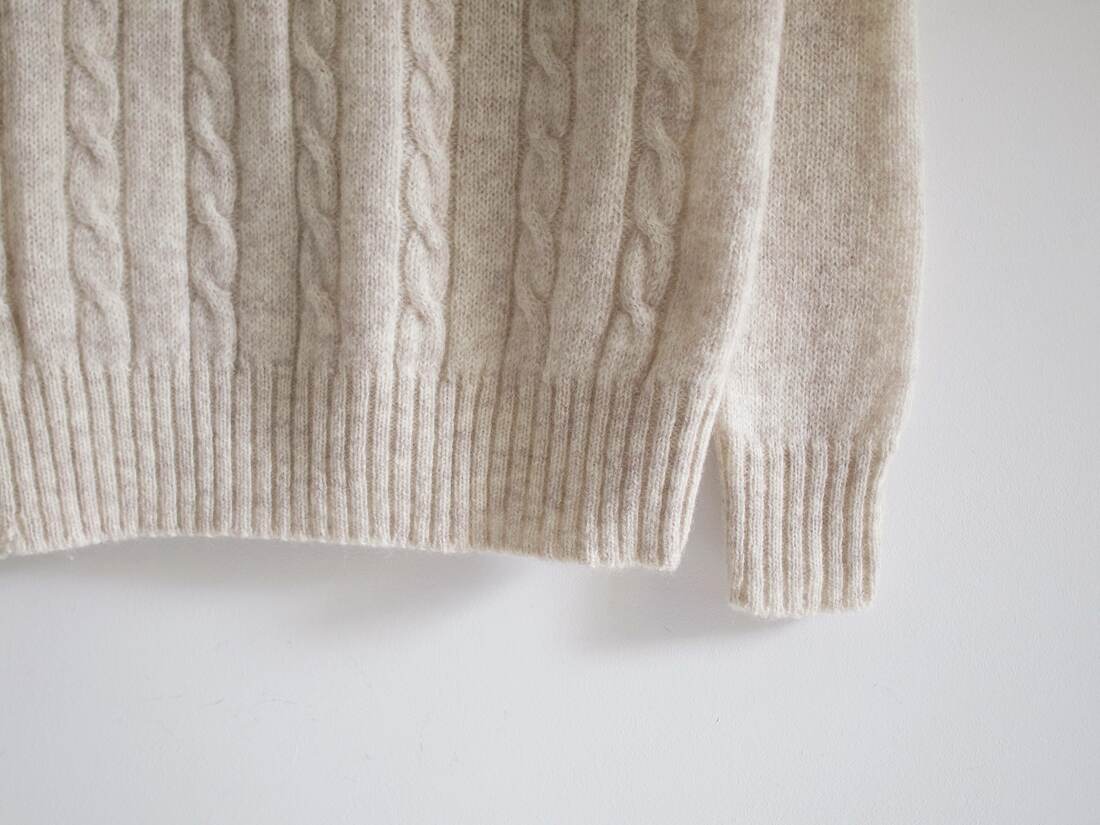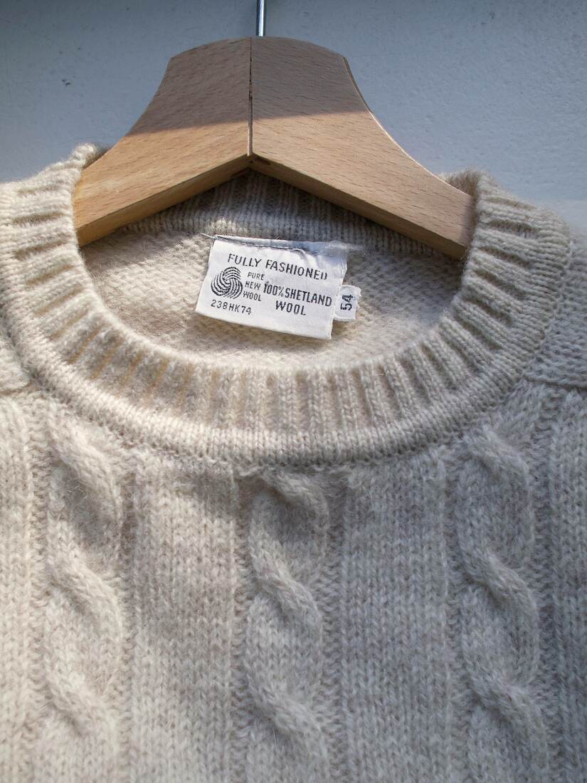 Vintage sweter w jasnym beżowym kolorze. W 100% wykonany z wełny szetlandzkiej, bardzo ciepły, jednak może gryźć.