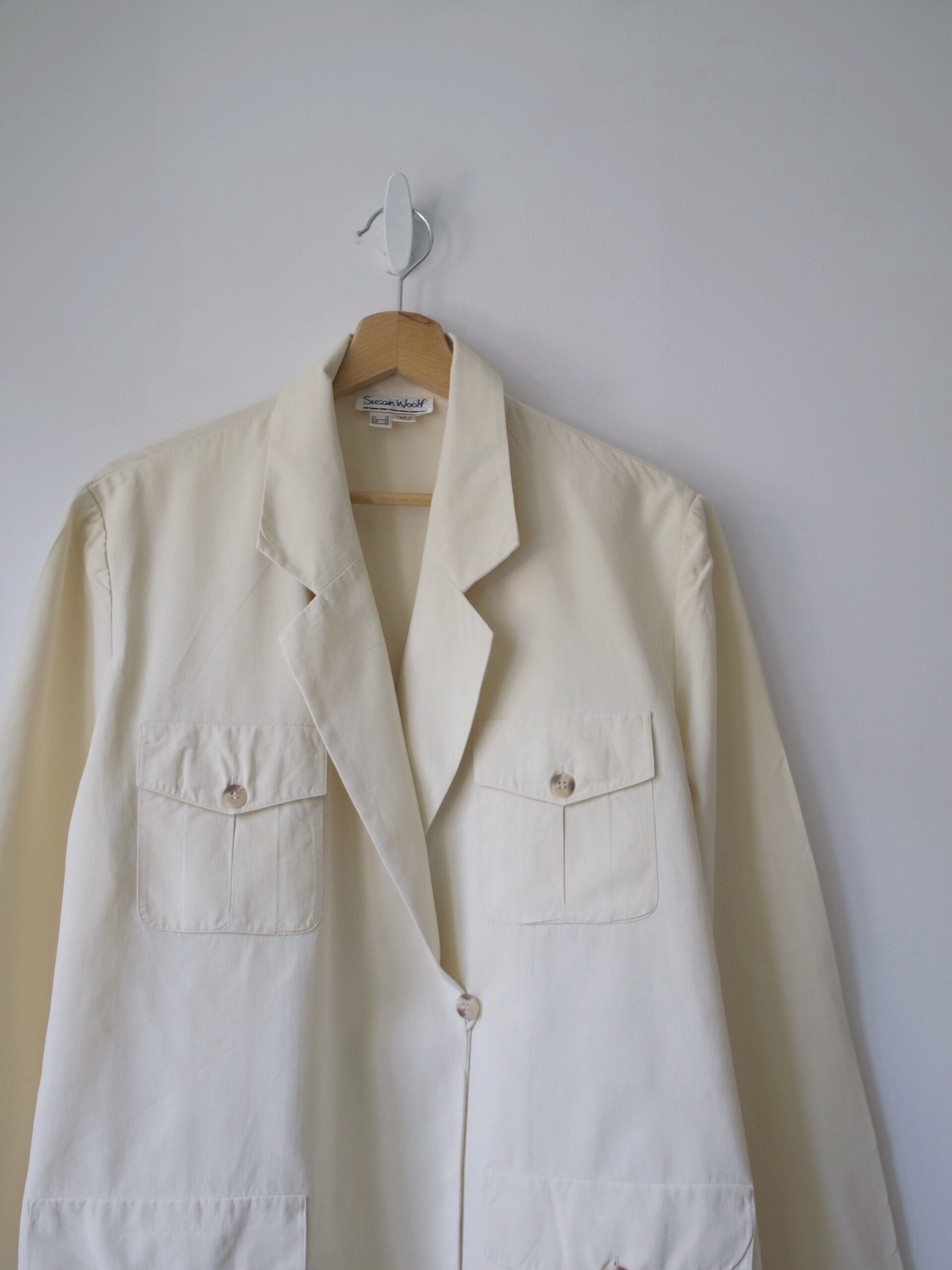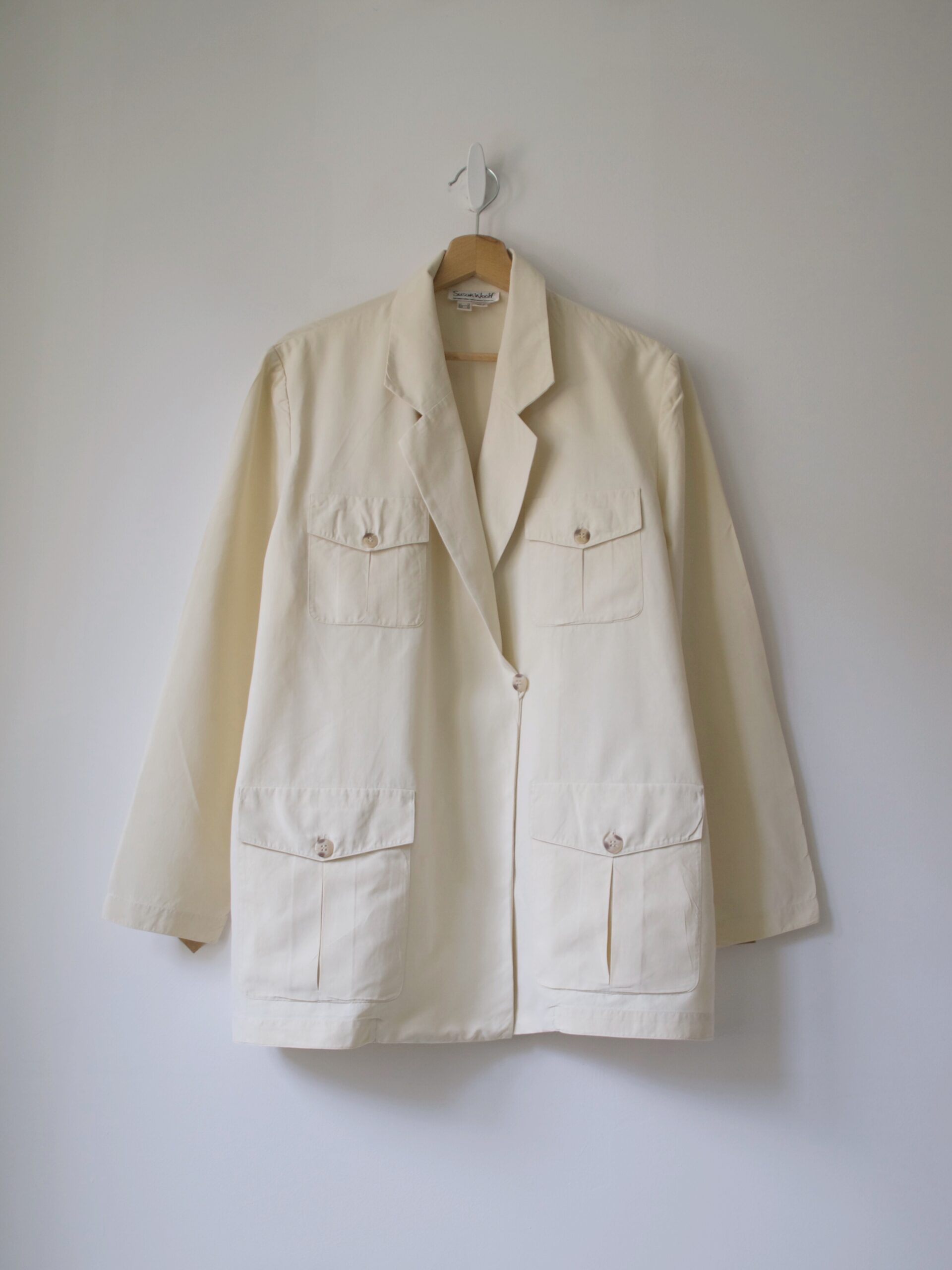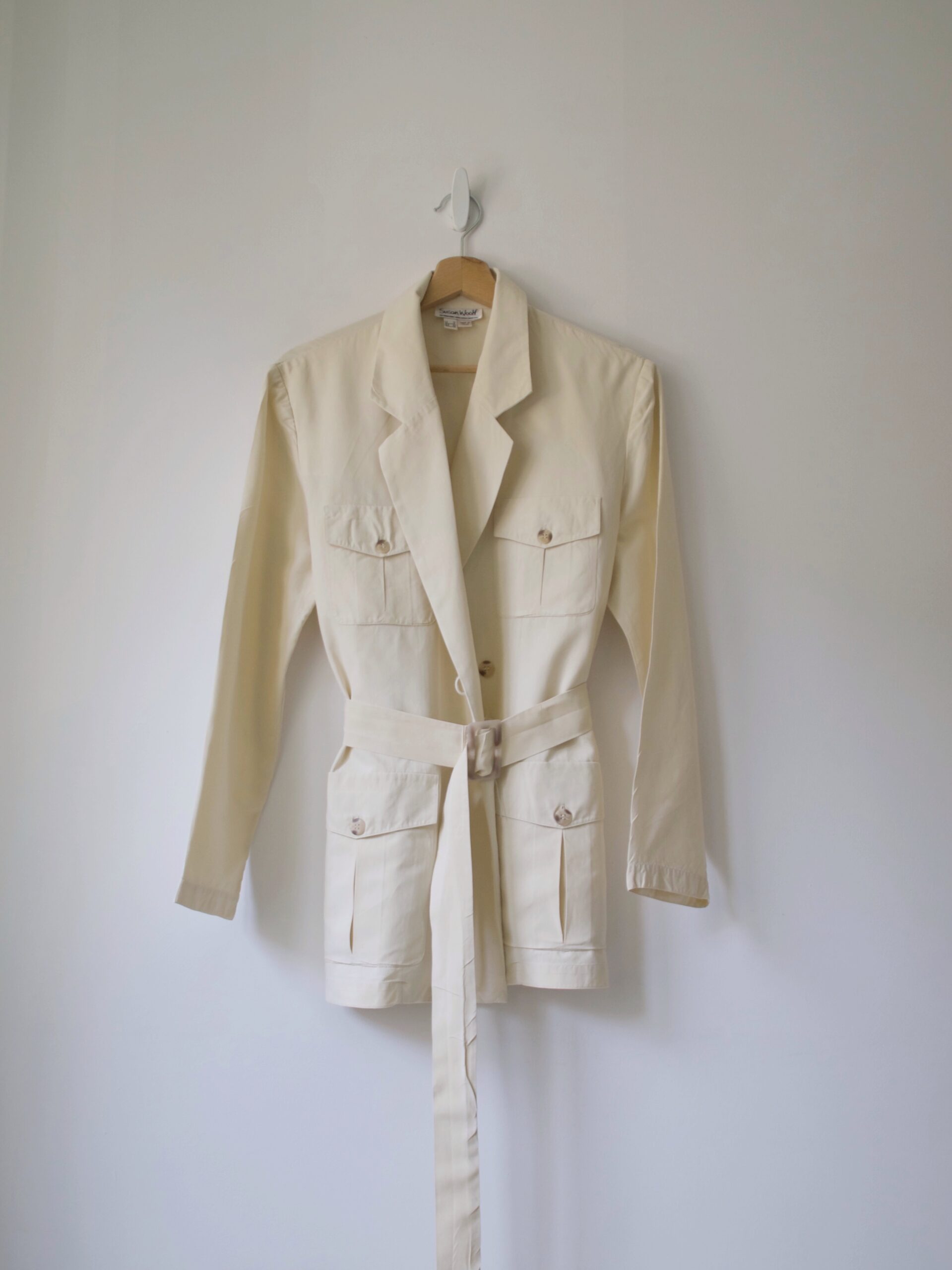 Unikatowa marynarka vintage, w 100% wykonana z jedwabiu. W komplecie jedwabny pasek. Materiał w bardzo dobrym stanie, jedyna wada to przebarwienia na rękawie, są pokazane na zdjęciach. Nie są bardzo widoczne w noszeniu.