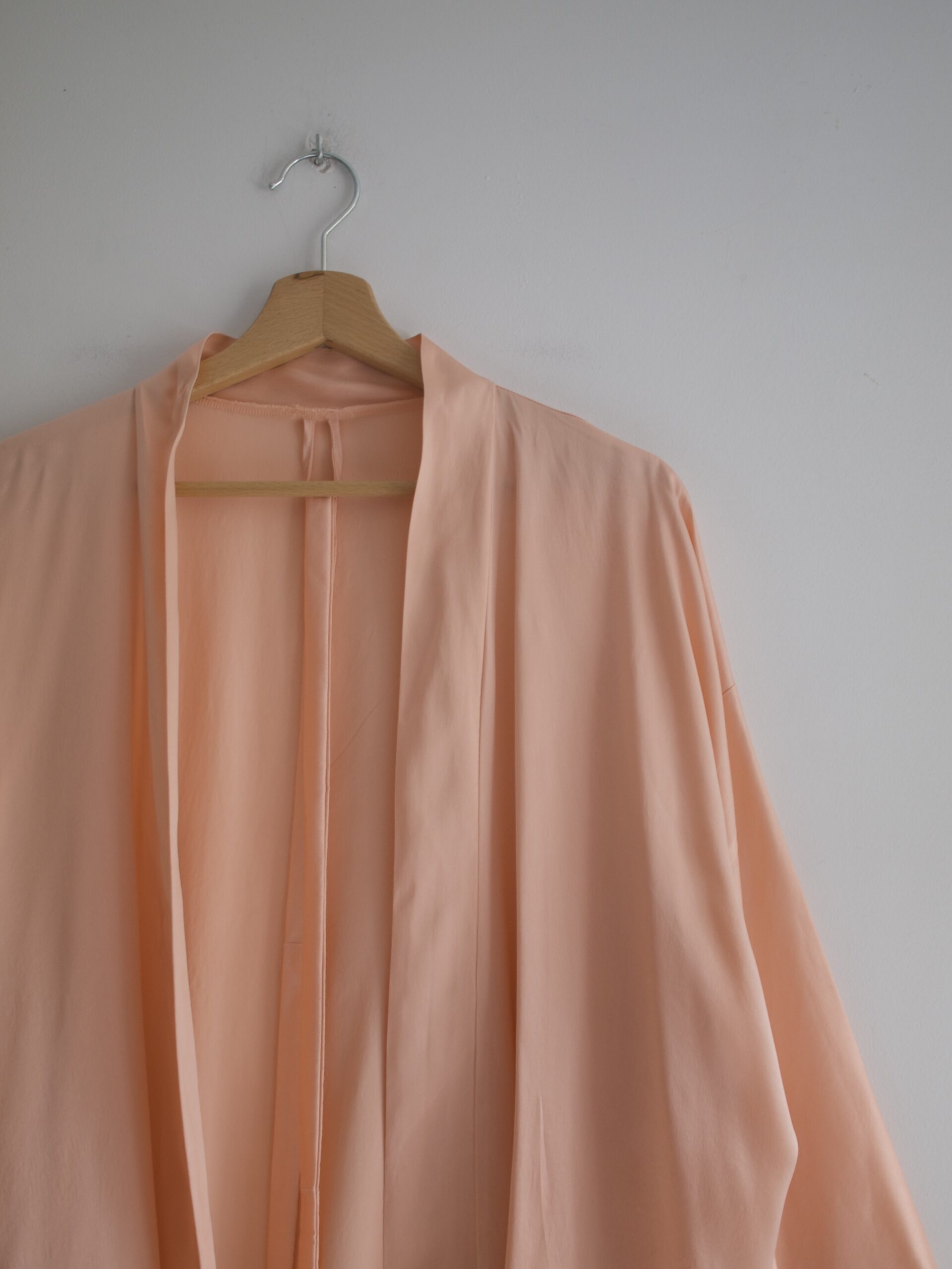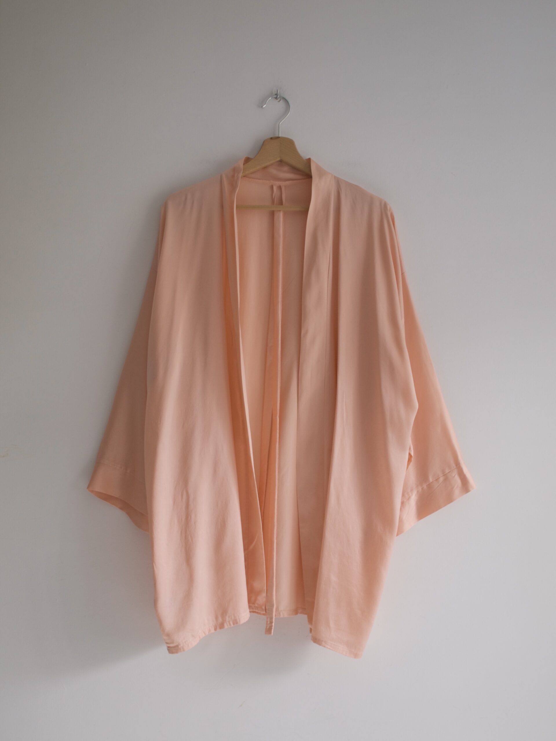 Jedwabny szlafrok o kimonowym fasonie. Z tyłu ma malutkie przebarwienie, nie widoczne w noszeniu ( na zdj.)