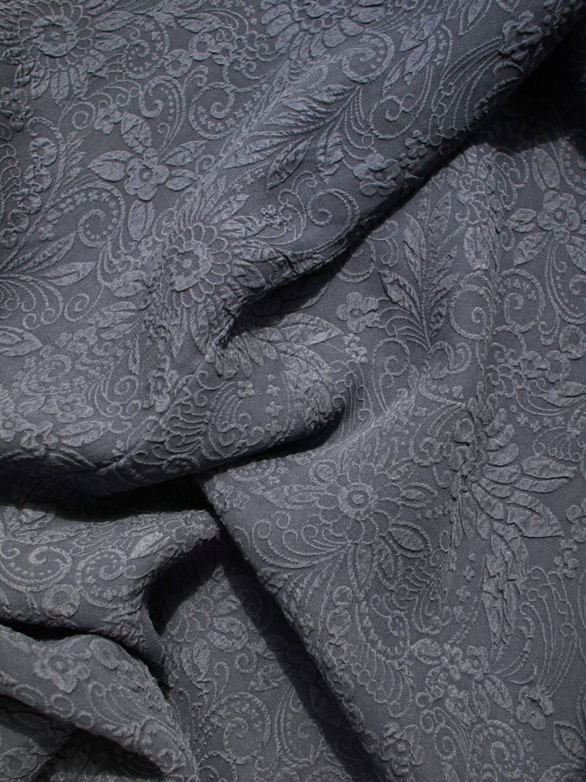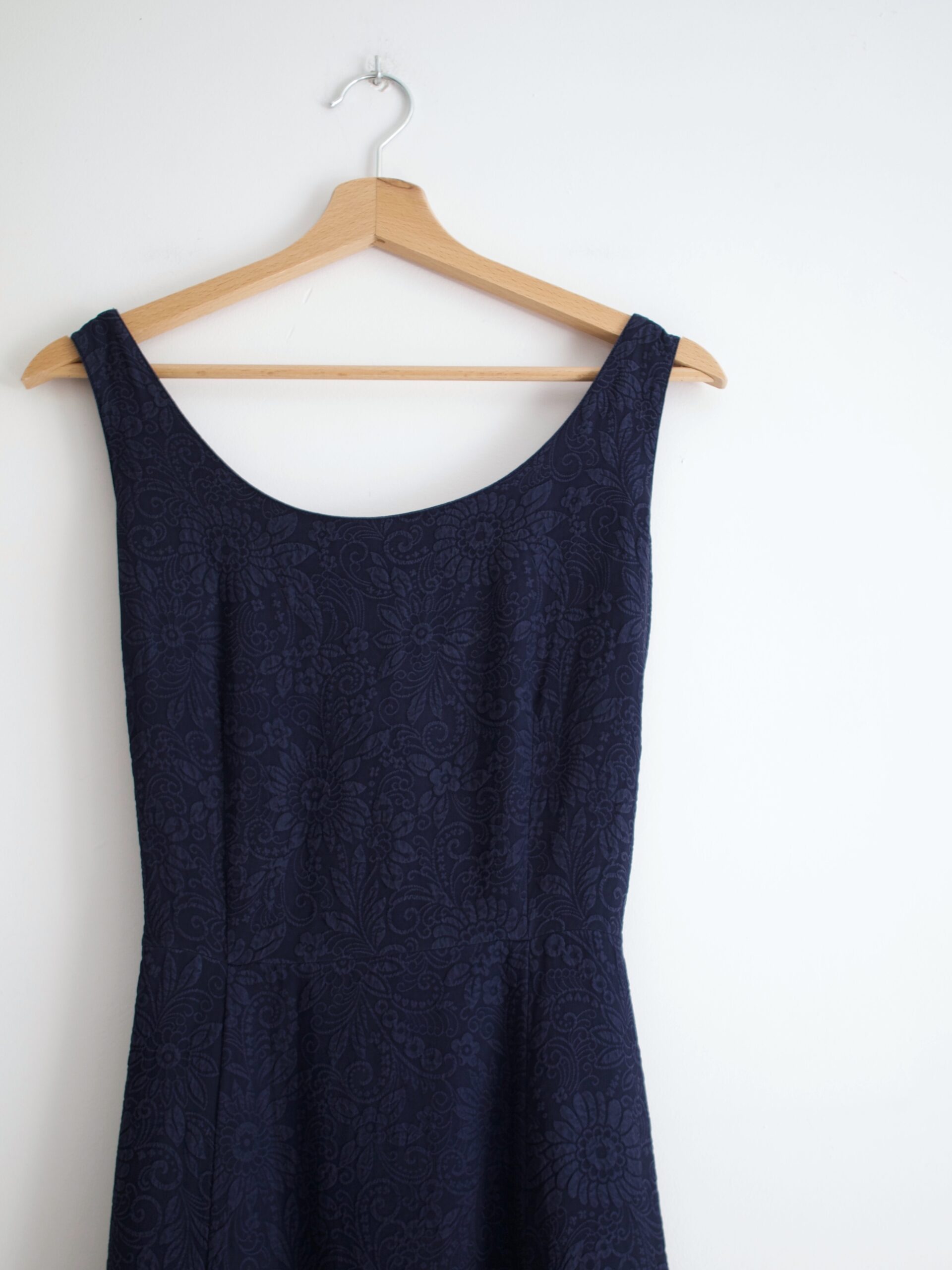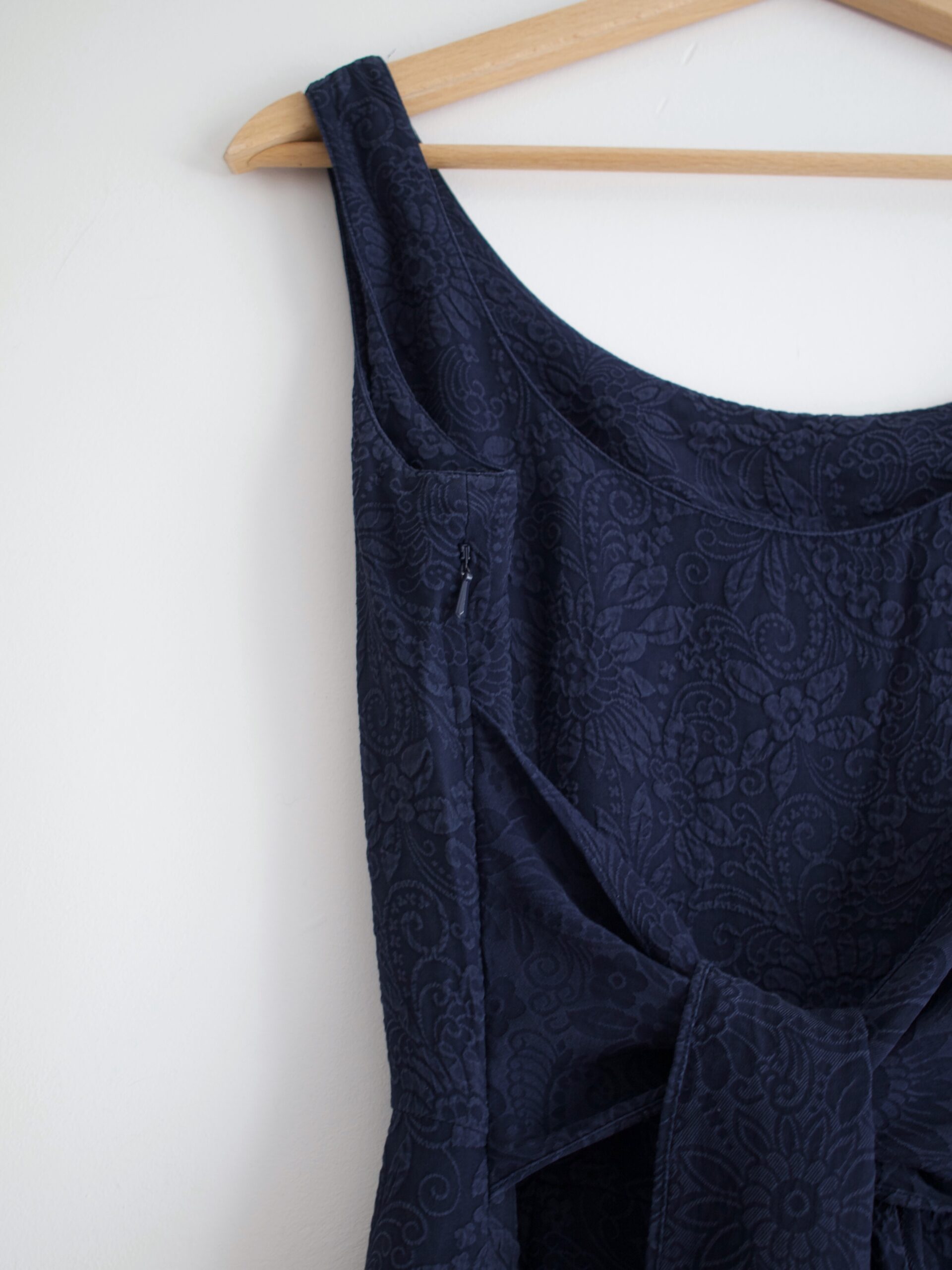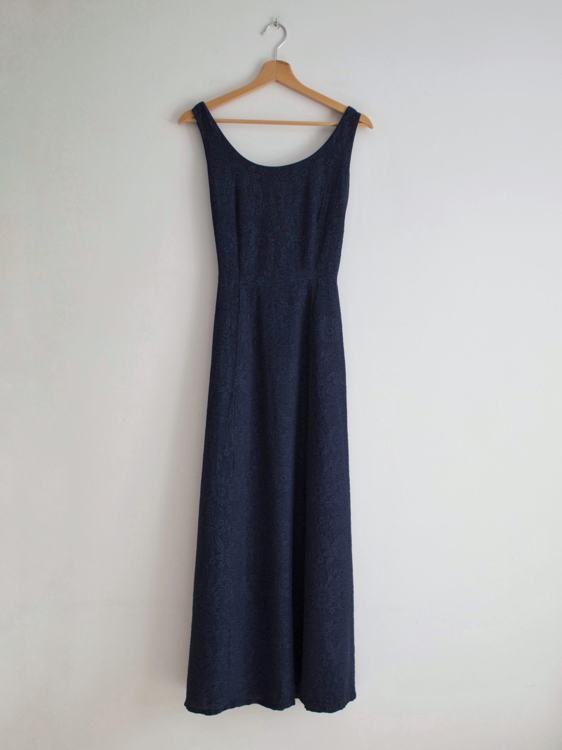 Sukienka vintage w kolorze granatowym. Wykonana z jedwabnej tkaniny w wytłaczane wzory. Zapinana na boczny zamek, z tyłu wiązanie.
