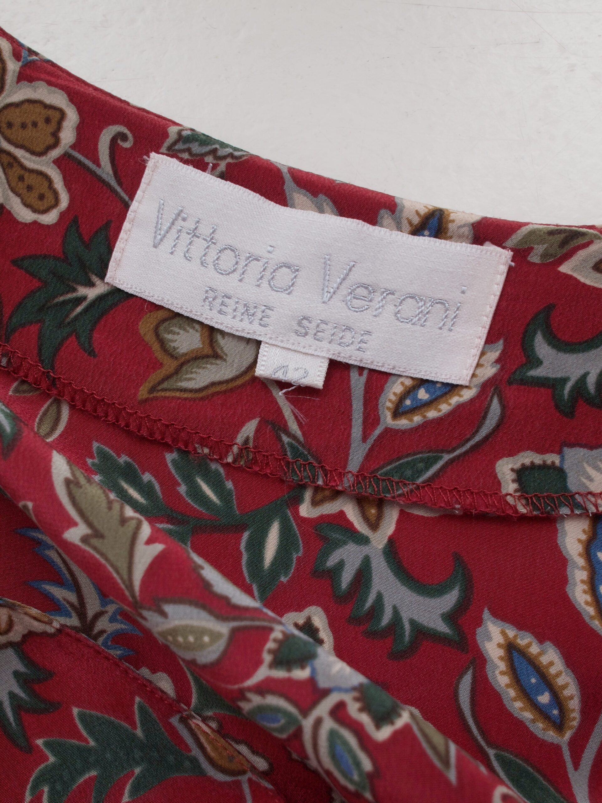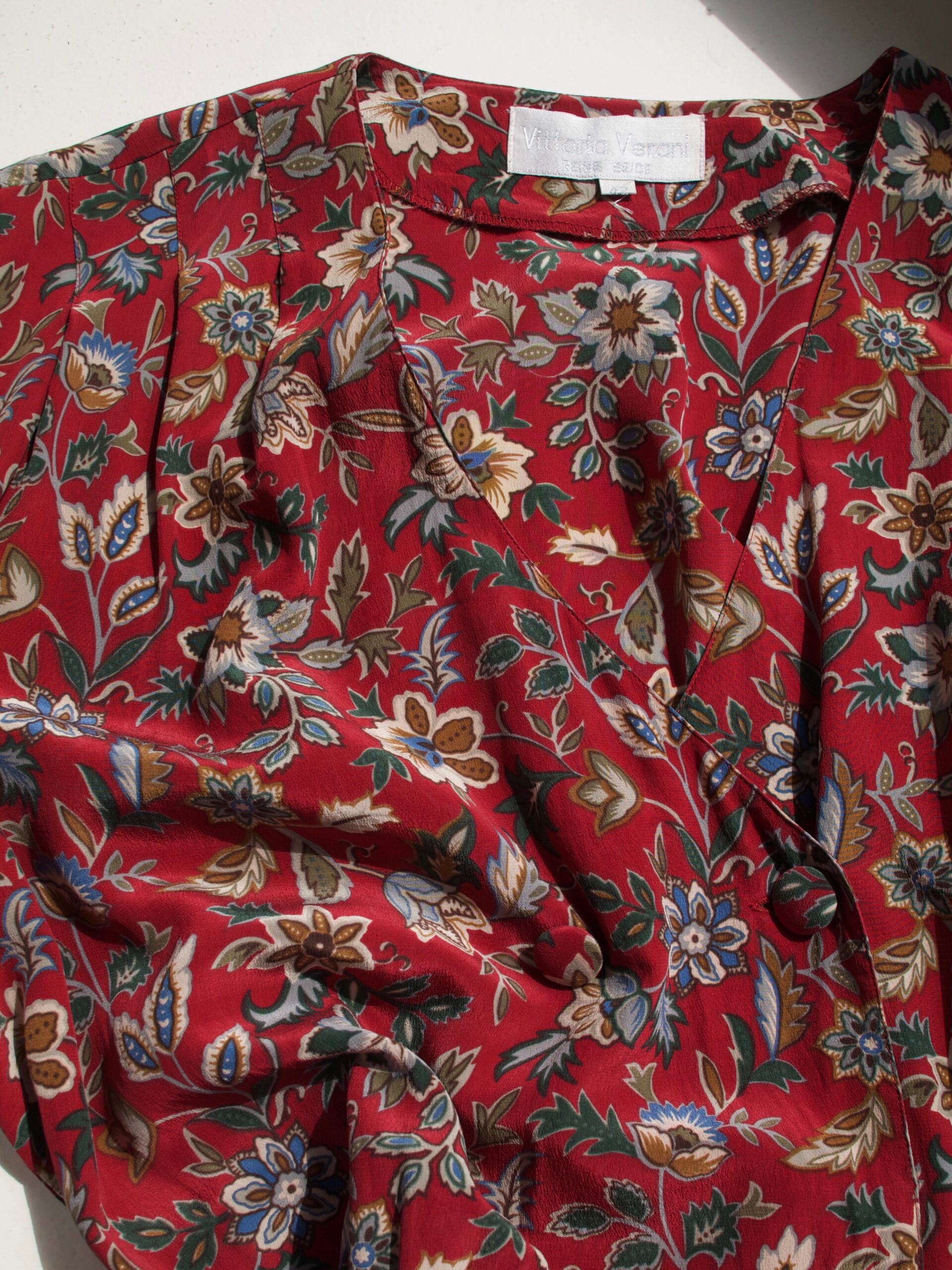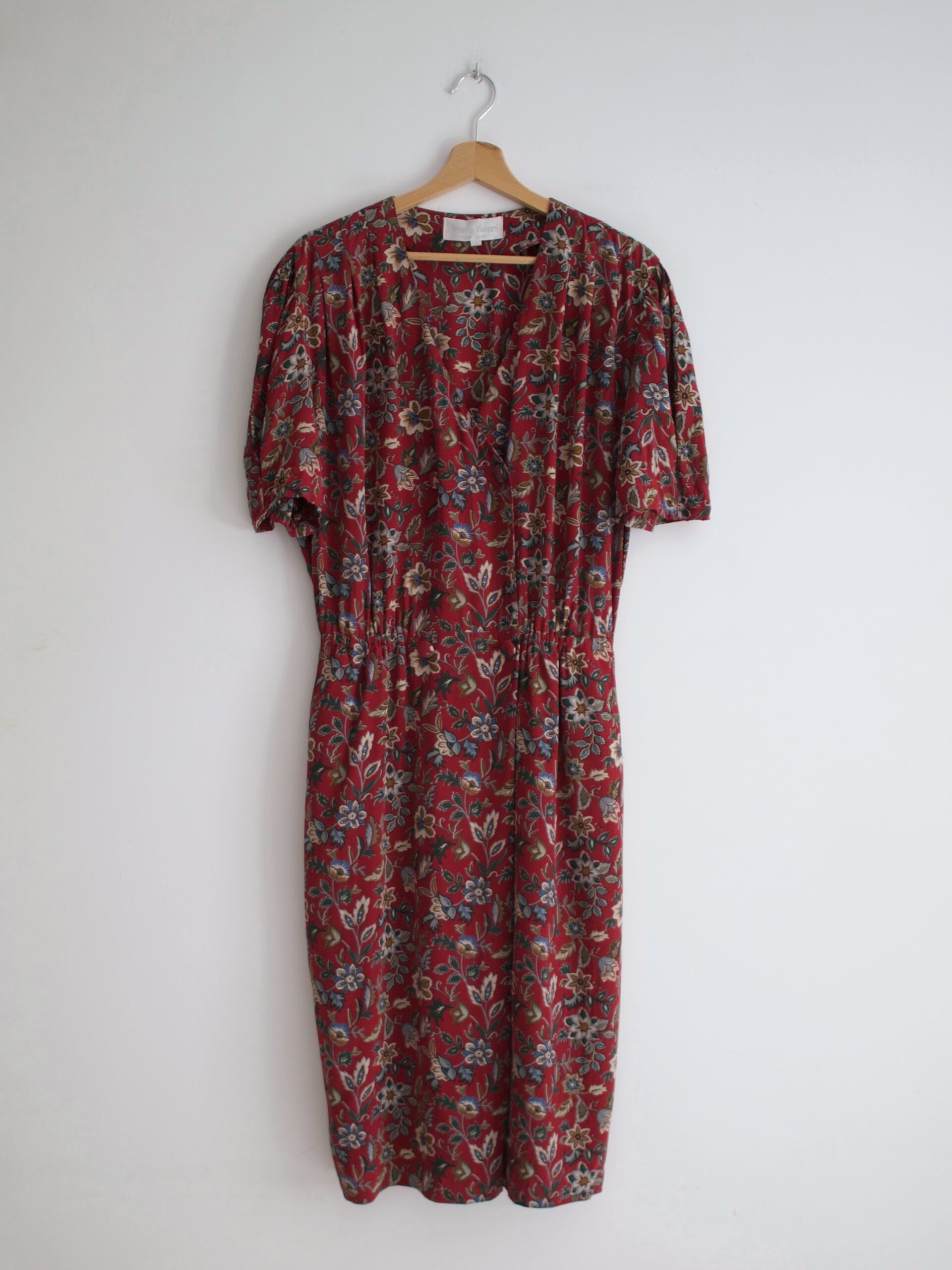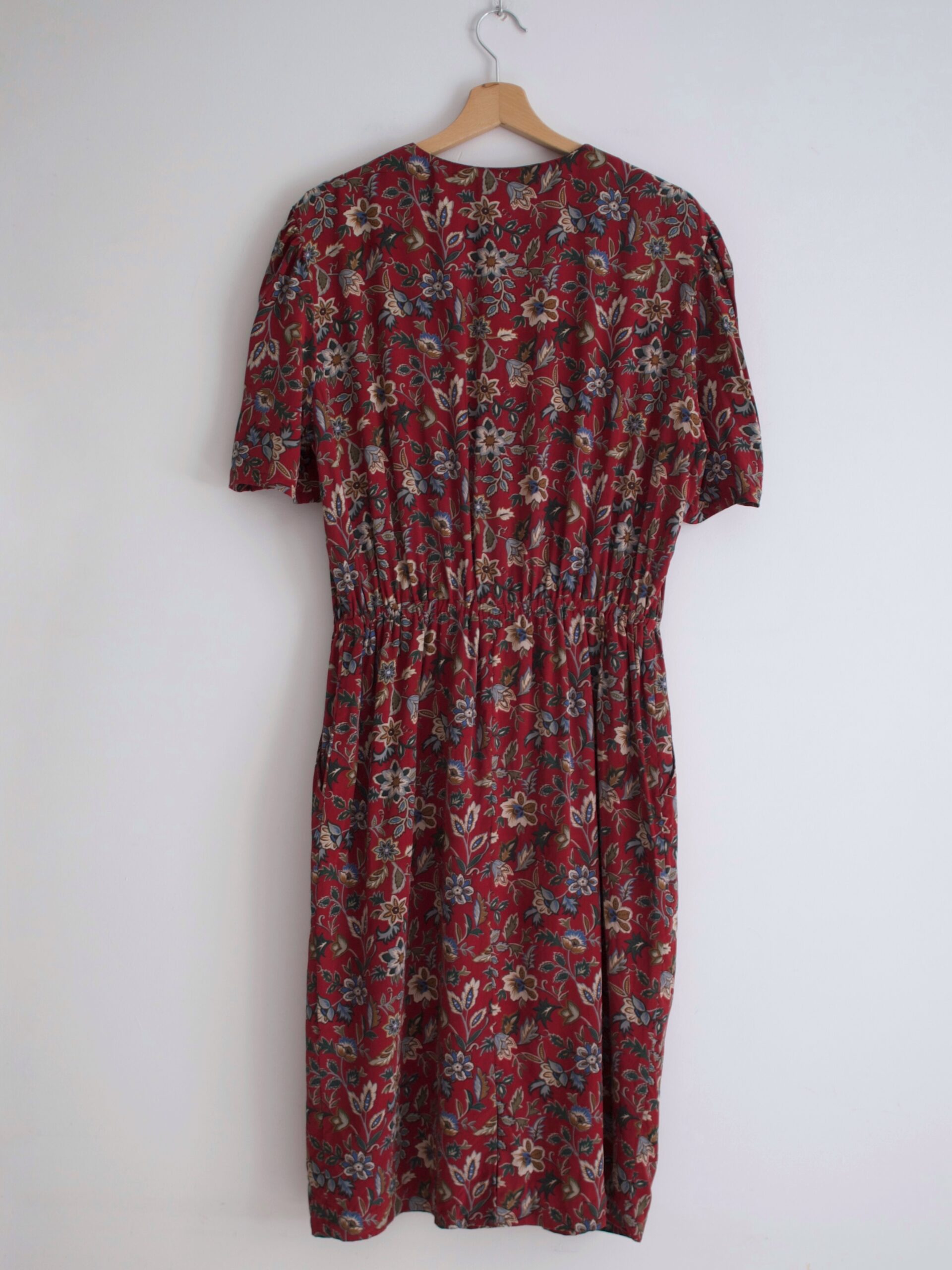 Unikatowa jedwabna sukienka real vintage. Zapinana na guziki powlekane jedwabną tkaniną. W dolnej części podszewka 100% acetat, z kieszeniami.