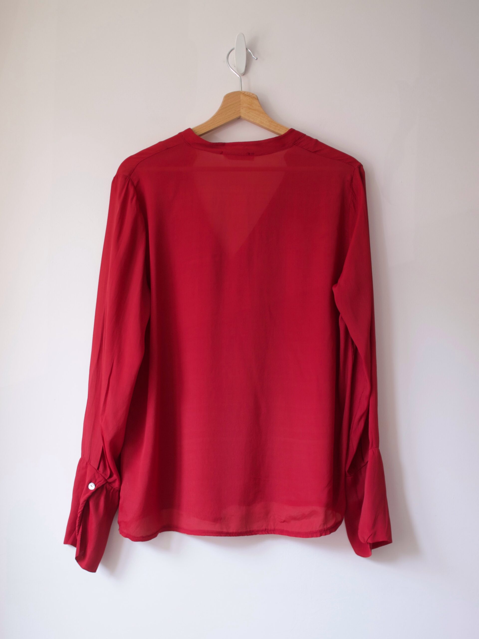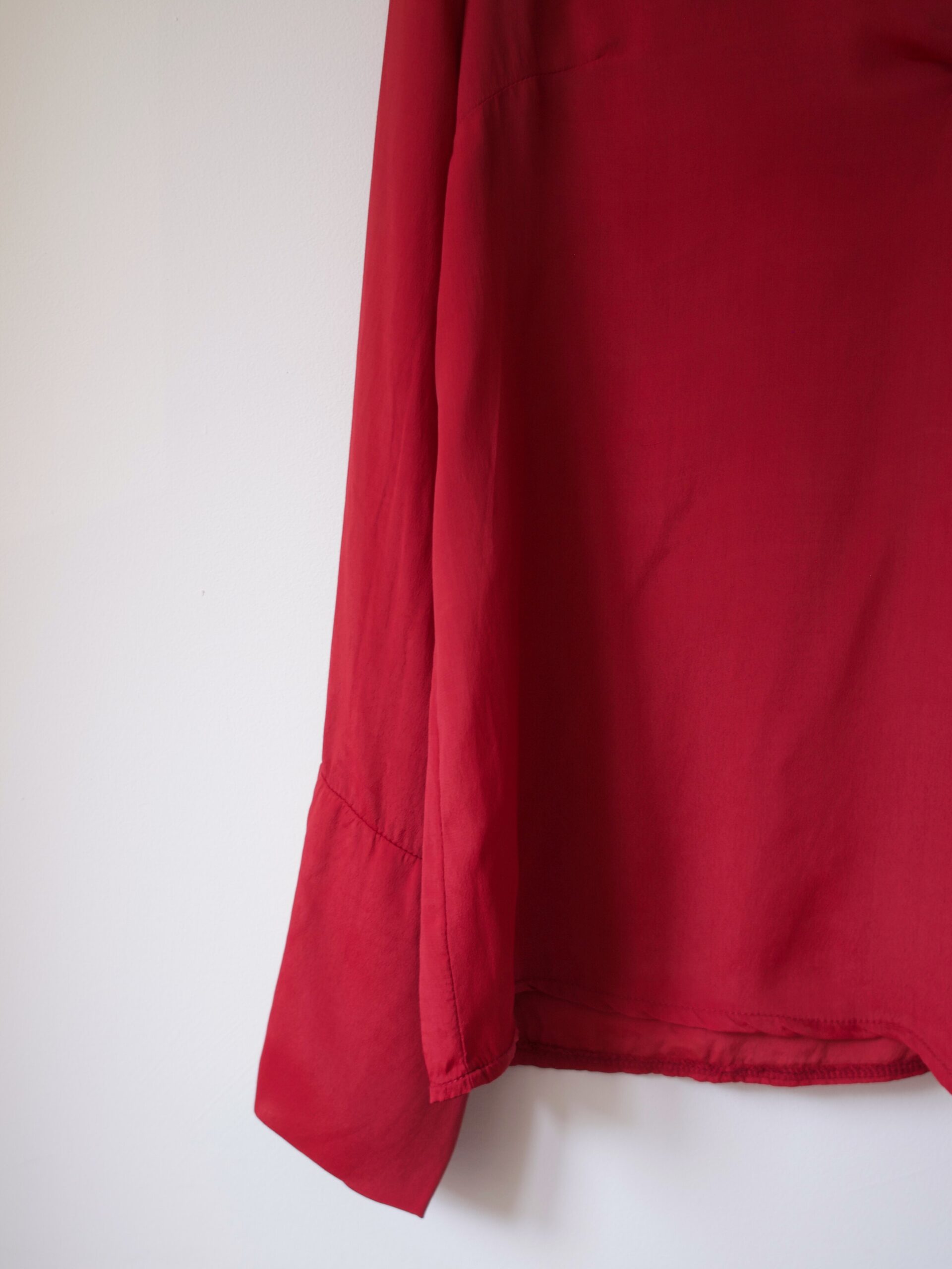 Bluzka vintage, w 100% wykonana z cienkiego jedwabiu. Rękawy wykończone dużymi mankietami.