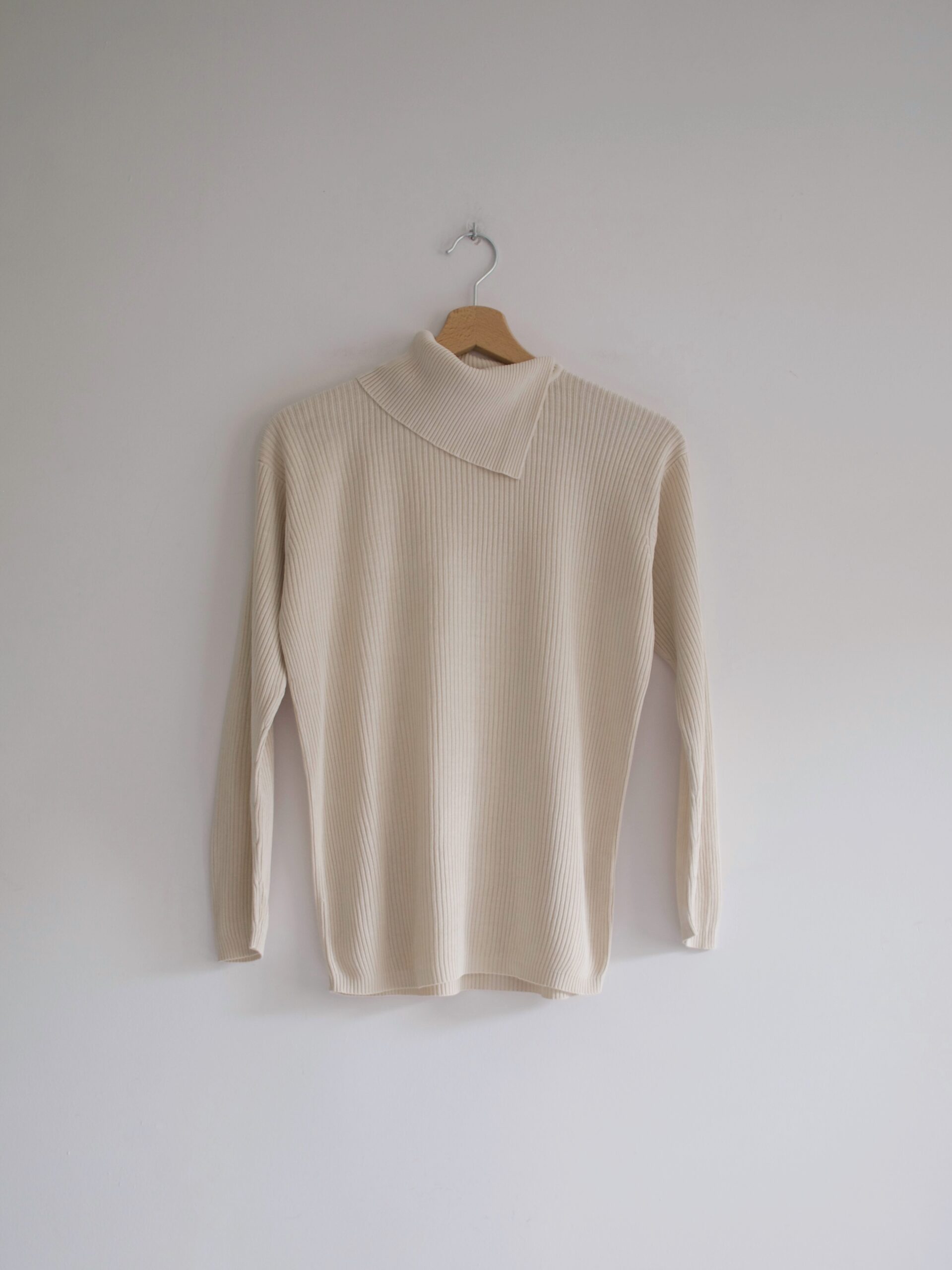 Minimalistyczny wełniany sweter z golfem. Idealny stan, materiał nie gryzie. Brak metki z rozmiarem, na oko jest to L, na mniejsze rozmiary idealny jako oversize (proszę sprawdzać wymiary).