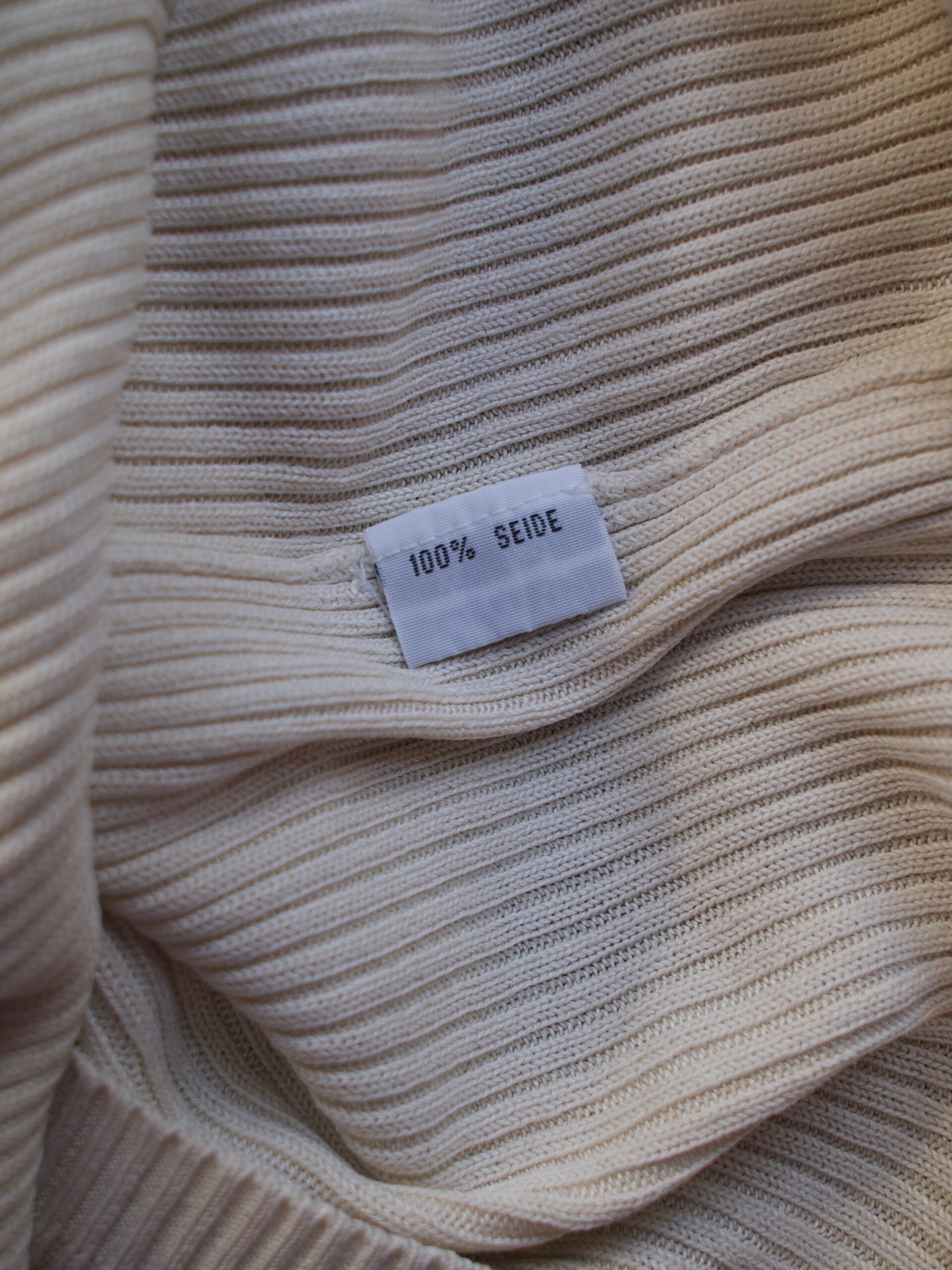 Minimalistyczny kaszmirowy sweter o pudełkowym kroju. Sweter bardzo miękki i przyjemny, ma dwie małe zacerowane dziurki, nie widoczne w noszeniu, poza tym brak mankamentów. Wymiary poniżej.
