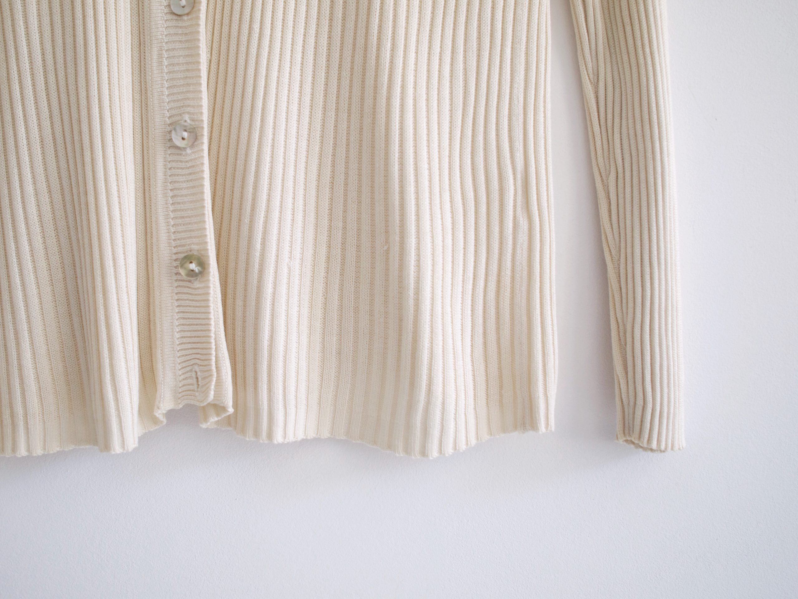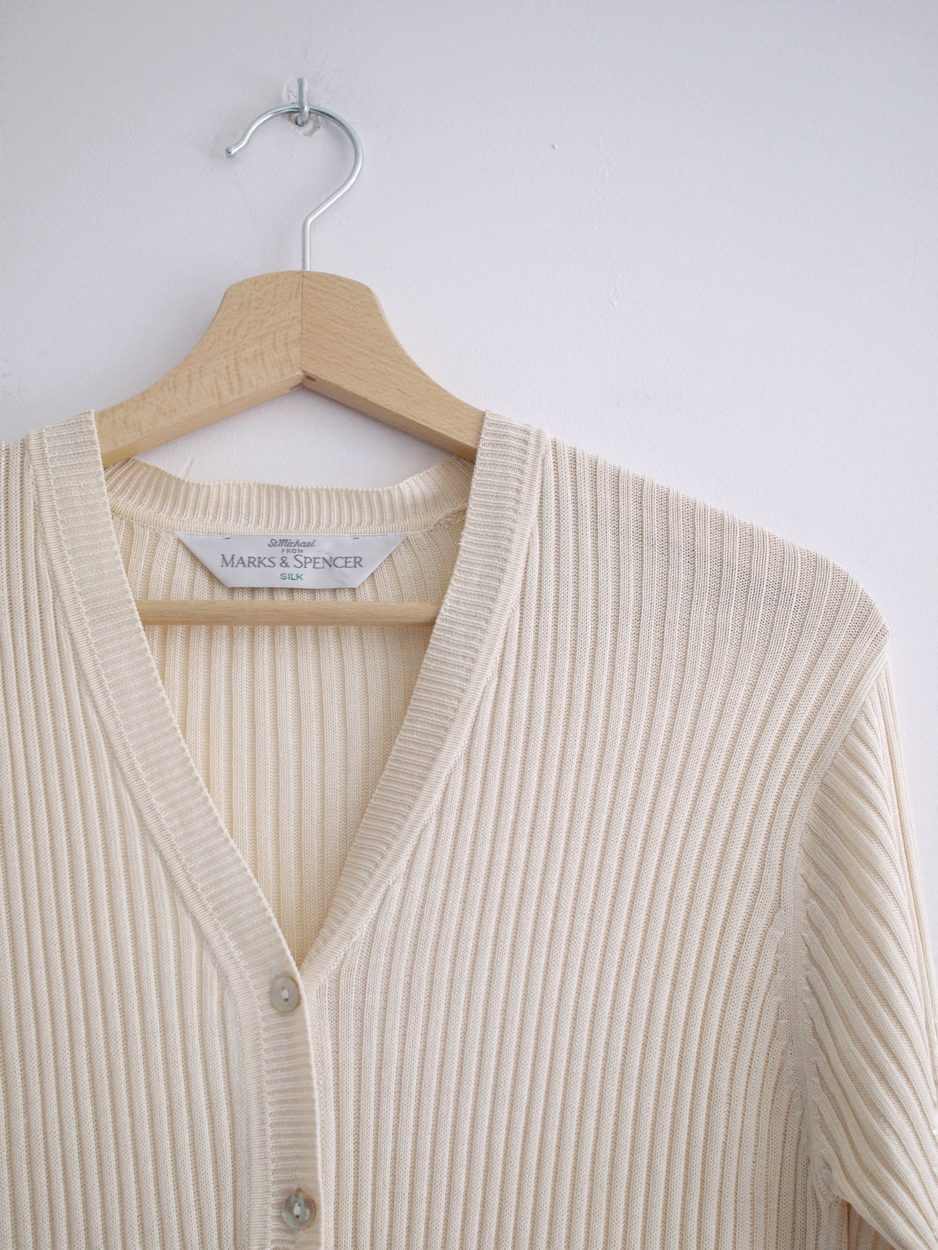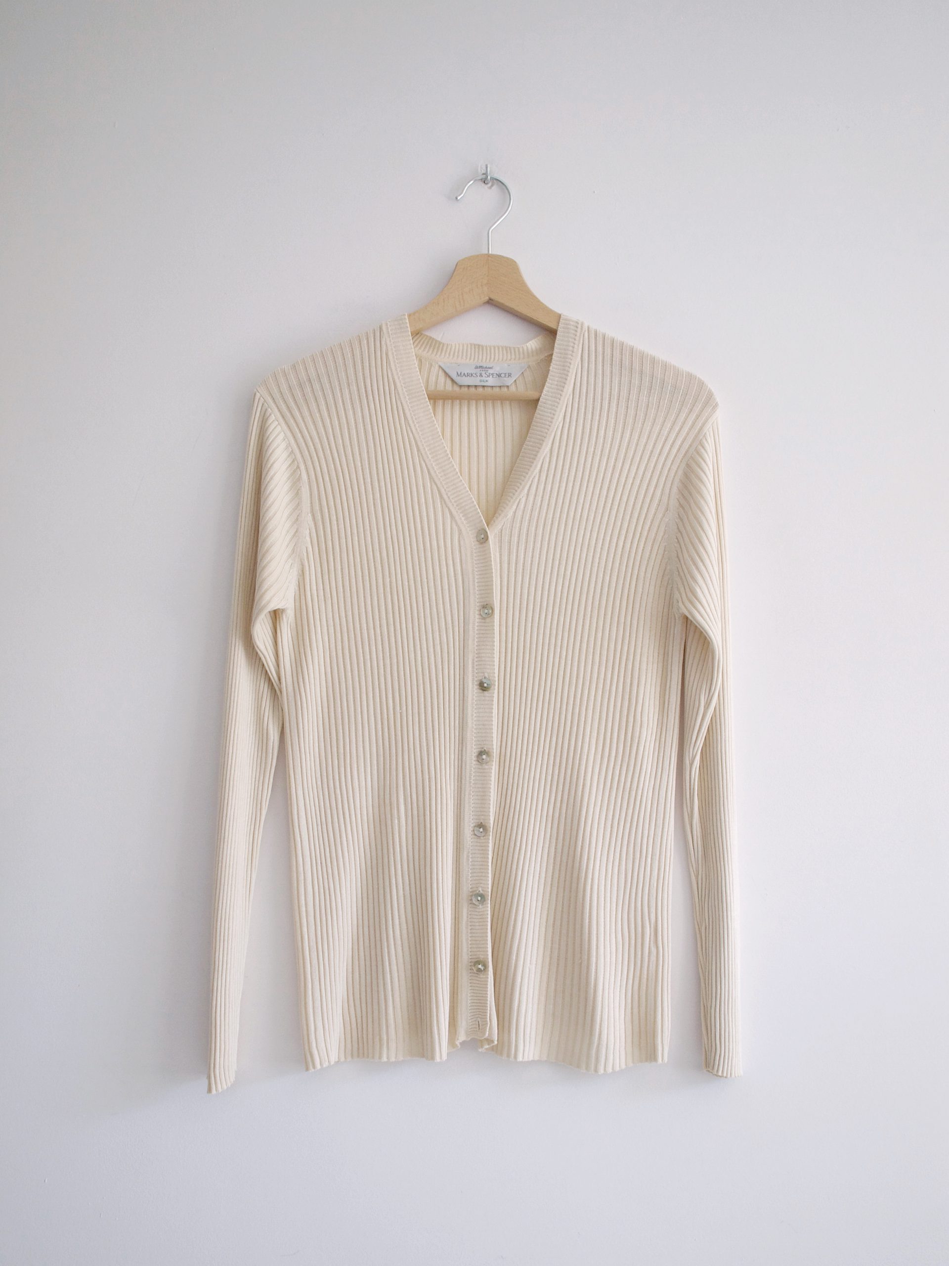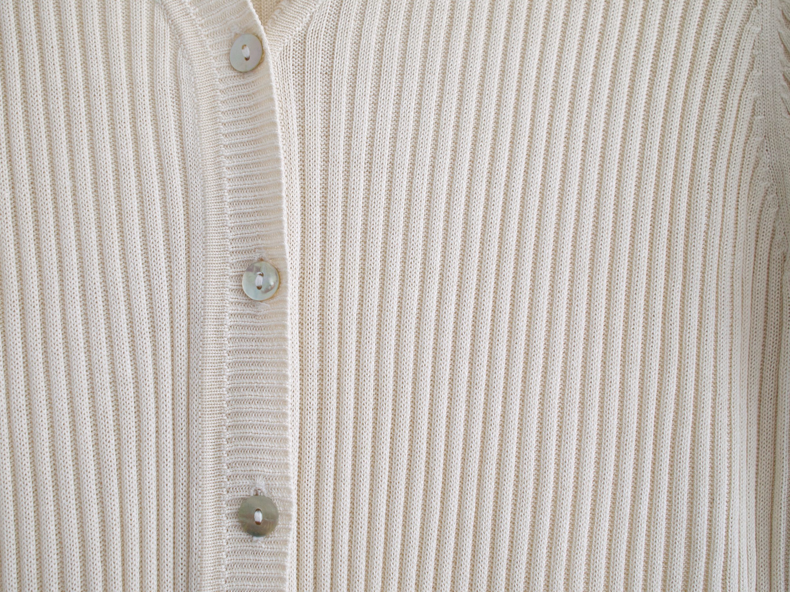 Rozpinany kremowy sweterek, w 100% wykonany z jedwabnej dzianiny. Metka z rozmiarem jest wycięta, proszę sugerować się wymiarami. Bez wad.