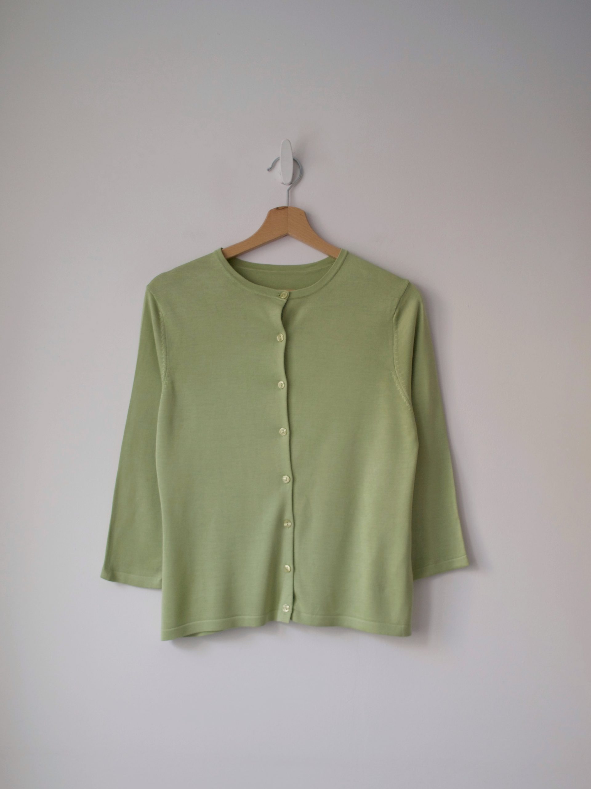 Jedwabny kardigan marki Marks&Spencer. Rękawy 3/4. Rozmiar z metki: 14 Skład: jedwab Stan: bardzo dobry Szerokość w klatce 44 cm Długośćcałkowita 55 cm
