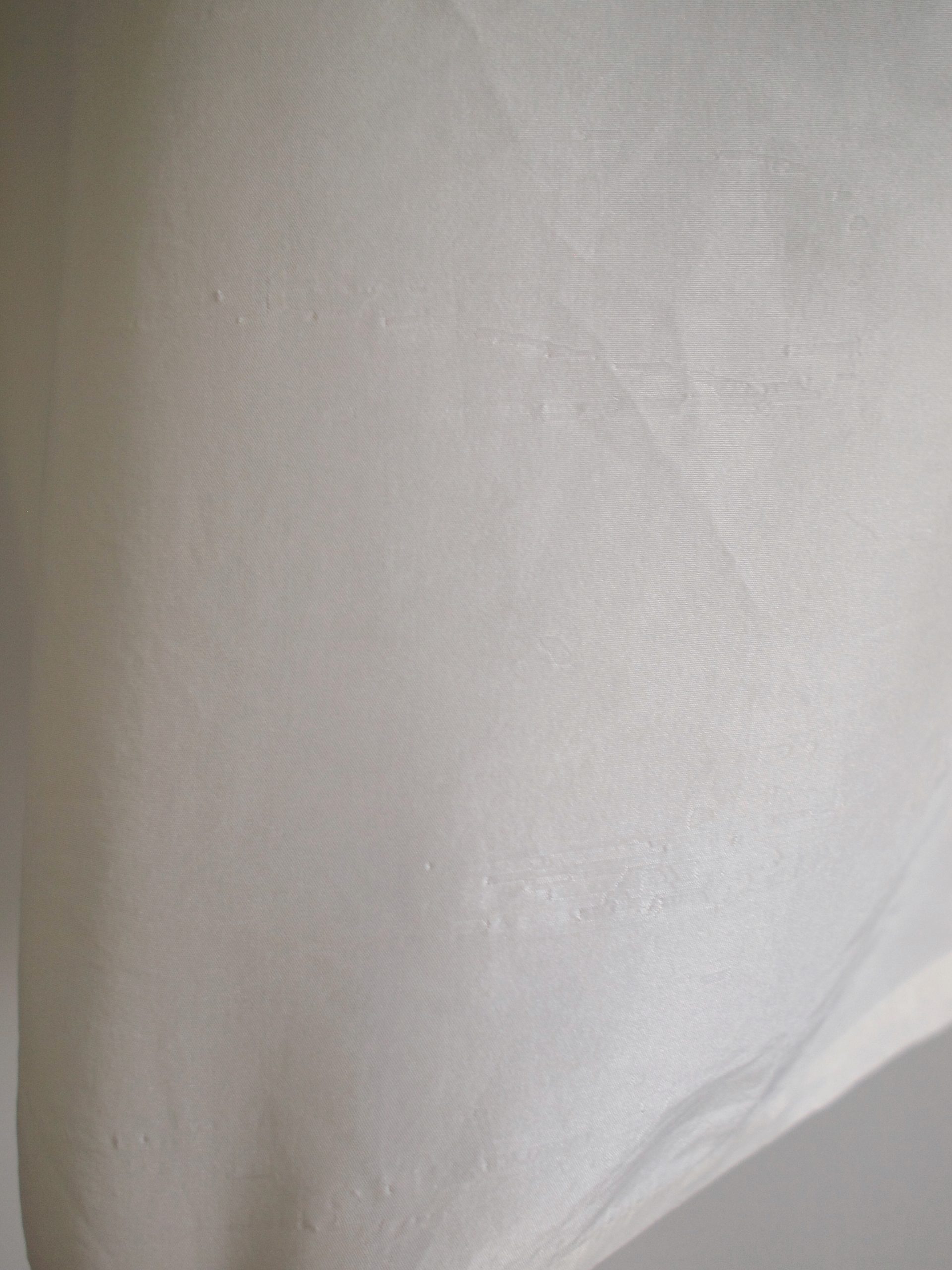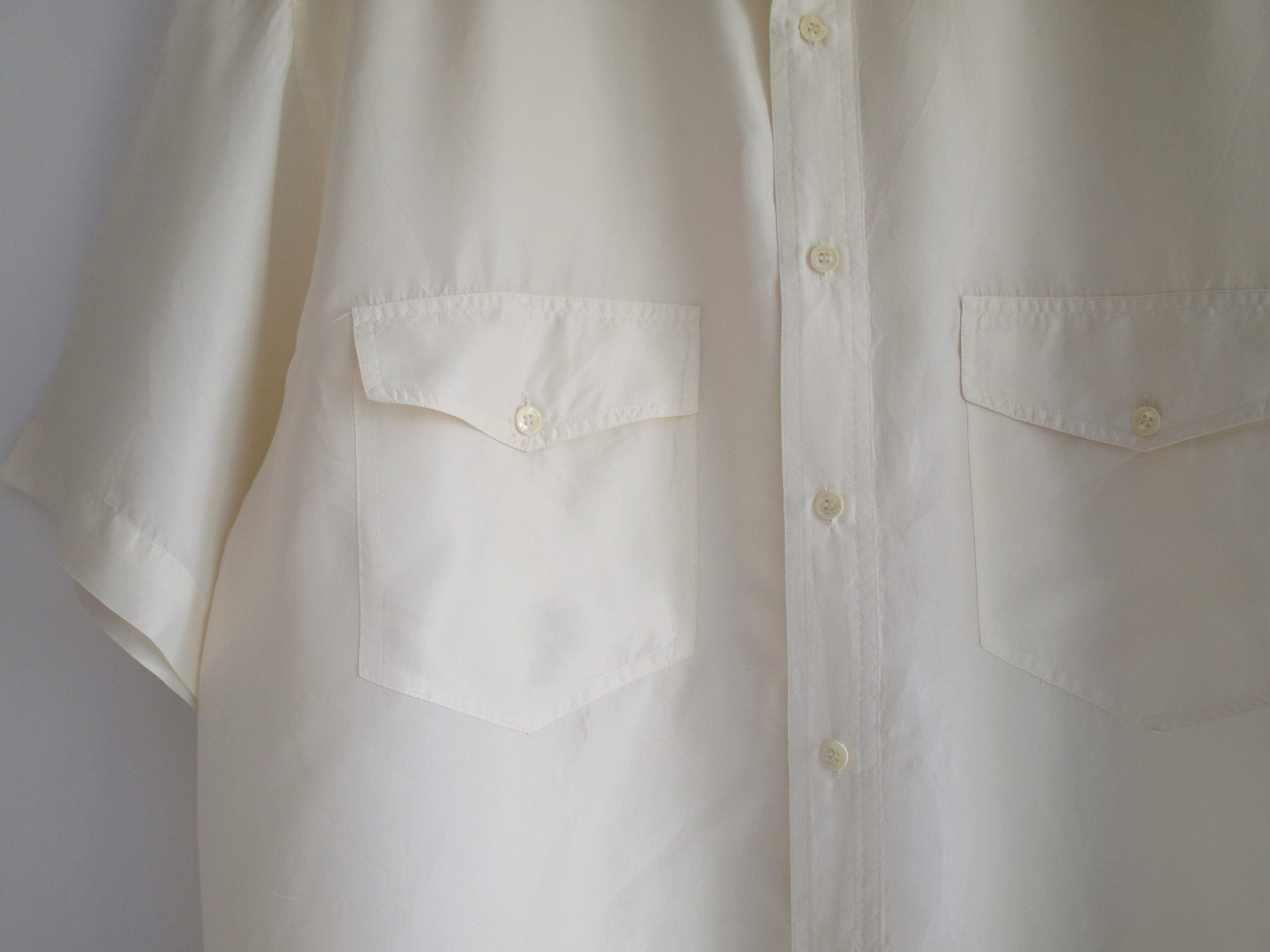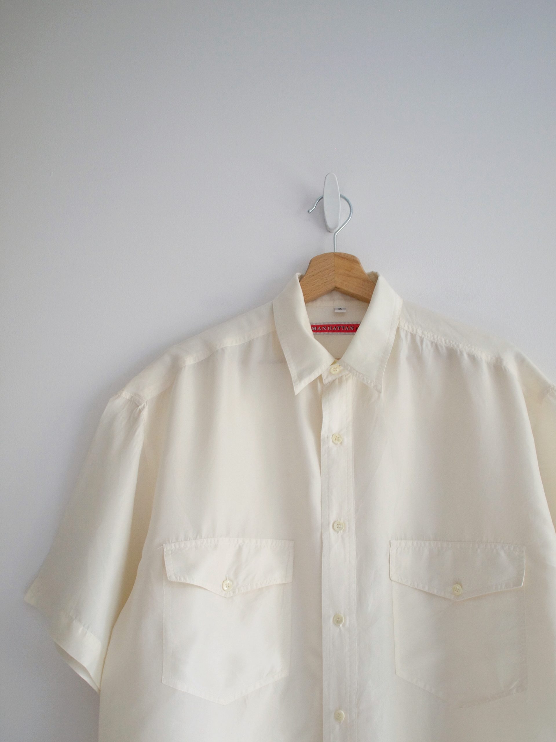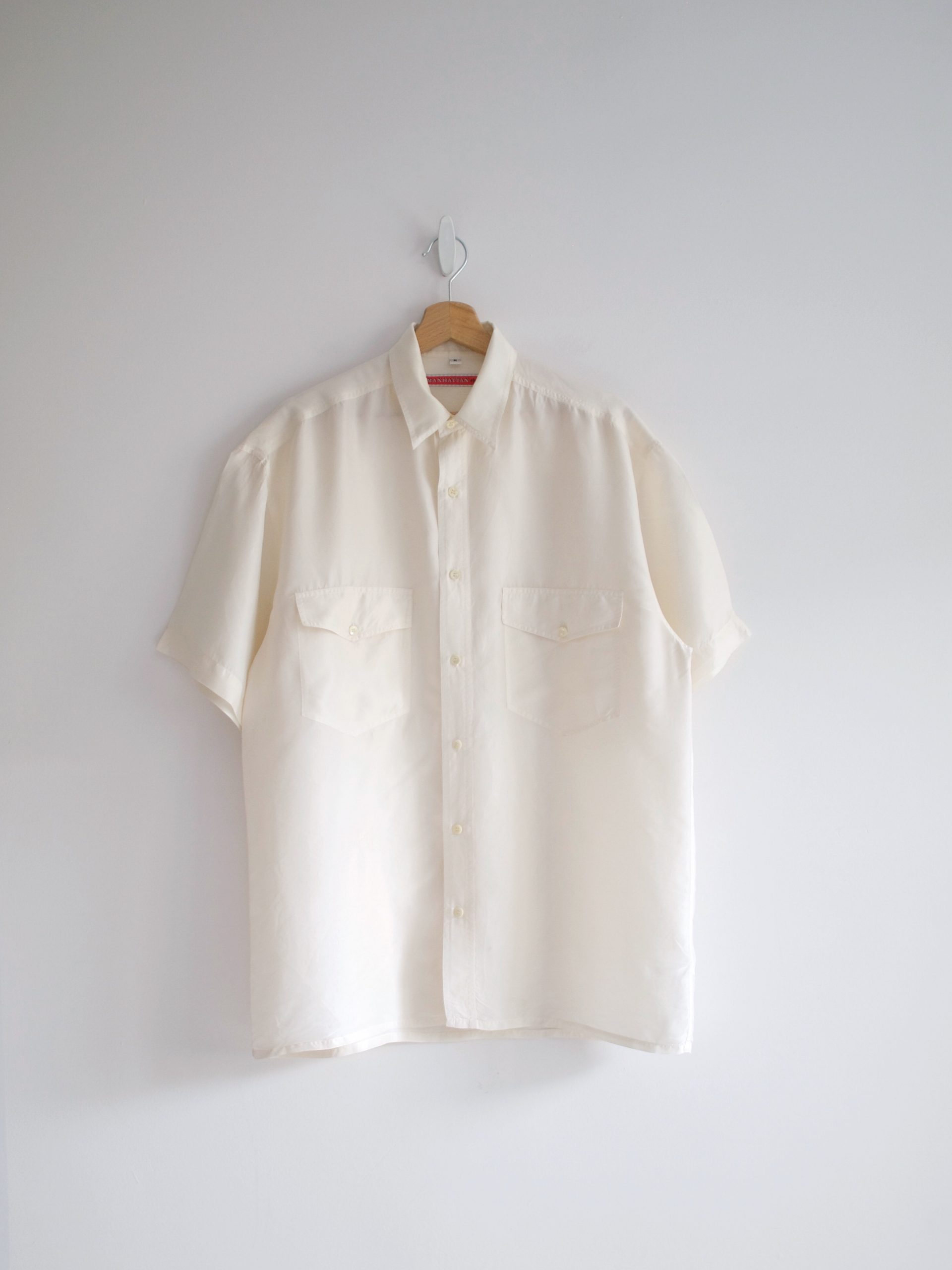 Jedwabna koszula vintage o pudełkowym fasonie. Z tyłu materiał ma charakterystyczne dla jedwabiu wgięcia, które są niewidoczne i nie wpływają na komfort noszenia (na zdjęciu).