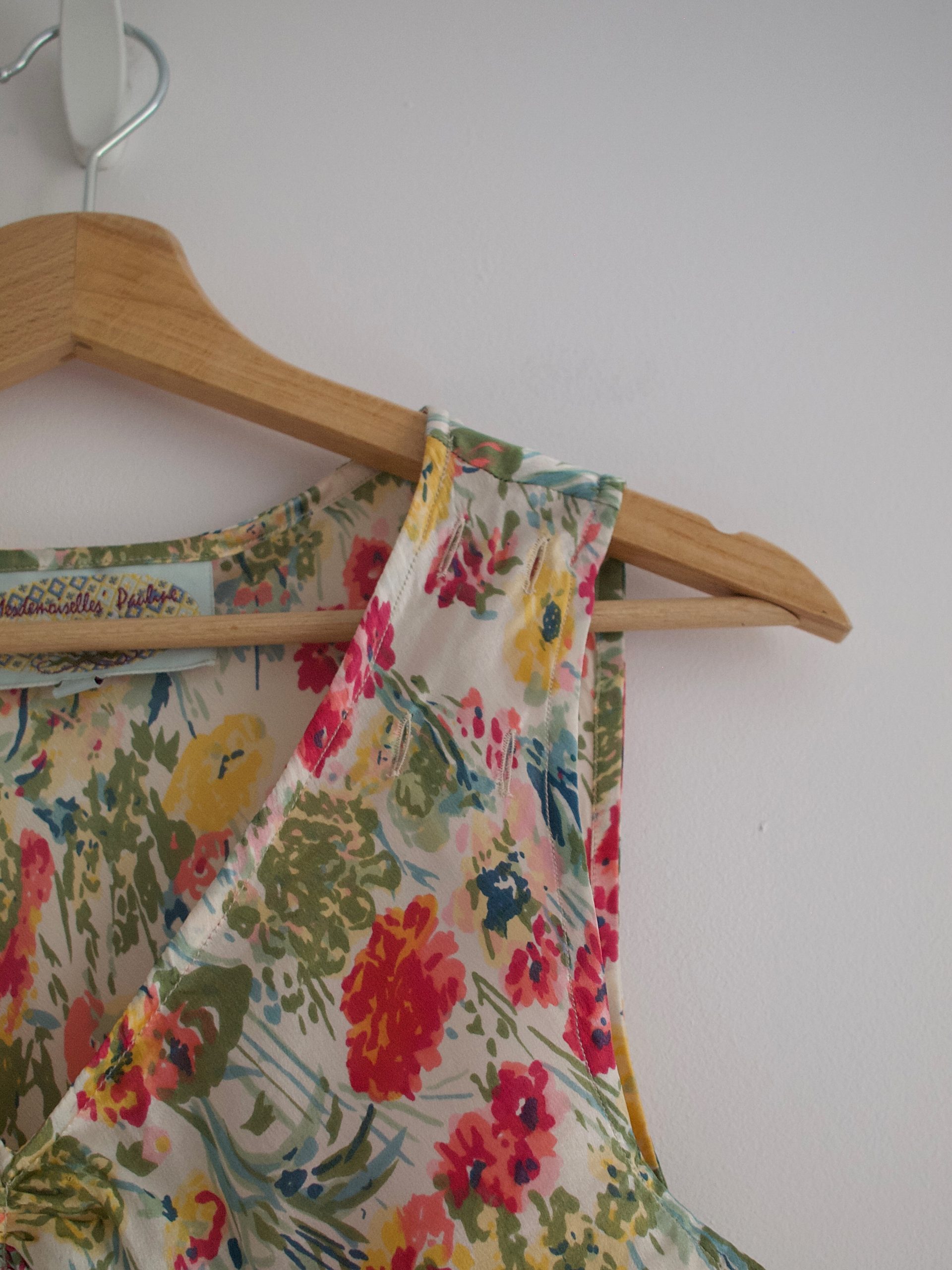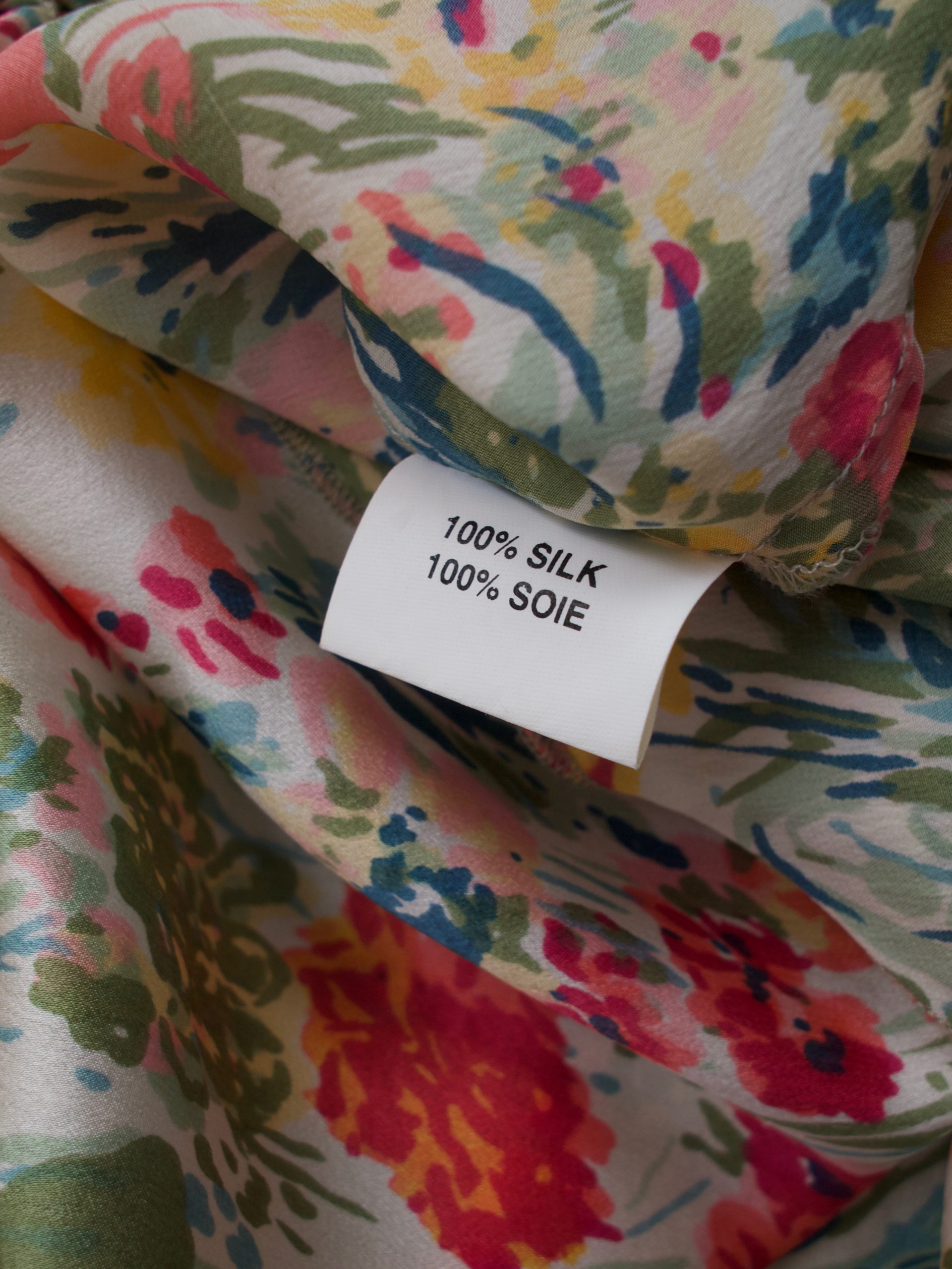 Jedwabny top w kwiatowy wzór. Rozmiar z metki: włoski 42, czyli M Skład: 100% jedwab Stan: bez wad Szerokość w klatce 44 cm Długość całkowita 55 cm
