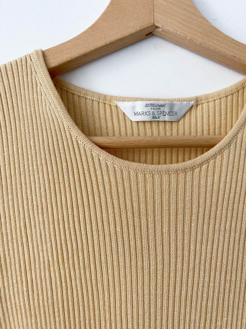 Złocista bluzeczka w prążki, w 100% wykonana z jedwabiu. Rozmiar z metki 16, bardzo dobry stan. Stanowi komplet razem z kardiganem https://reclo.store/produkt/100-silk-31/