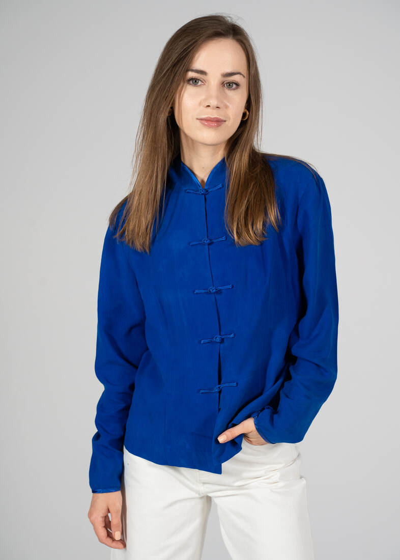 Jedwabna marynarka vintage w orientalnym stylu. Materiał jest matowy, aksamitny w dotyku. Rozmiar z metki XL, na pewno bedzie zbyt ciasna, więc polecam sugerować się wymiarami. Bardzo dobry stan.