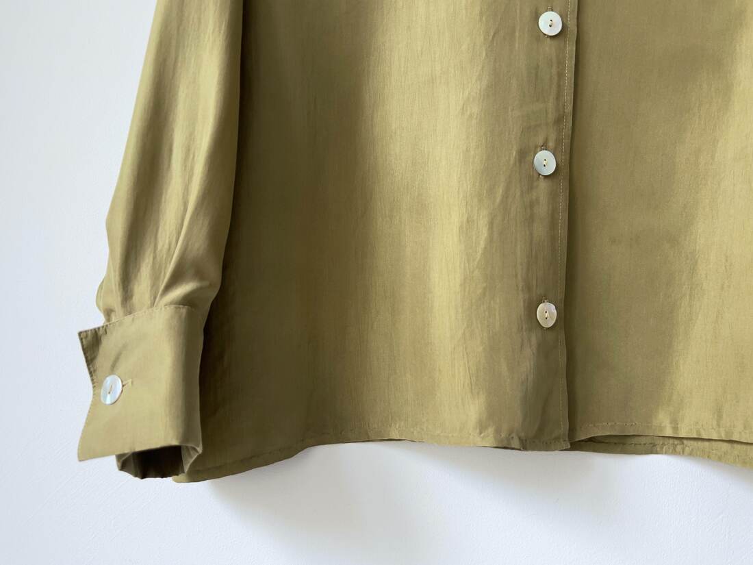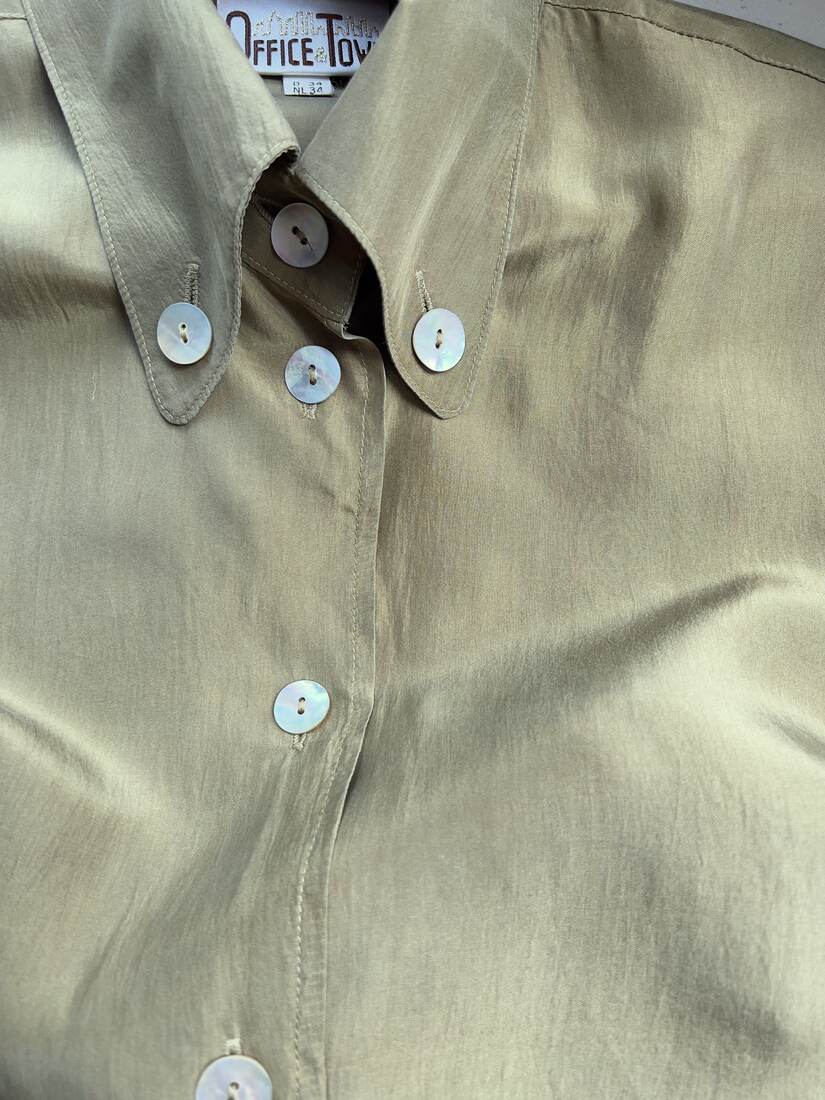 Jedwabna koszula vintage. Zapinana na guziki z naturalnej muszli. Rozmiar z metki 34, fason jest bardzo luźny, więc będzie pasować również na M oraz L. Bardzo dobry stan.