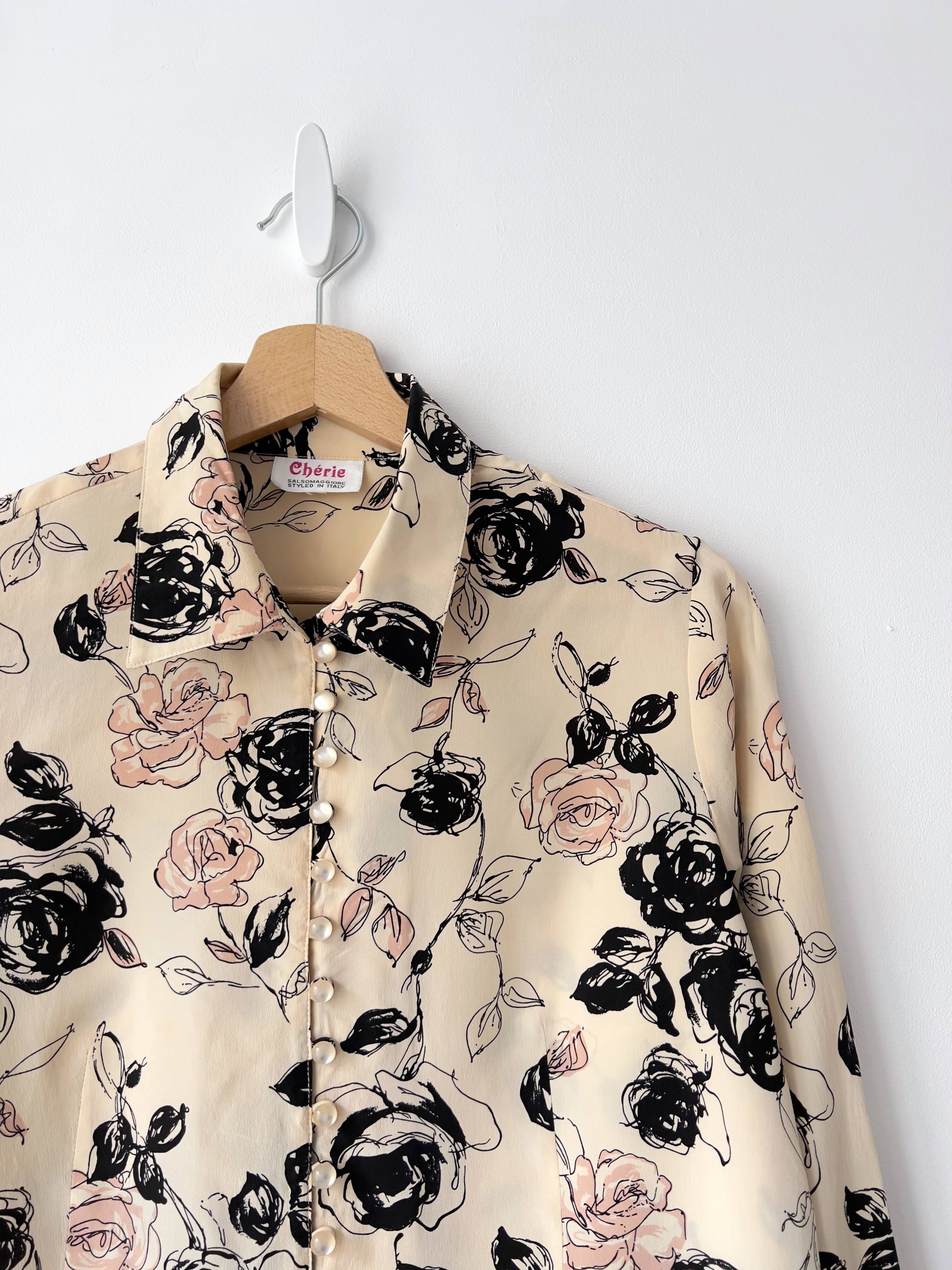 Jedwabna koszula vintage. Zapinana na piękne perłowe guziki. Brak metki z rozmiarem, proszę sugerować się wymiarami. Bez wad.