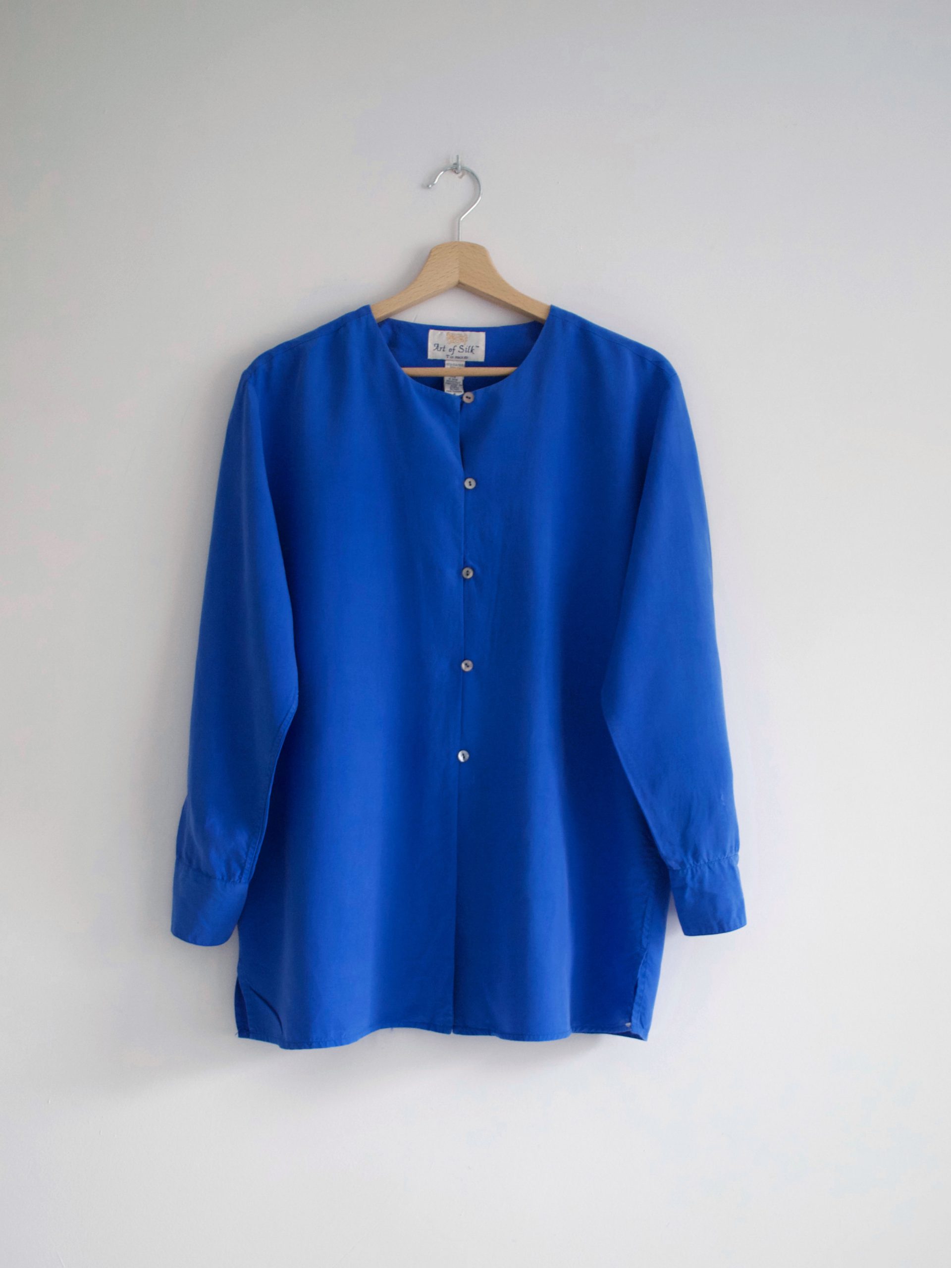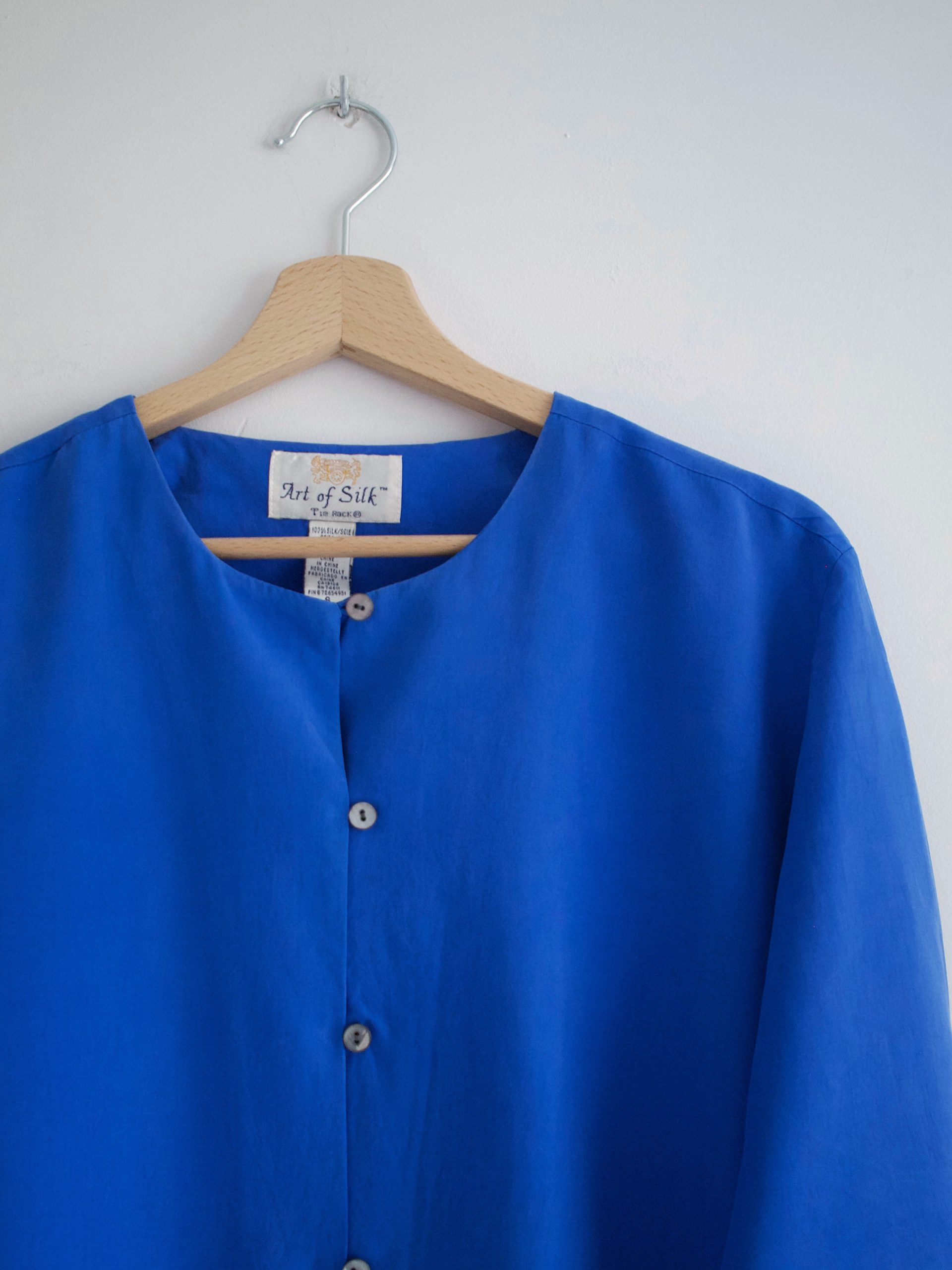 Jedwabna bluzka vintage. Materiał jest dość gruby, może być noszona również jako lekkie okrycie wierzchnie. Rozmiar z metki S, fason jest obszerny, więc polecam jako one size.