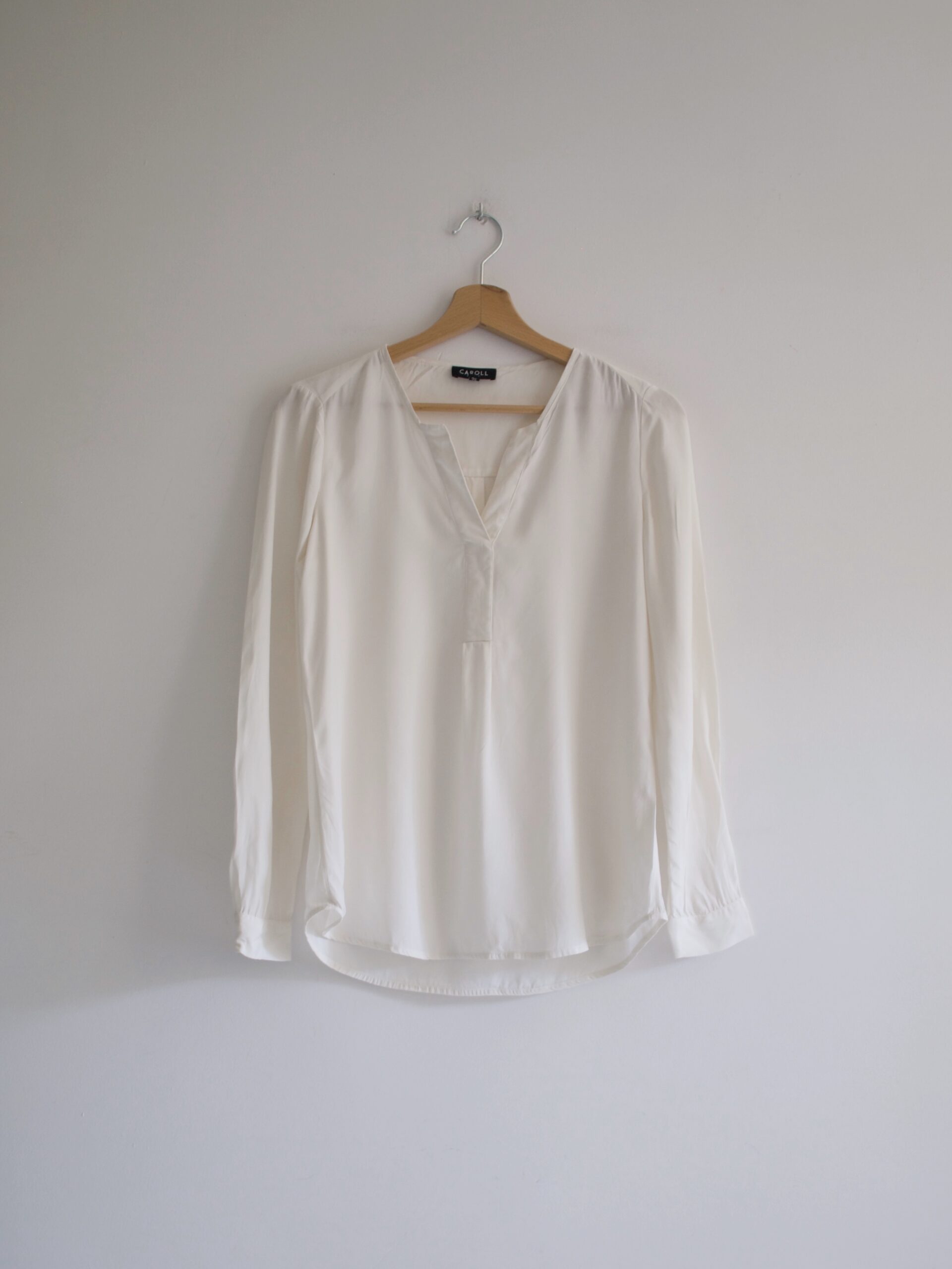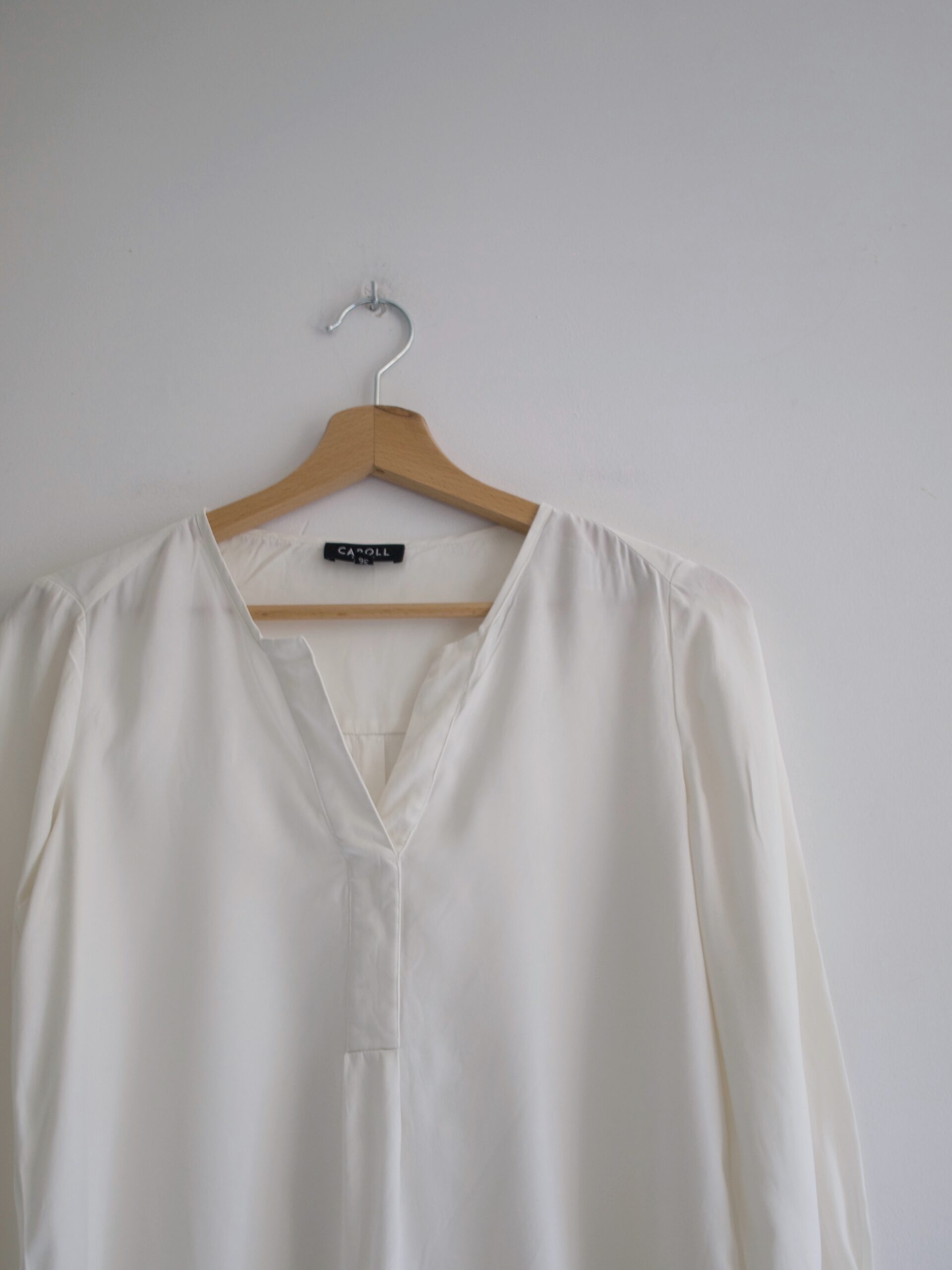 Jedwabna bluzka Rozmiar: 36 Skład: 100% jedwab Stan: bardzo dobry Szerokość w klatce 46 cm Długość całkowita 64 cm