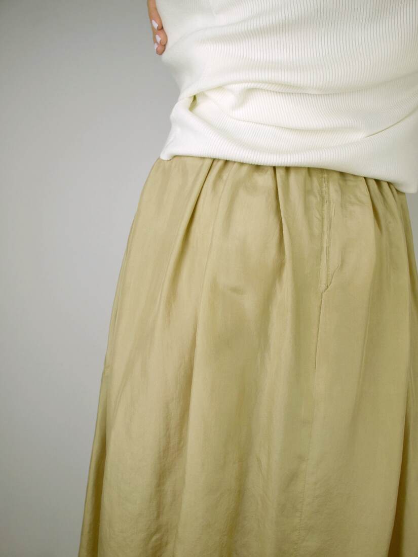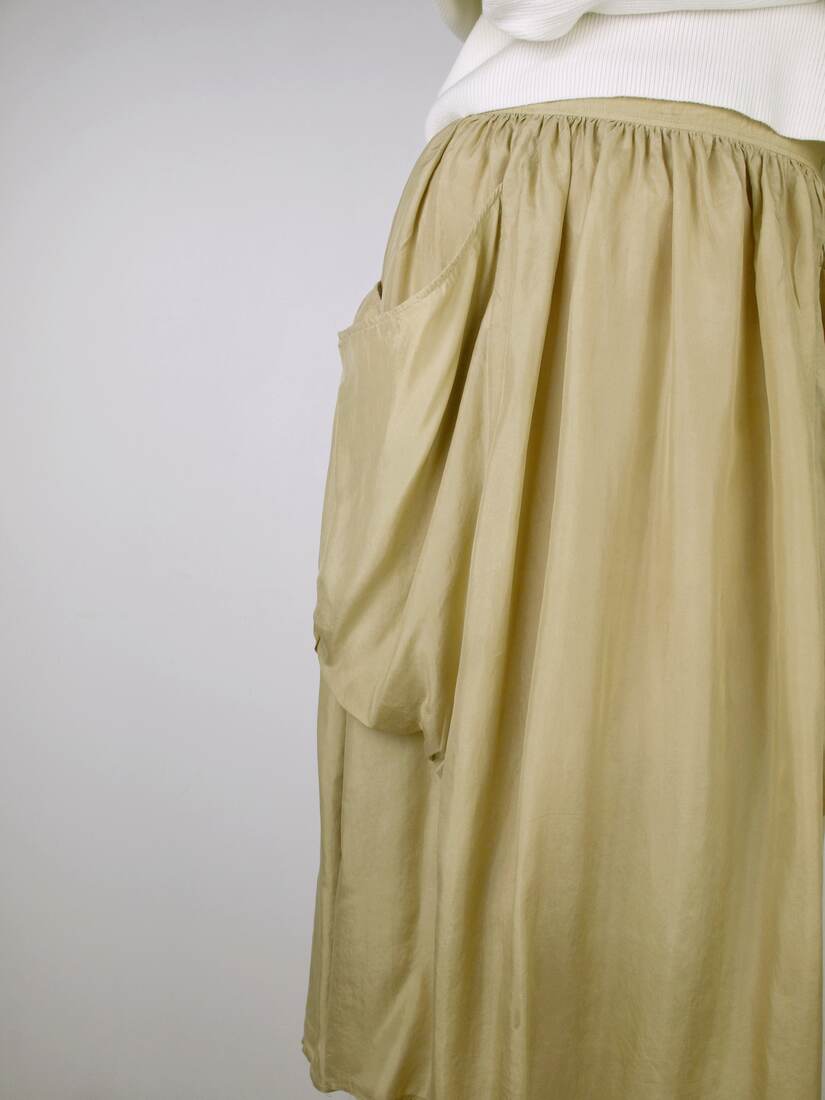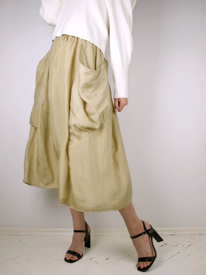 Lekka spódnica vintage, w 100% szyta z jedwabiu w złocistym kolorze. Zapinana na suwak, bez podszewki. Rozmiar z metki 40, na modelce jest spięta do zdjęcia. Bez wad.