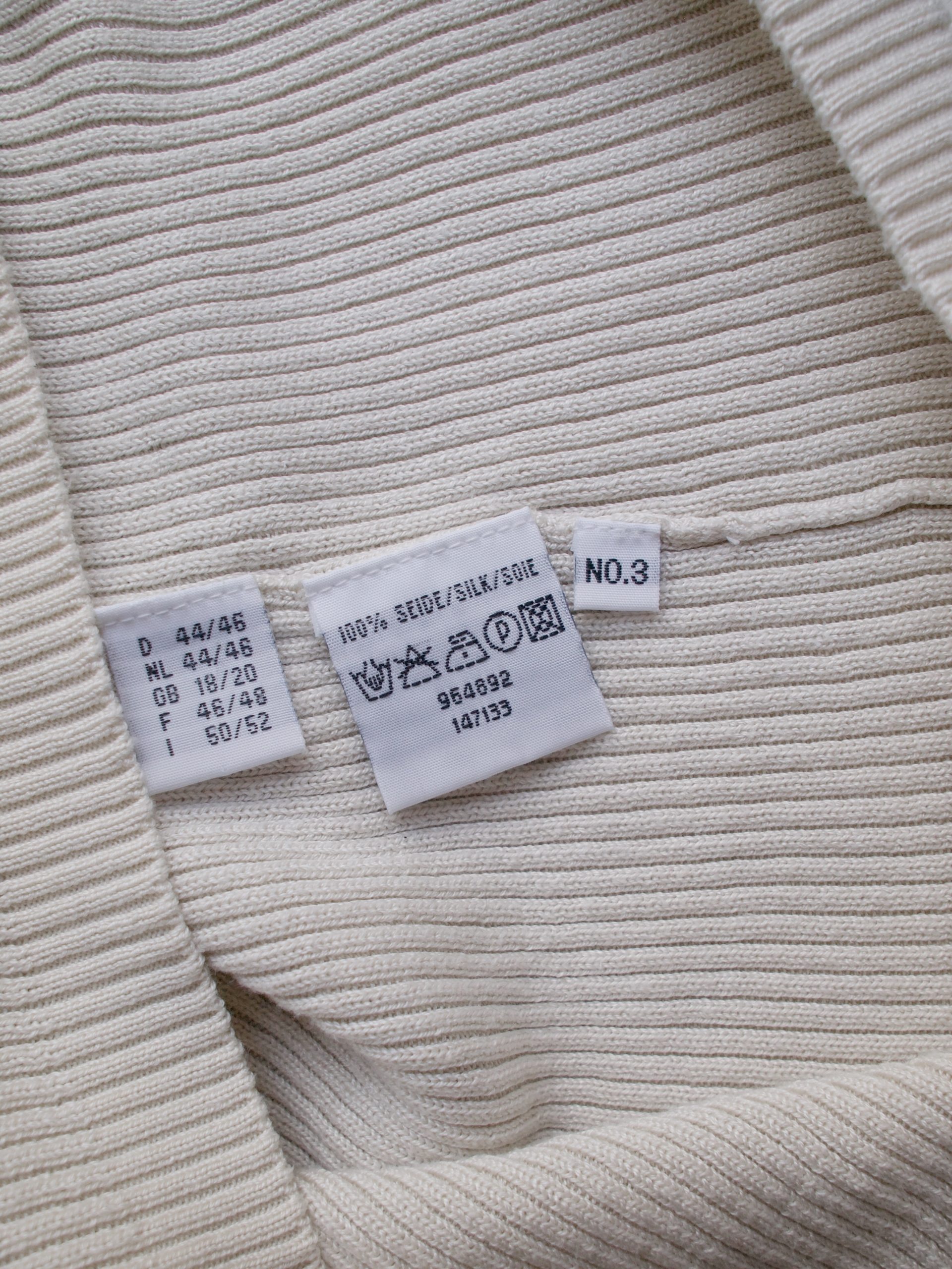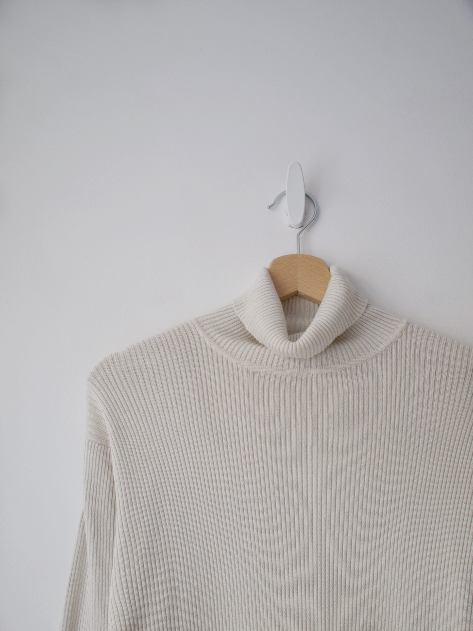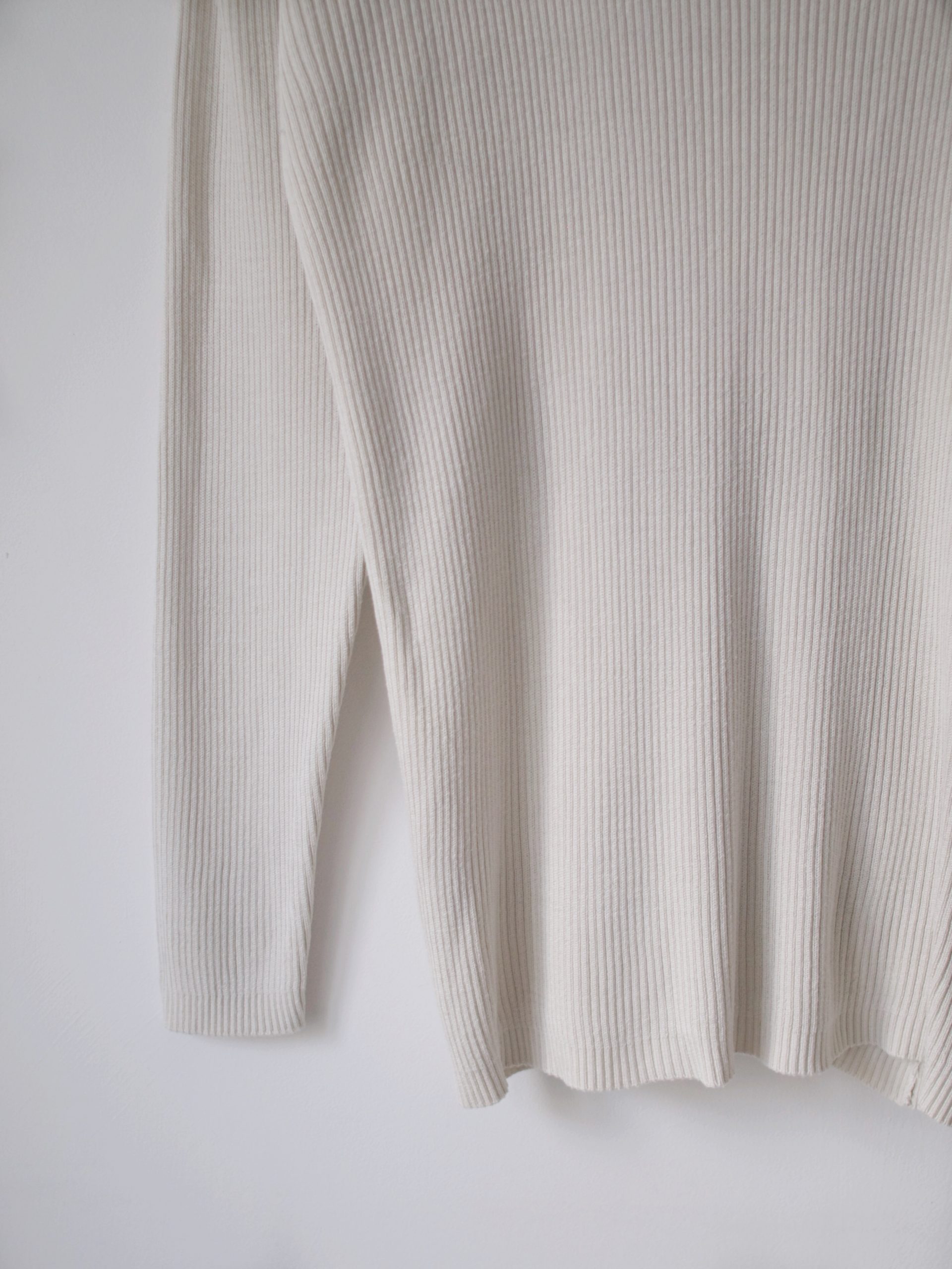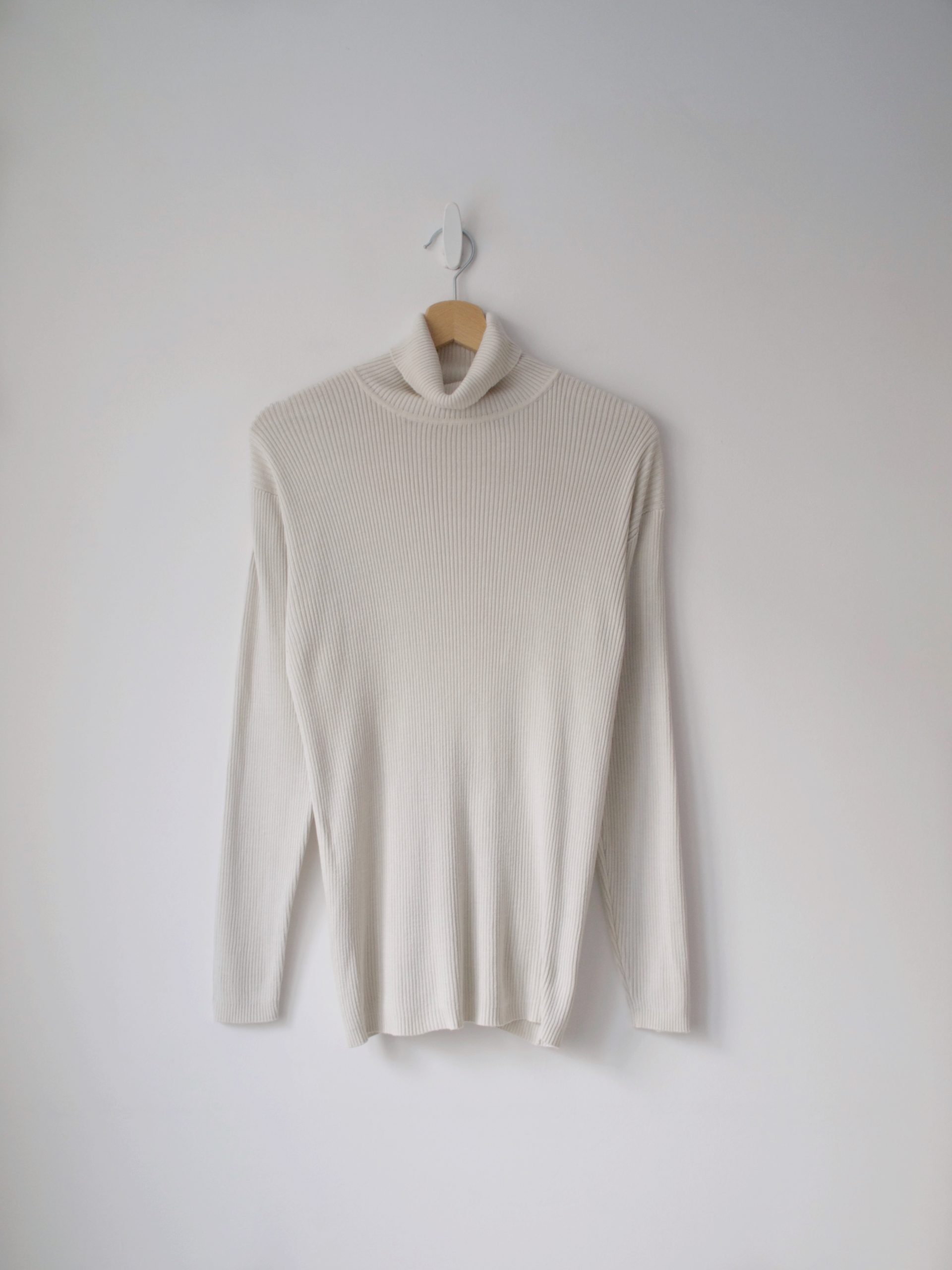 Golf vintage w kolorze złamanej bieli. W 100% wykonany z jedwabiu. Rozmiar z metki: 44/46 Skład: 100% jedwab Stan: bardzo dobry Szerokość w klatce 45 cm Długośćcałkowita 67 cm