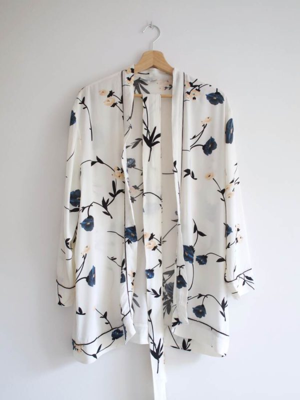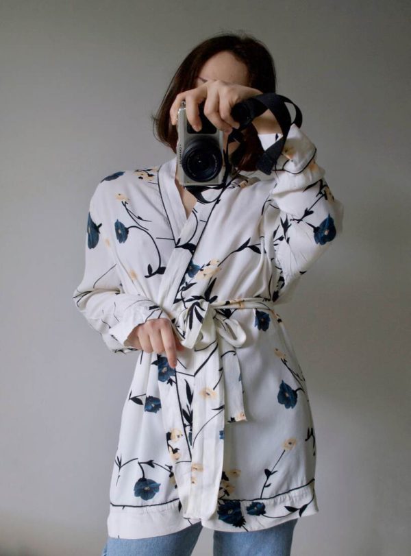 Bluzka/kimono renomowanej marki Ganni. Posiada pasek oraz szlufki. Rozmiar z metki 40, jest dość uniwersalny. Idealny stan. Modelka nosi rozmiar XS-S. Skład: 100% wiskoza.