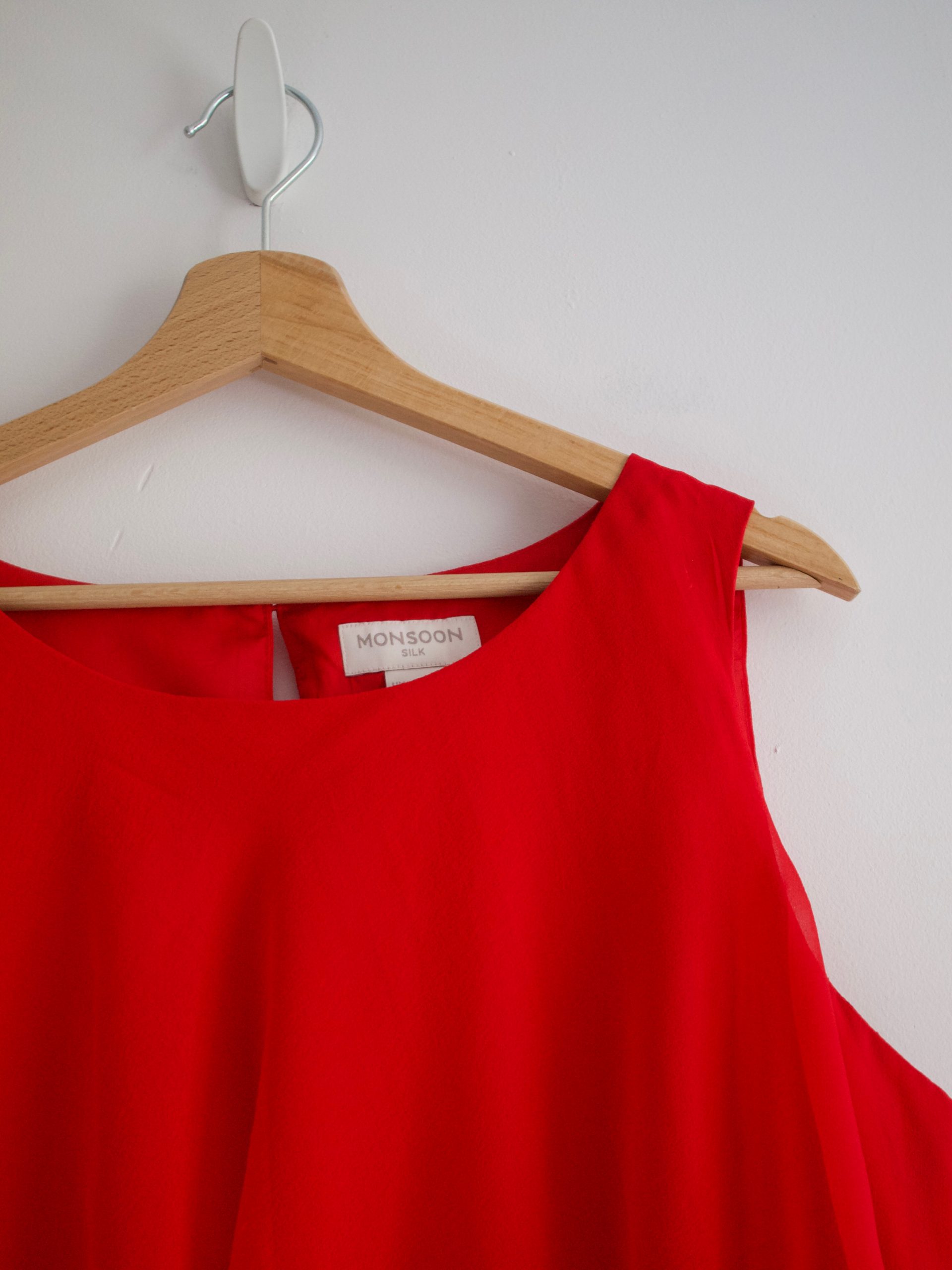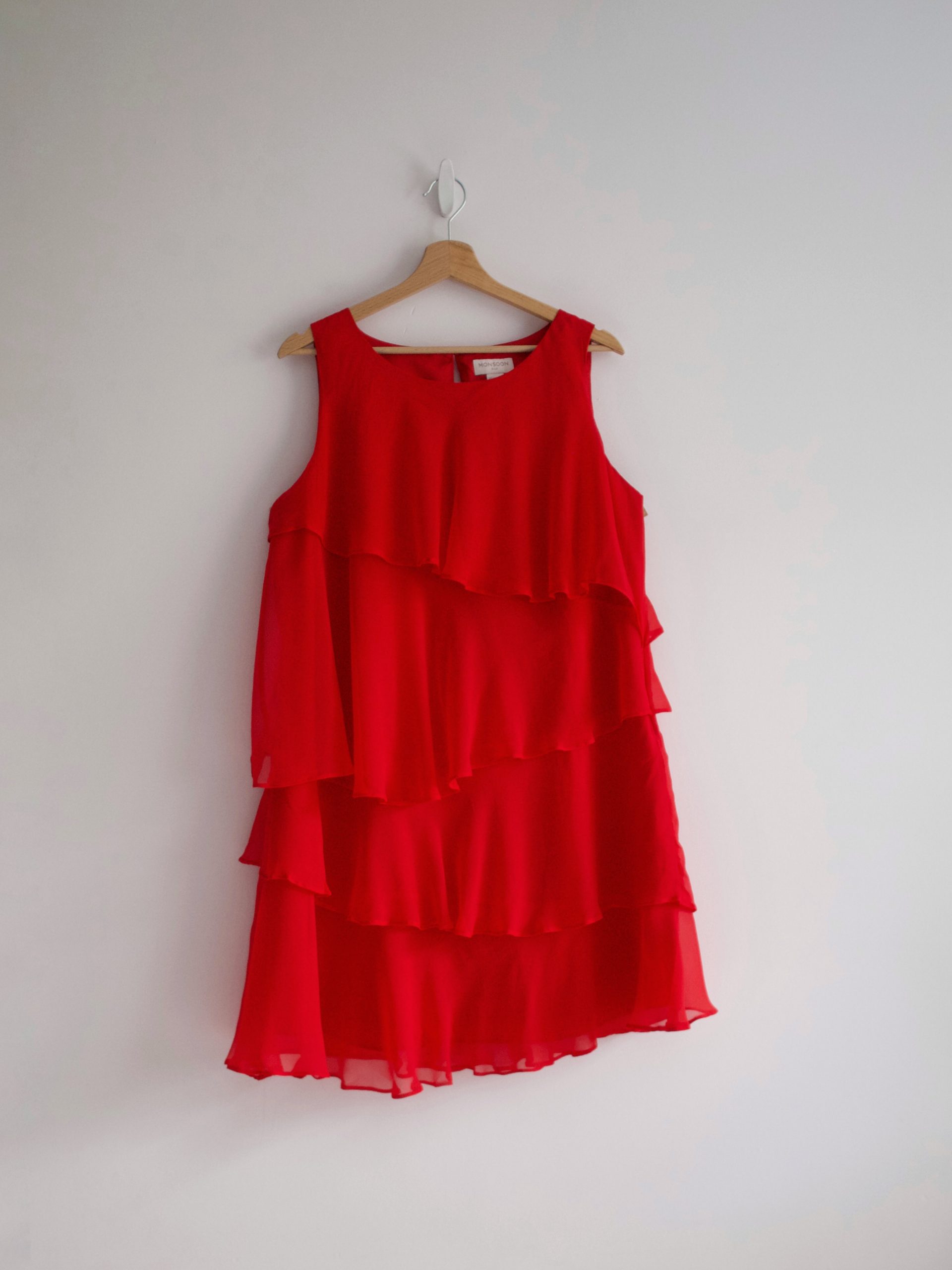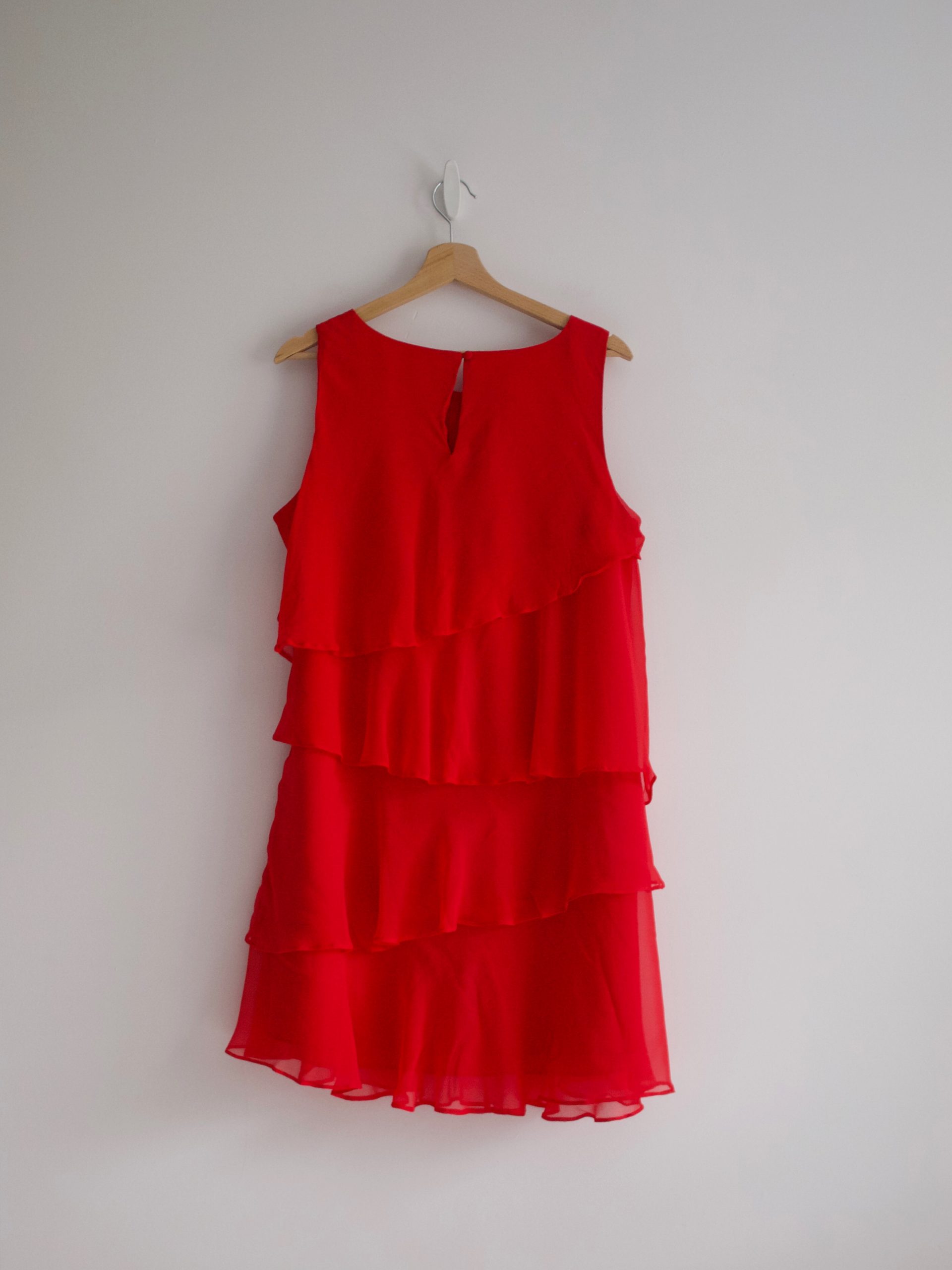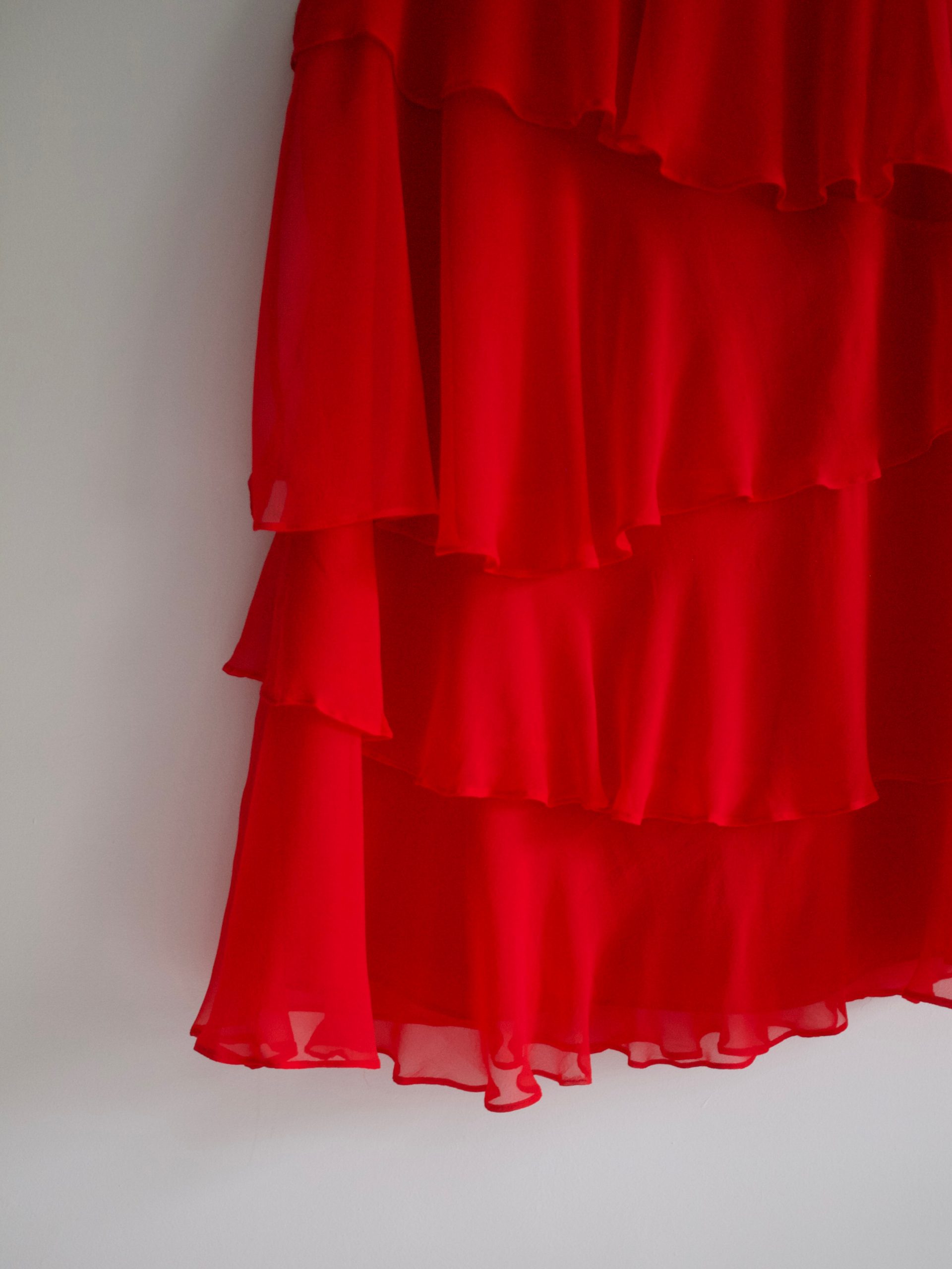 Jedwabna sukienka z falbanami. Z podszewką, zapinana na boczny zamek Rozmiar z metki: 46 Skład: 100% jedwab, podszewka acetat Stan: bez wad Szerokość w klatce 52 cm Długośćcałkowita 93 cm