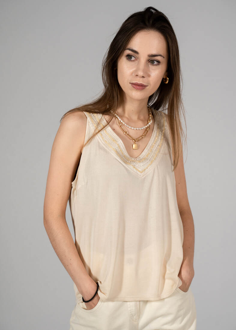 Kremowa bluzka wykonana z jedwabnej dzianiny. Dekolt zdobiony koralikami i cekinami. Polecam na L-XL, bez wad.