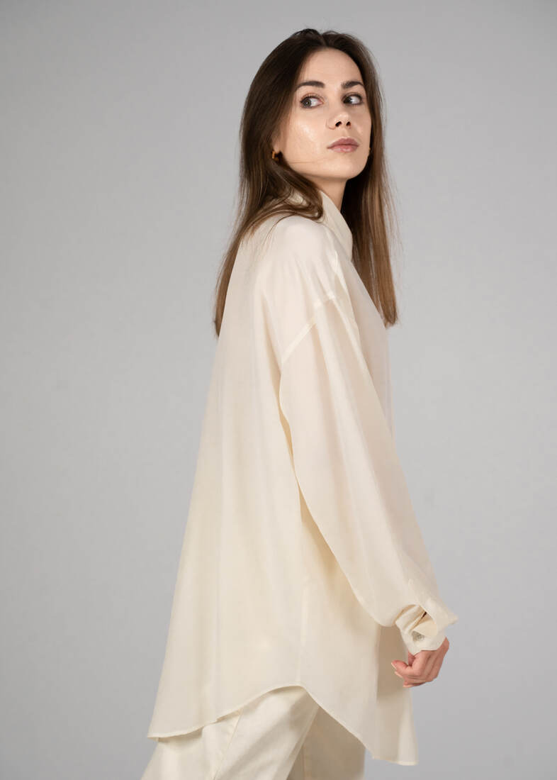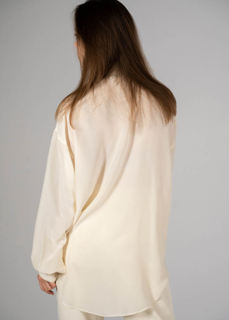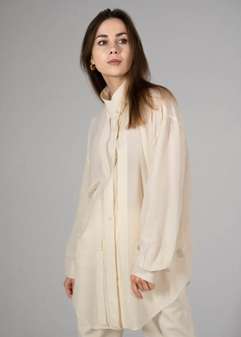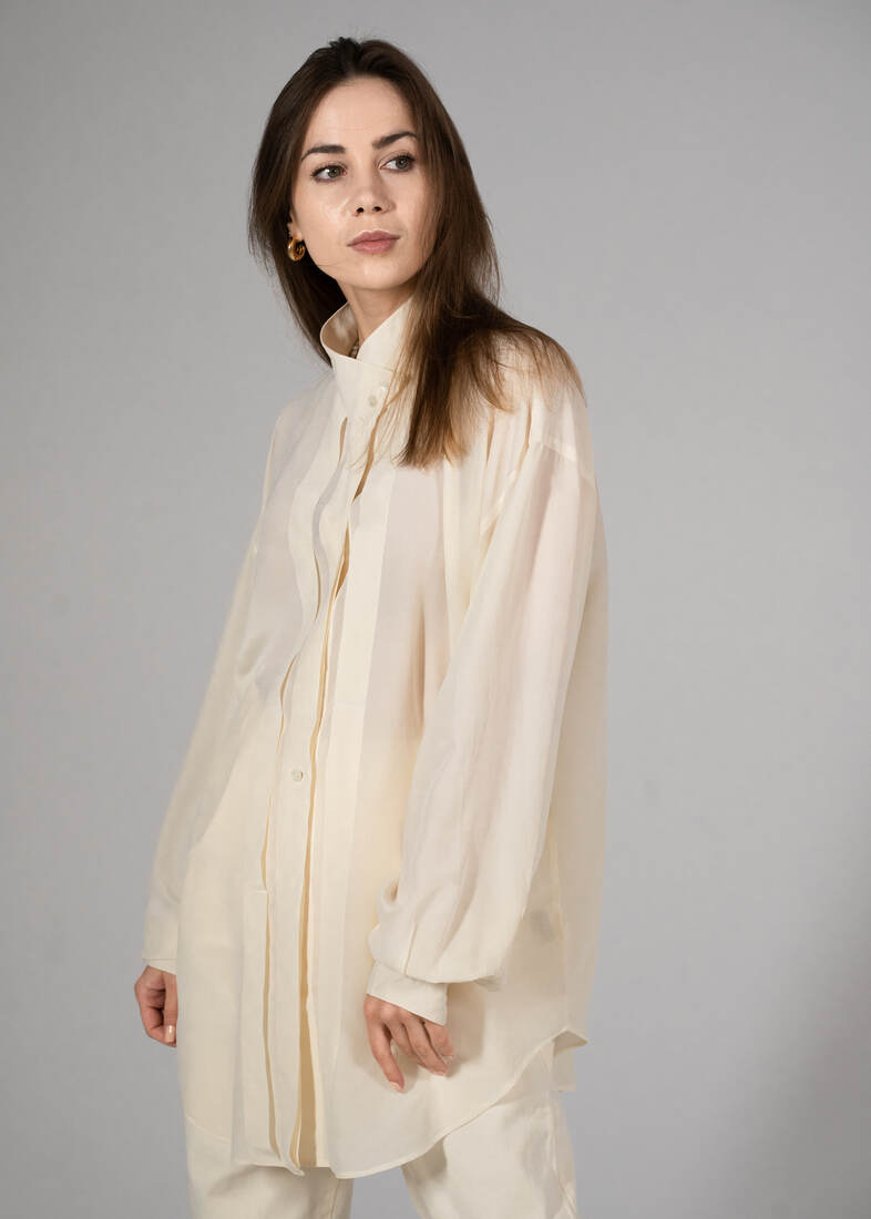 Jedwabna koszula vintage o obszernym kroju. Z przodu ozdobne plisy, wysoki kołnierz stójka. Polecam na XL lub jako overszie. Bez wad.