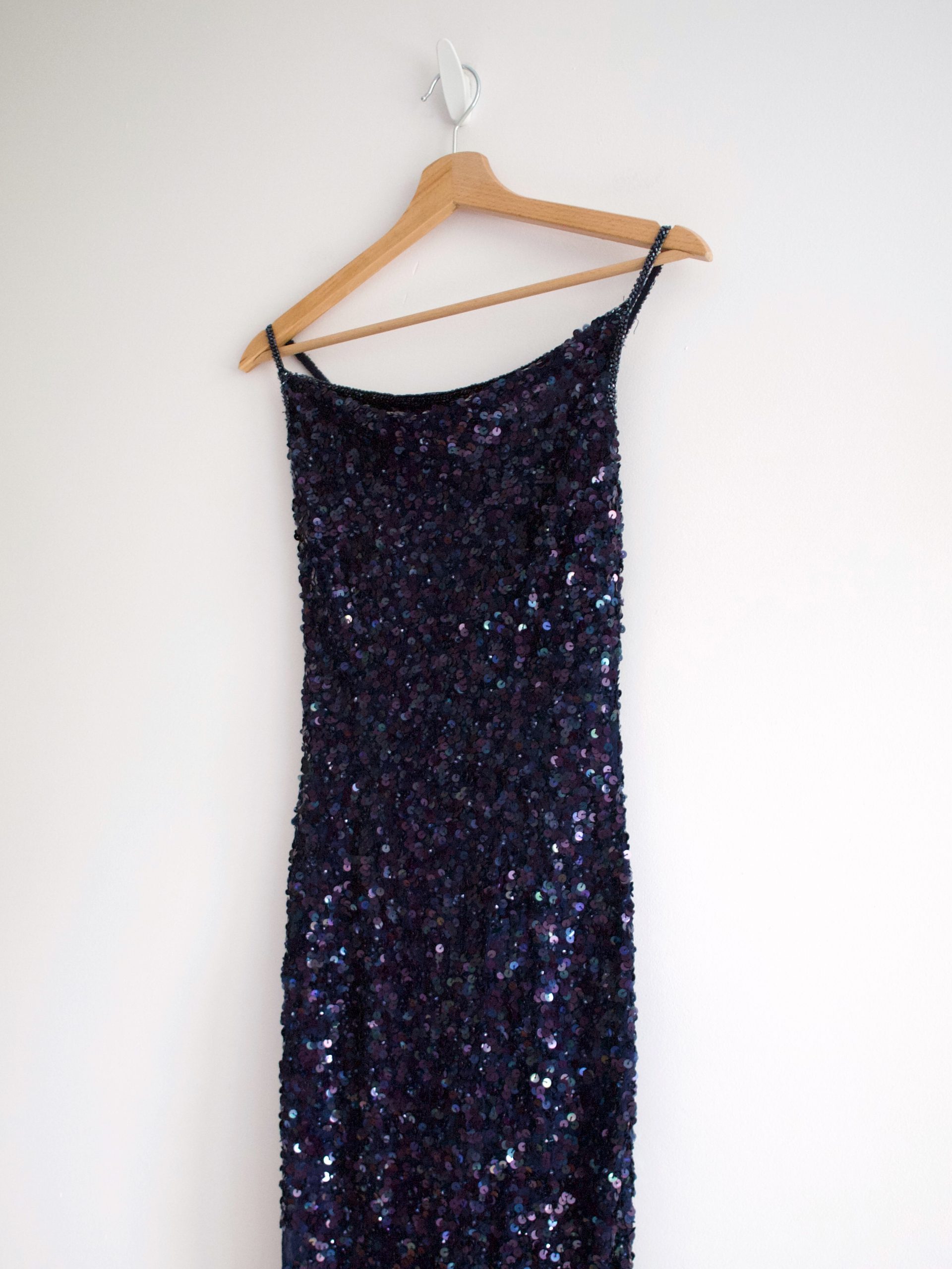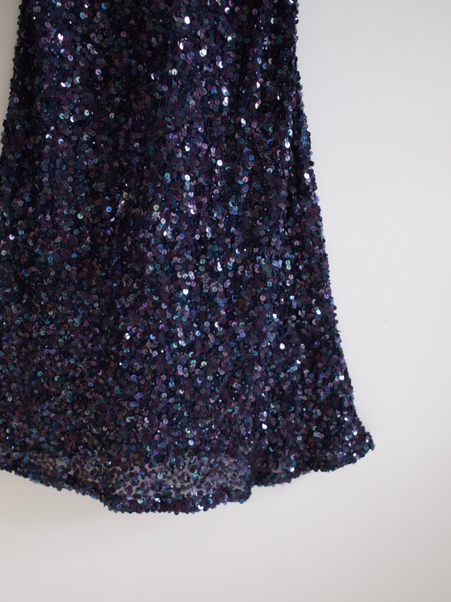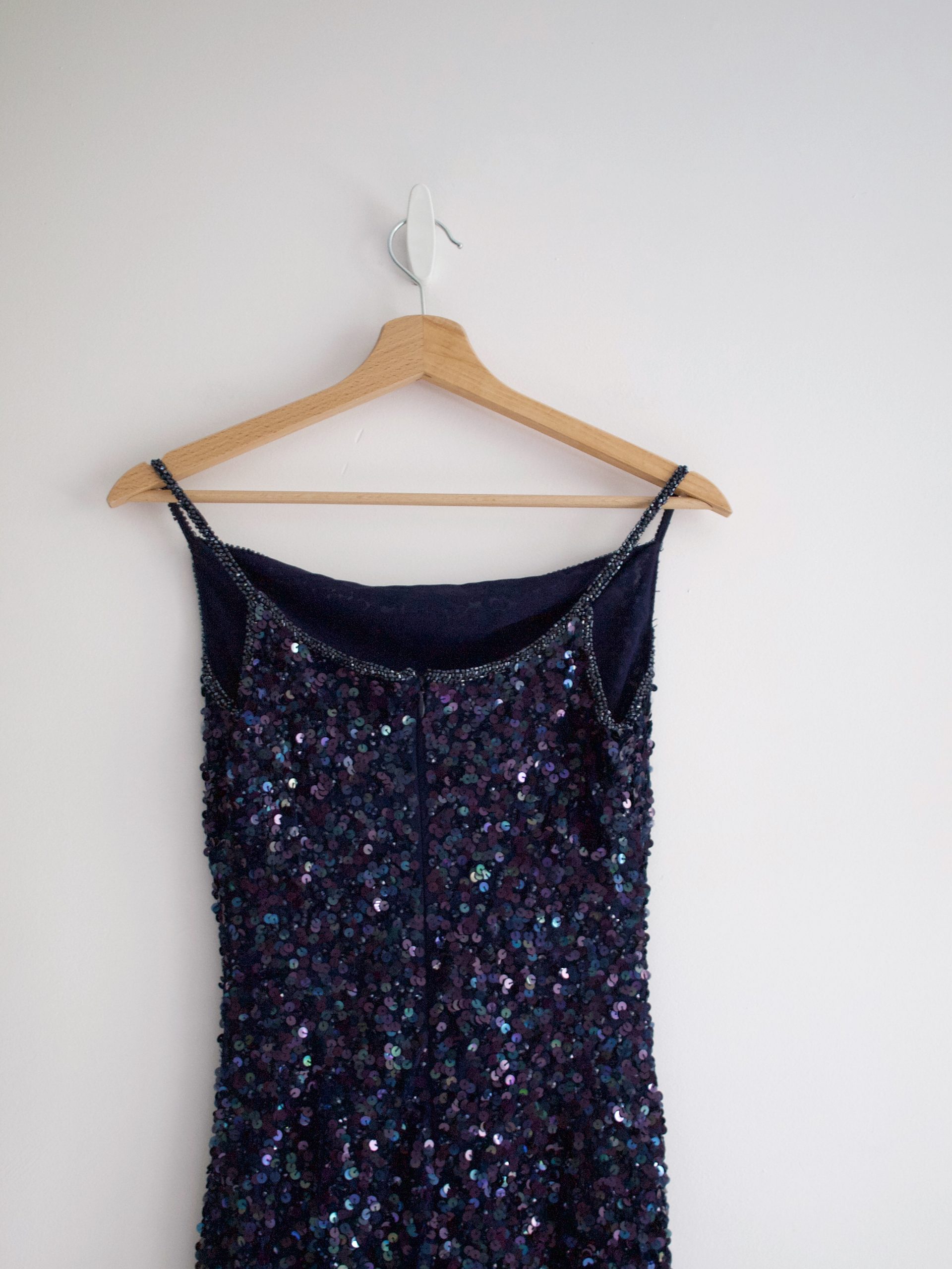 Unikatowa sukienka vintage, w 100% wykonana z jedwabiu, ręcznie zdobiona cekinami na całej powierzchni. Piękny kolor – sukienka mieni się i opalizuje w ruchu. Z tyłu zapinana na zamek, z podszewką. Polecam dla wysokiej osoby.
