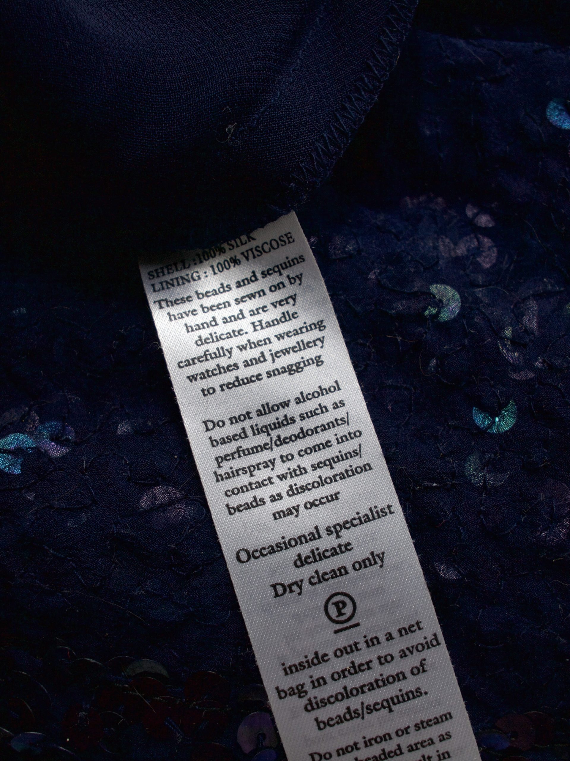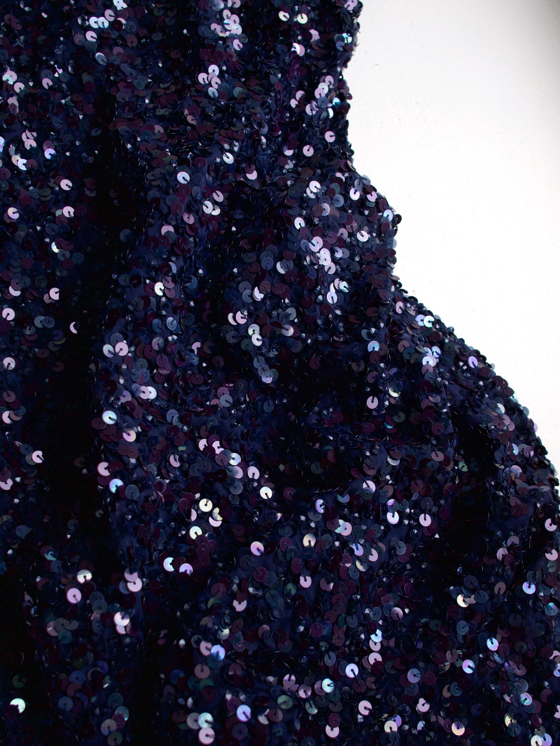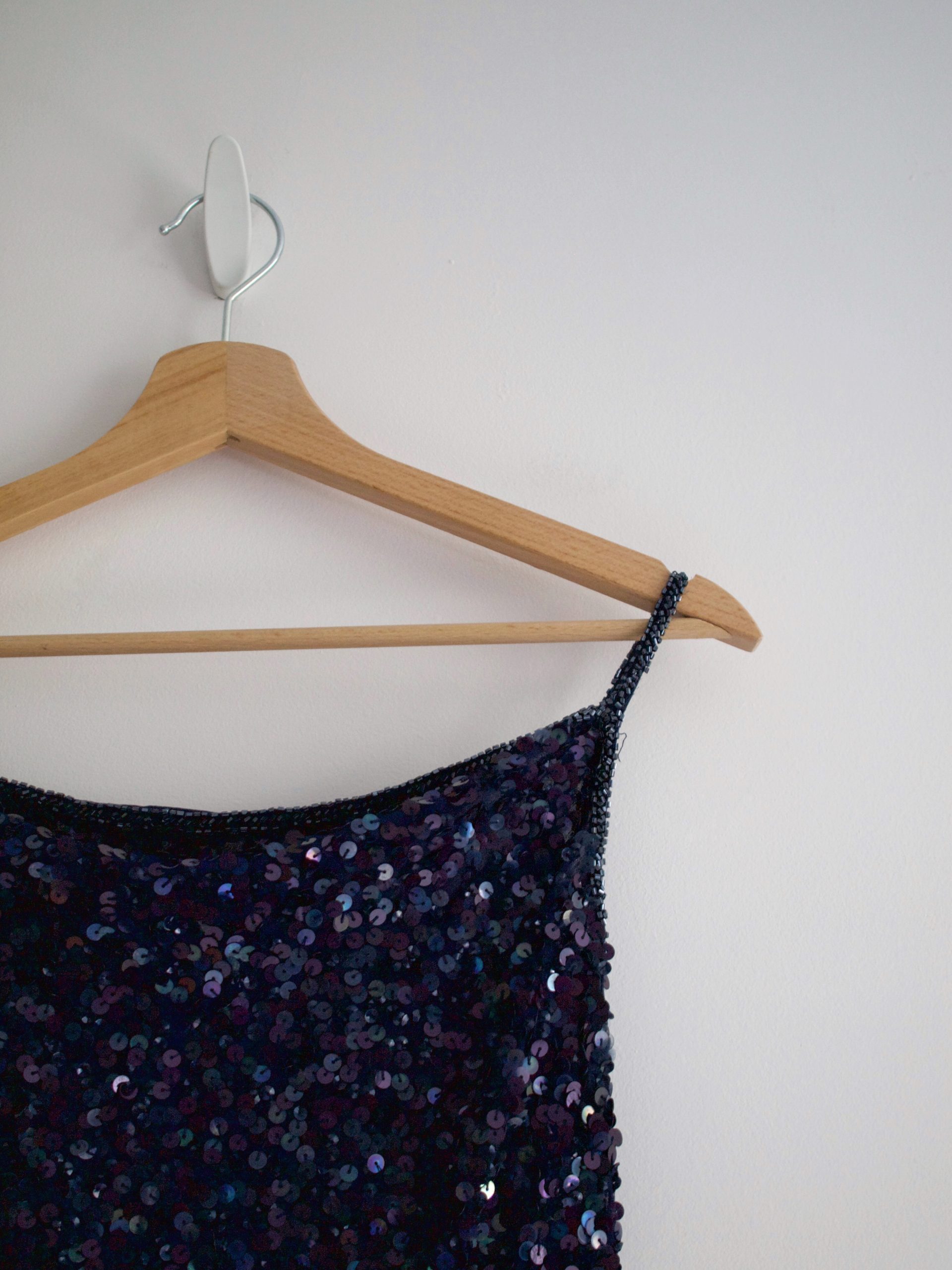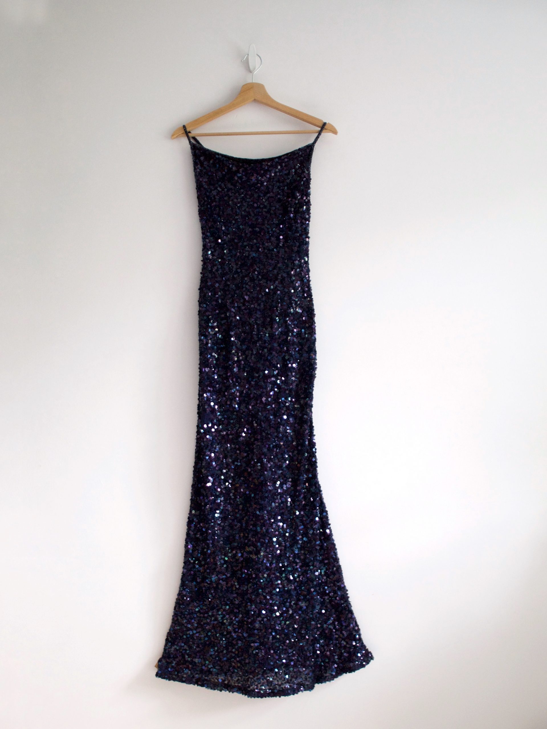 Unikatowa sukienka vintage, w 100% wykonana z jedwabiu, ręcznie zdobiona cekinami na całej powierzchni. Piękny kolor – sukienka mieni się i opalizuje w ruchu. Z tyłu zapinana na zamek, z podszewką. Polecam dla wysokiej osoby.