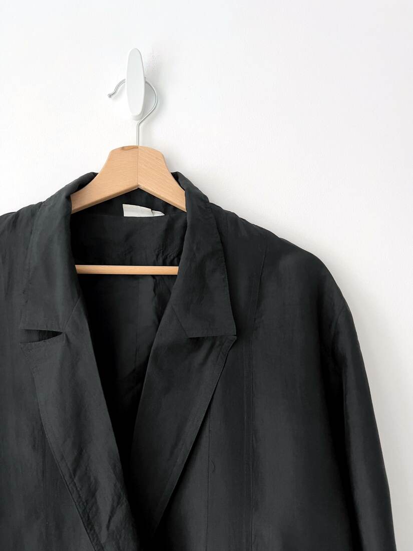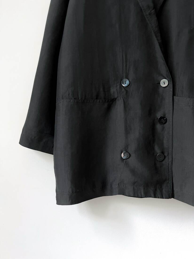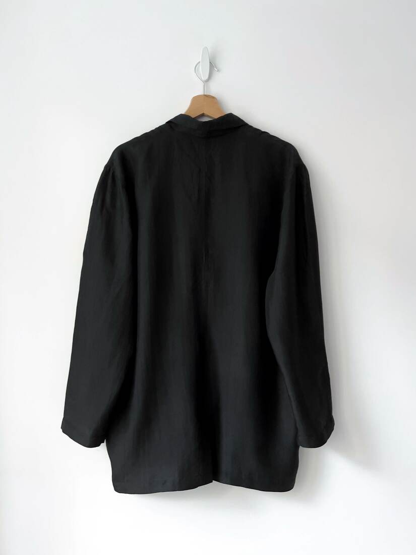 Lekki jedwabny żakiet. Rozmiar z metki 38, jednak jest bardzo, bardo luźny, więc polecam sugerować się wymiarami. Dwa guziczki są nadszczerbione, poza tym idealny stan.
