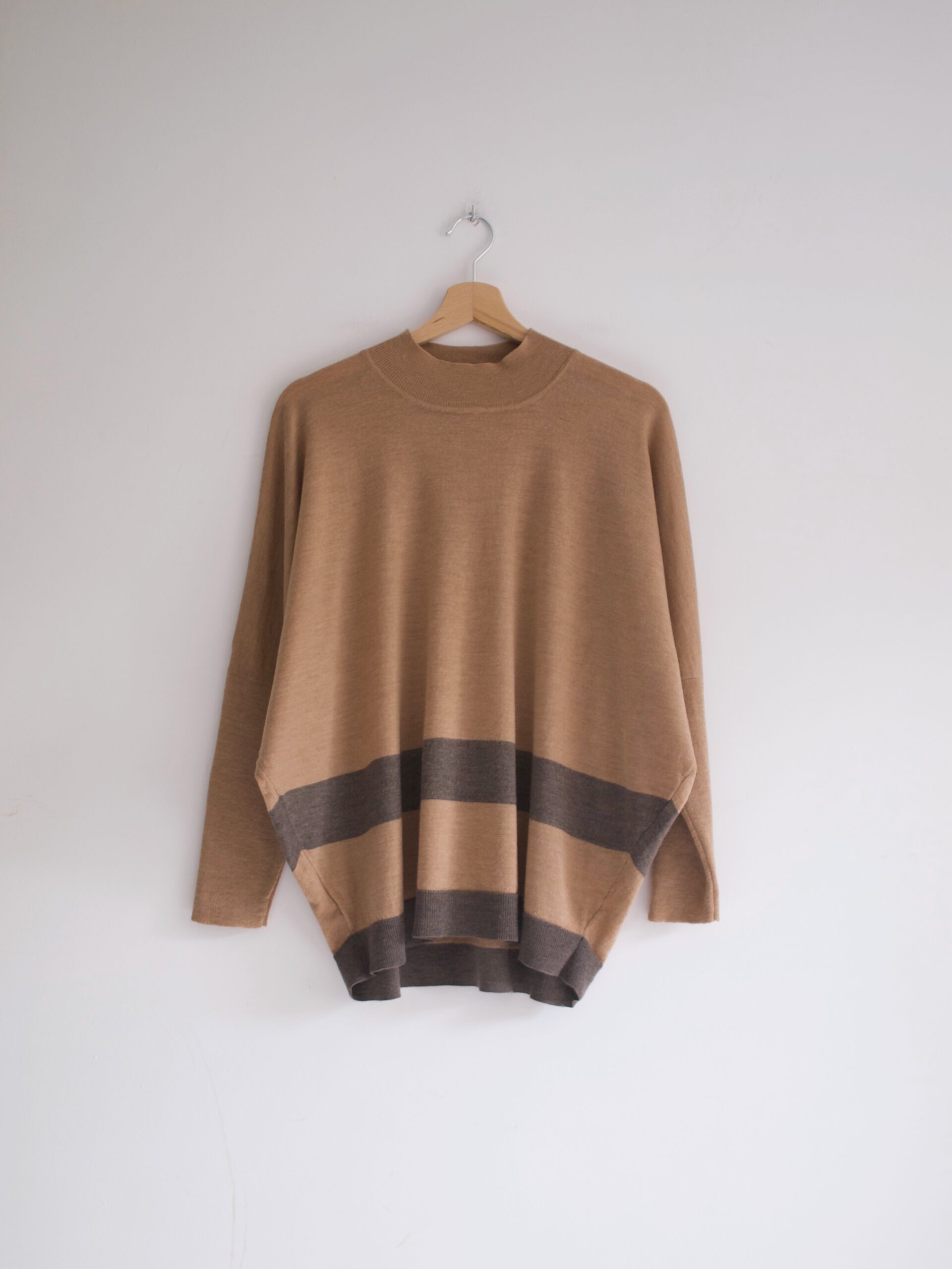 Minimalistyczny wełniany sweter z golfem. Idealny stan, materiał nie gryzie. Brak metki z rozmiarem, na oko jest to L, na mniejsze rozmiary idealny jako oversize (proszę sprawdzać wymiary).