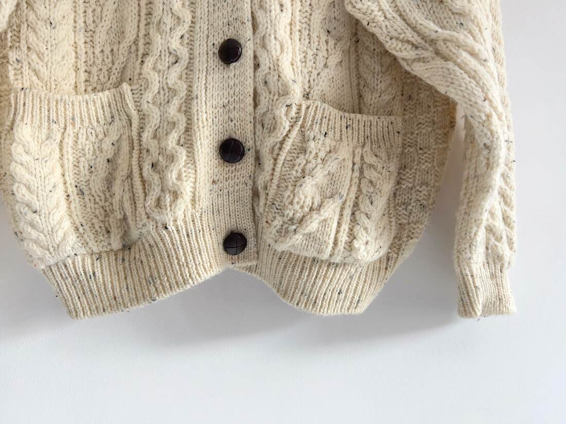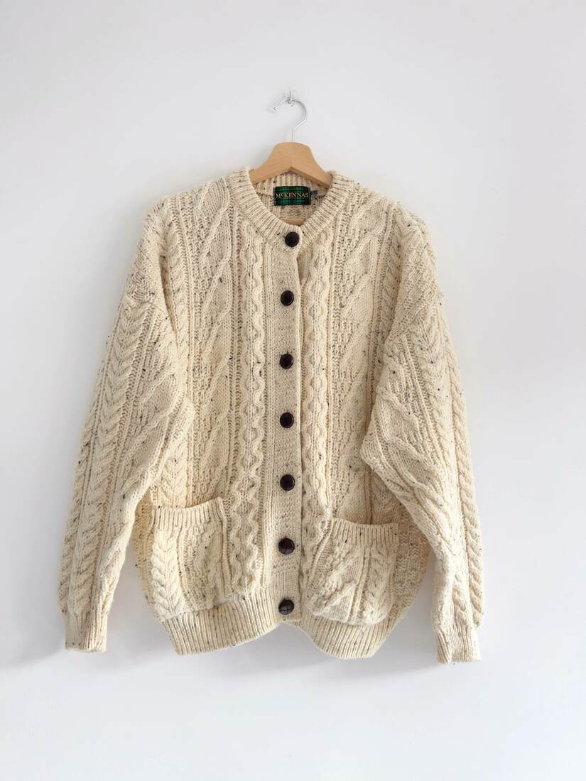 Gruby wełniany kardigan vintage. Rozmiar z metki S, bardzo luźny fason, więc będzie pasować również na M i L. Bardzo dobry stan. Skład: 100% wełna