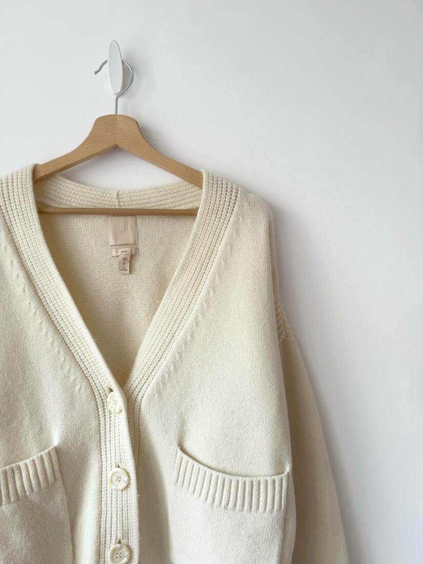 Gruby kardigan marki H&M, linia Premium. W 100% wykonany z wełny. Rozmiar z metki S, jednak fason jest bardzo luźny, więc będzie pasować również na M i L. Bardzo dobry stan.